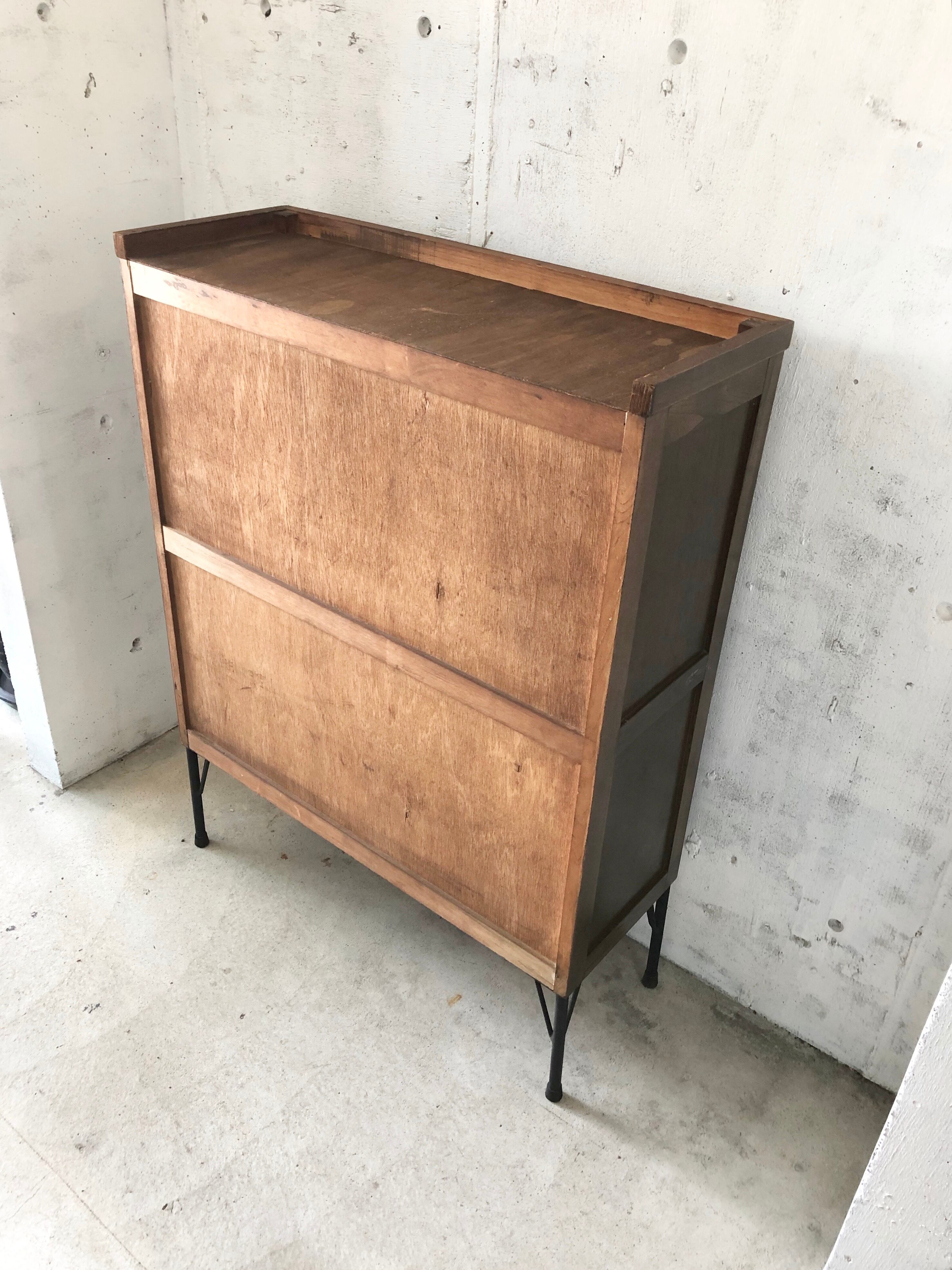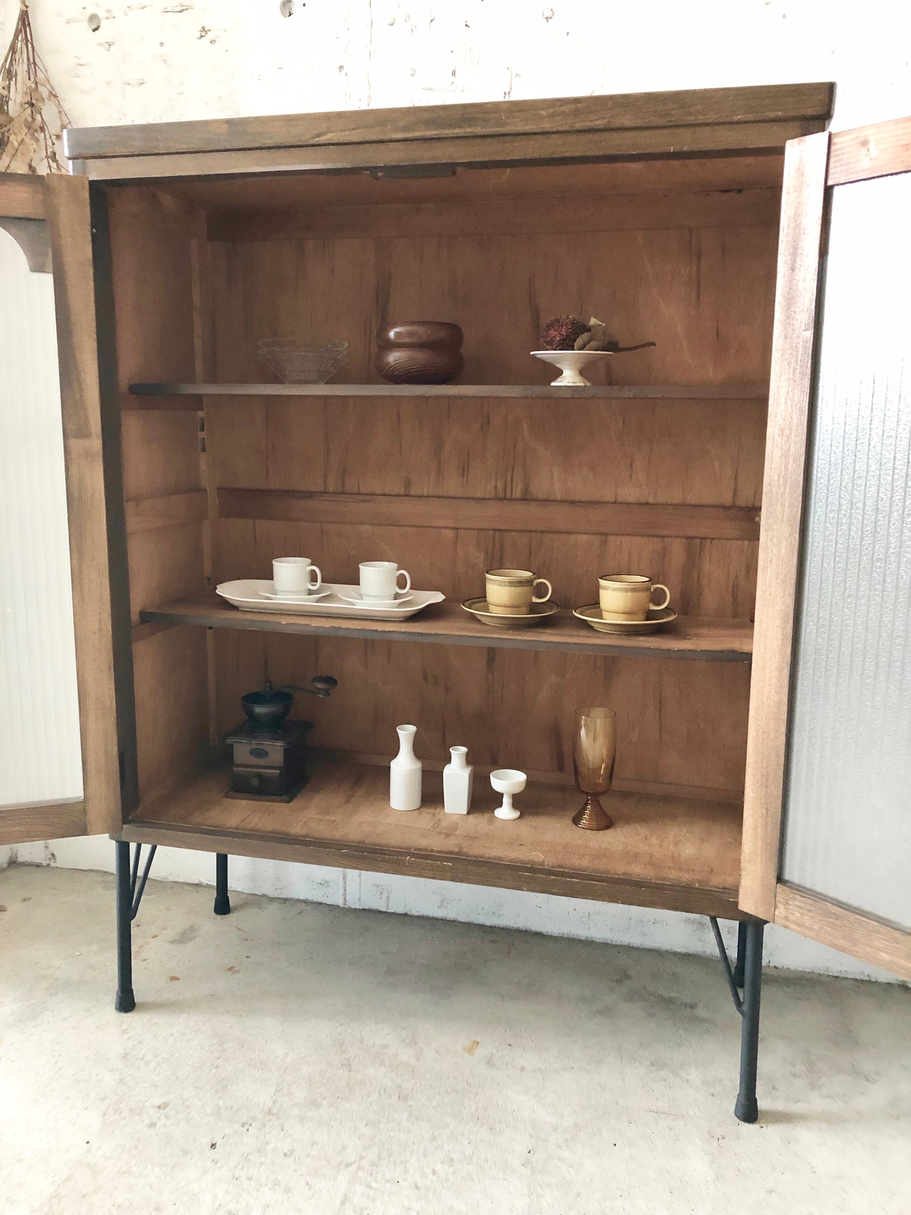 経年変化の使い込まれた深みは空間に落ち着きを与えてくれる鉄脚キャビネット。ガラス扉の収納はゆったりとしたスペースが3段あり、収納力も十分です。経年による傷などもありますが、ガラス扉の開閉も比較的スムーズに行え、使用上問題なくお使いいただけます。食器棚や小物、本、洋服などの収納棚として、毎日の暮らしの中で手元に置いてお役立てください。