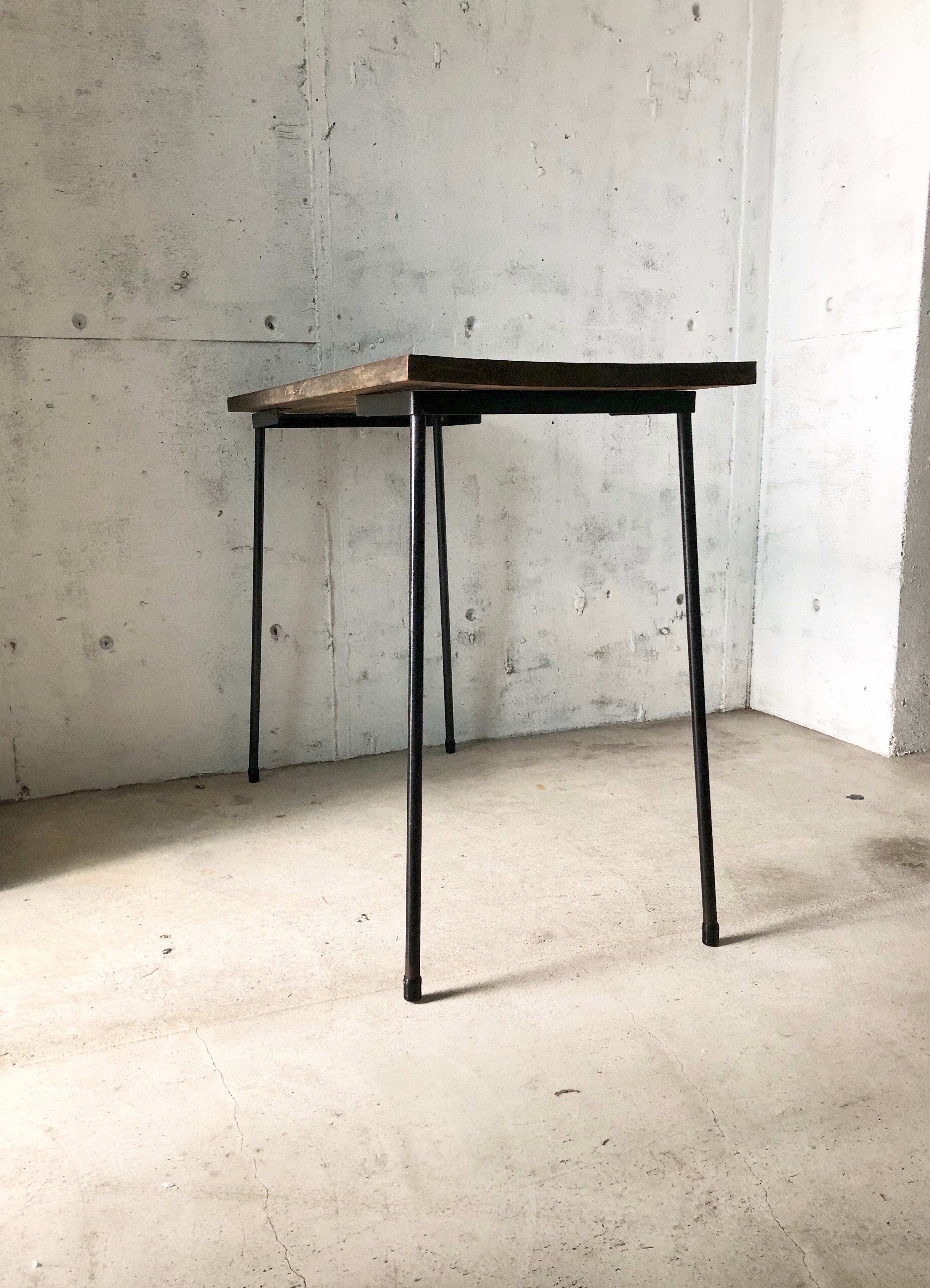 古材と古い鉄脚のテーブルになります。スレや欠け、当たりキズ、割れ、禿げ、サビ、落としきれない汚れなどがあります。少しのがたつきはありますが、全体的に状態も良いのでまだまだ実用的に活躍してくれます。