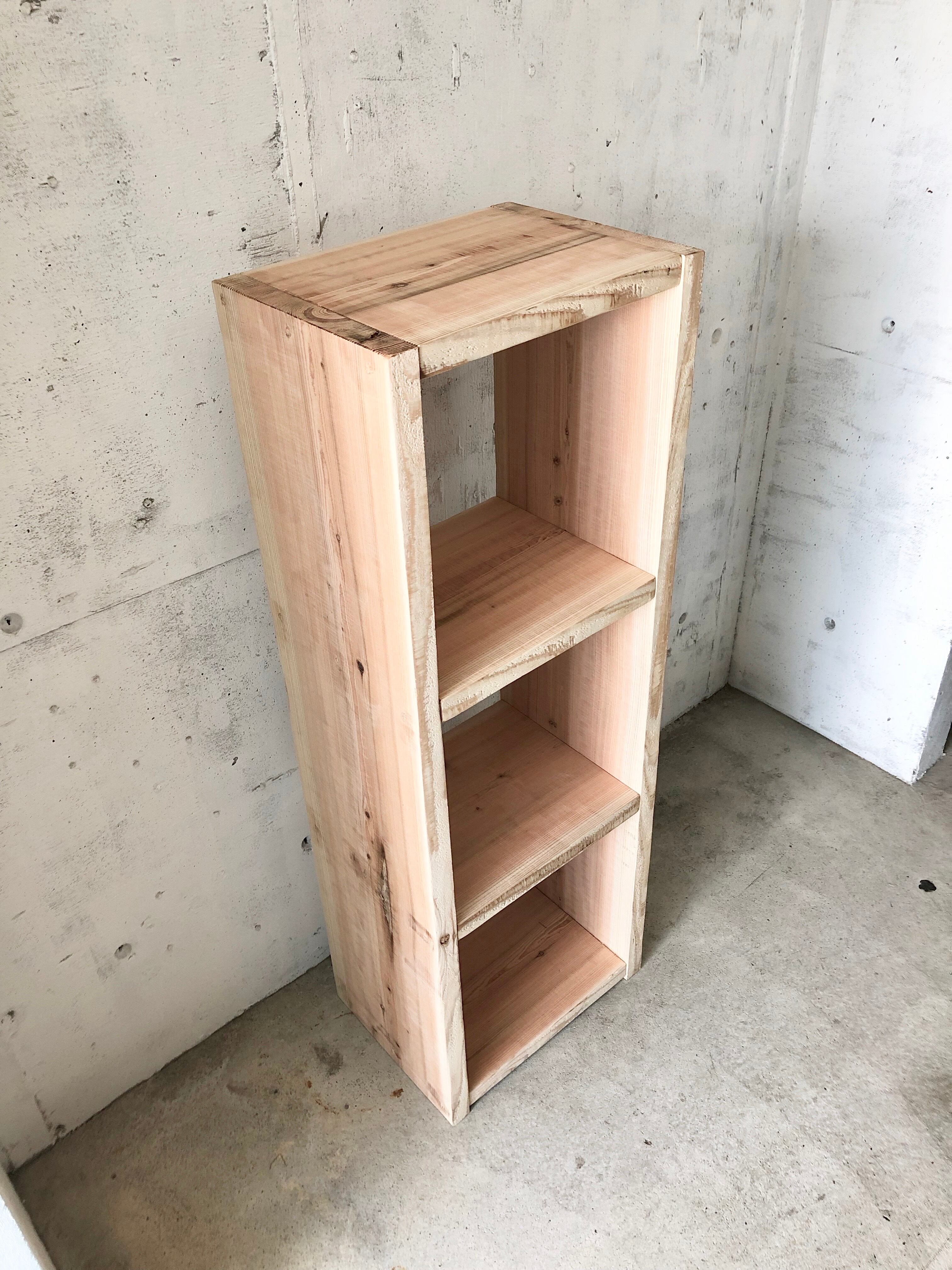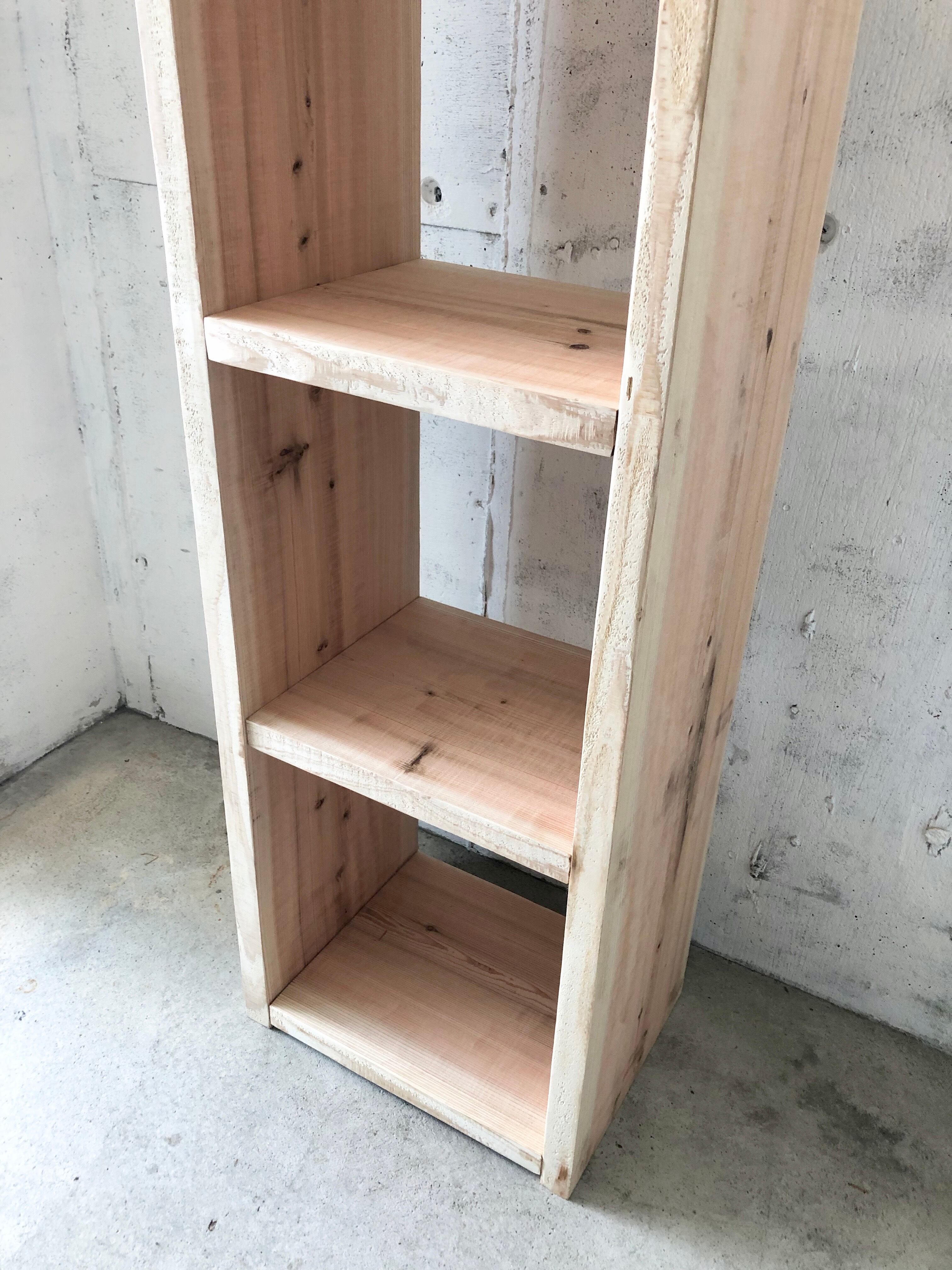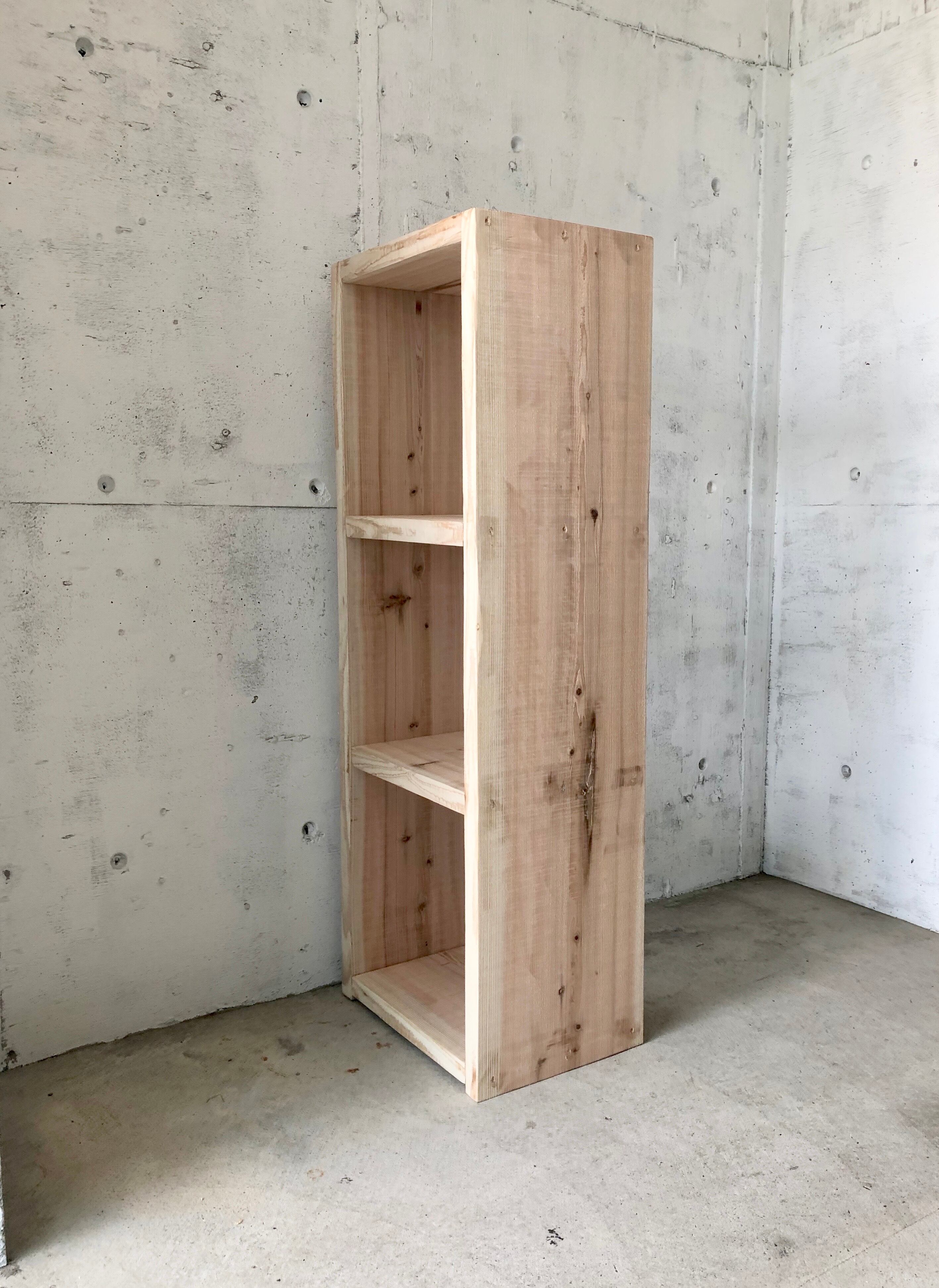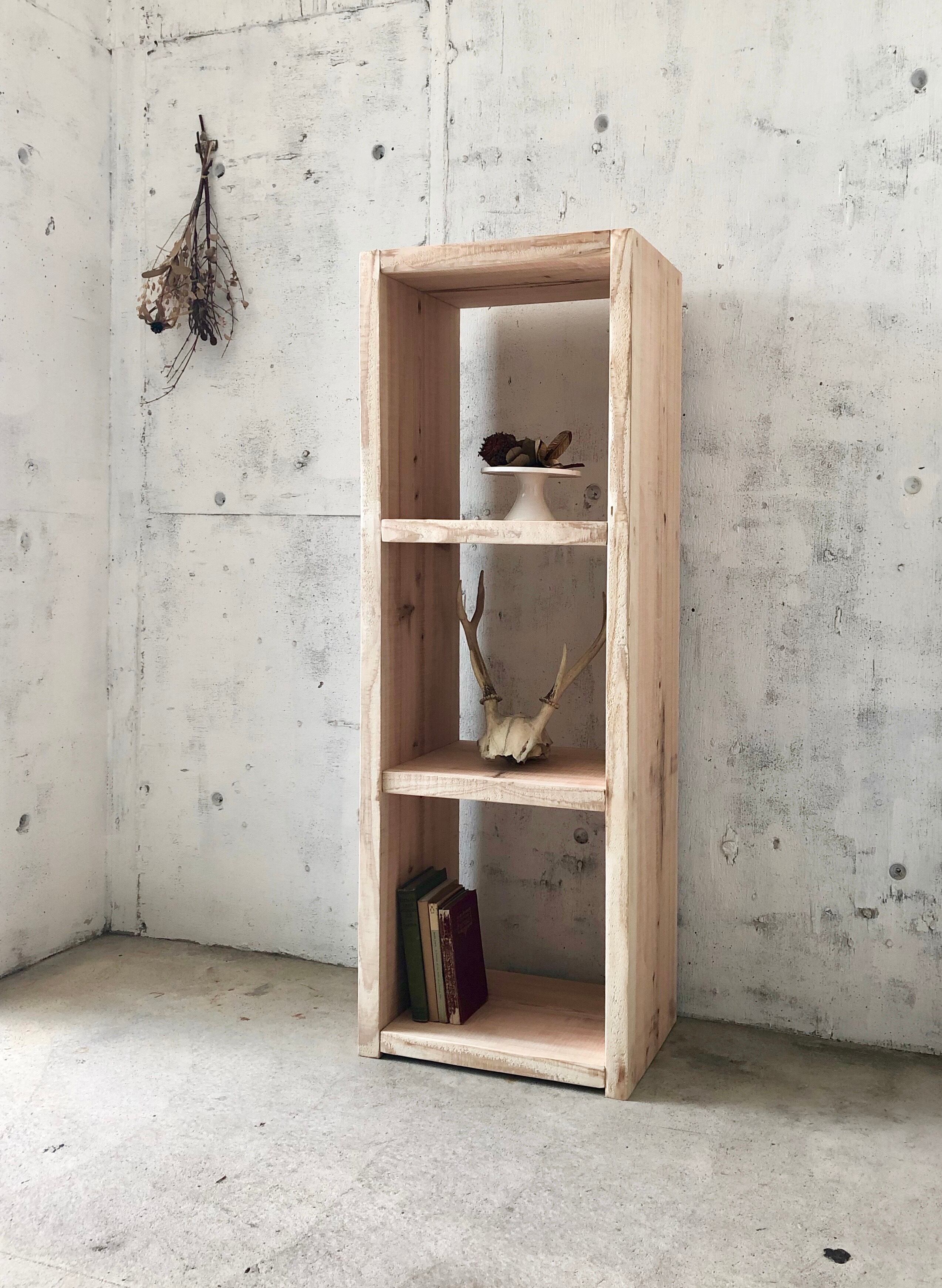 経年変化の雰囲気良い古材の風合い、すらっとした背のある姿が感じ良いシェルフ。奥行も深すぎず、使い勝手も良いです。本や小物、植物のディスプレイ棚としてや、キッチンで食材やお皿のストック棚、ショップさんのディスプレイ棚としても素敵です。横向けにしてテレビ台としてもお使い頂けそうです。