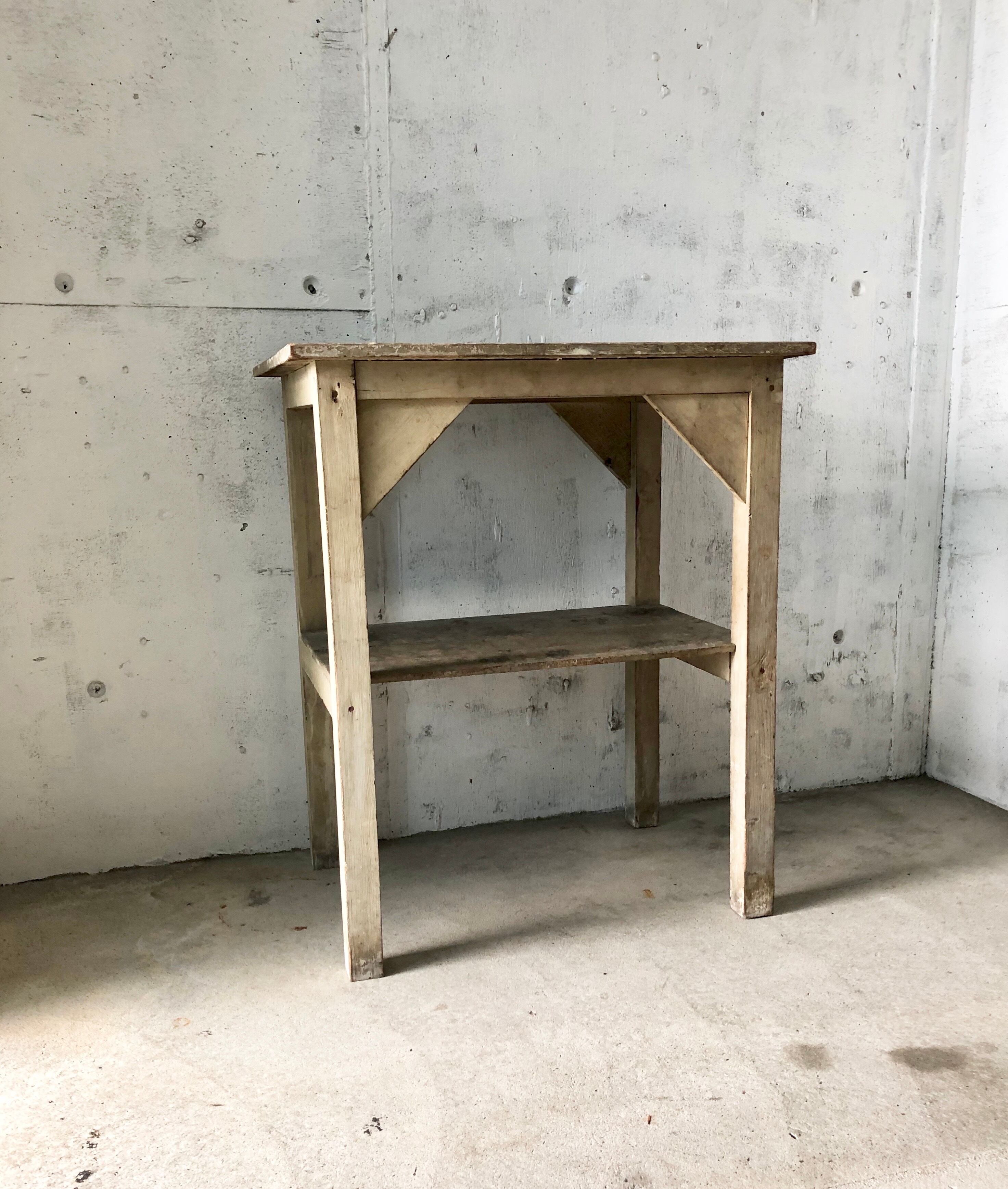 経年変化の雰囲気良い木肌、すっきりとした姿が感じ良い木製テーブル。天板下にはオープンラックがあるので使い勝手も良いです。実用使いで作業テーブル、ちょっと一息するコーヒーテーブルとして、店舗什器として商品のディスプレイやカフェ席のテーブルとしてもオススメの品です。