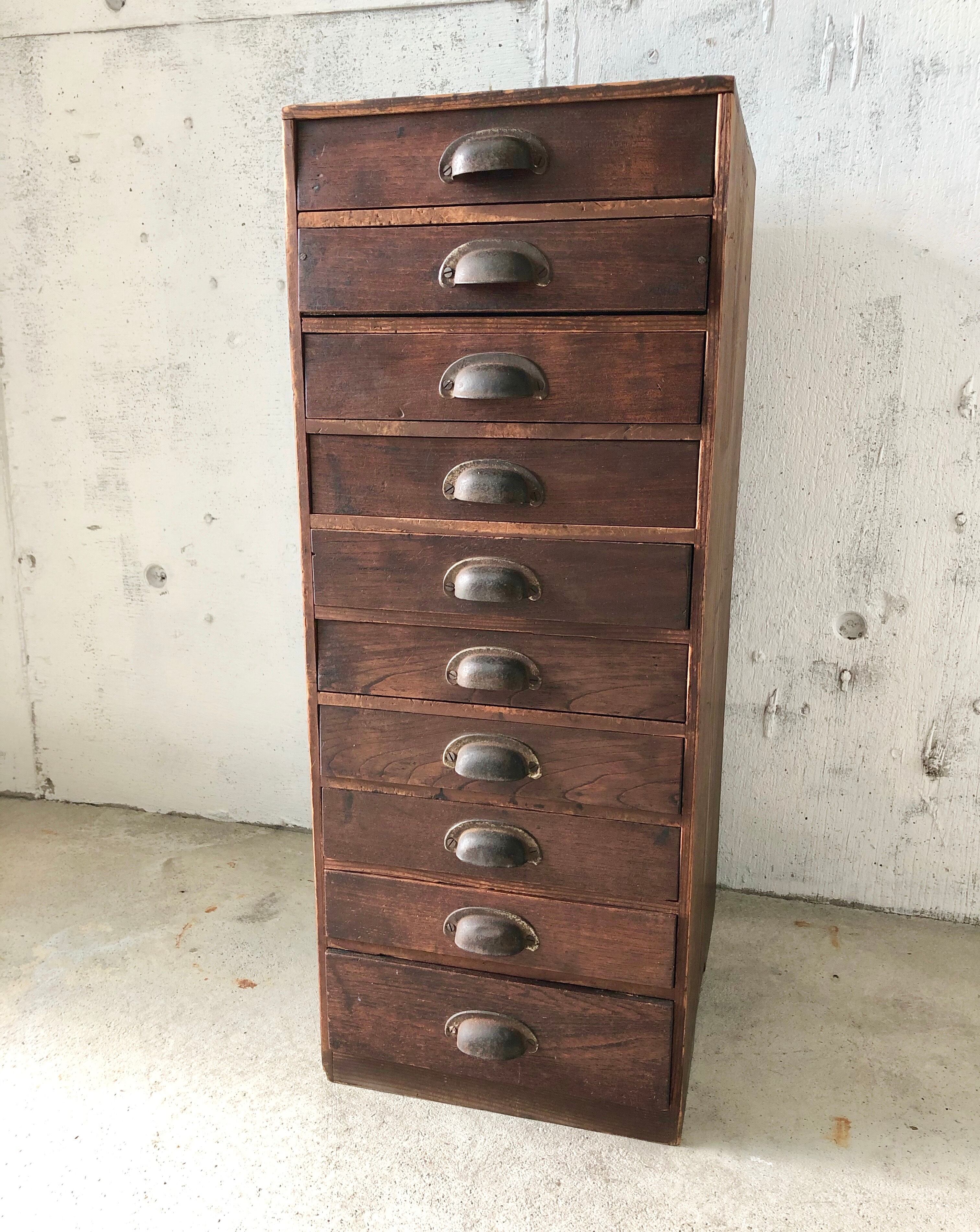 経年変化の味のある木肌と取手が雰囲気の良い収納棚。10杯の引出しが綺麗に並んだ素敵な佇まいです。引出し中は少し汚れがありますが、状態は良いです。リビングや作業スペース、趣味部屋で紙物、書類、パーツ、細々したものなどの収納棚としても活躍してくれそうです。