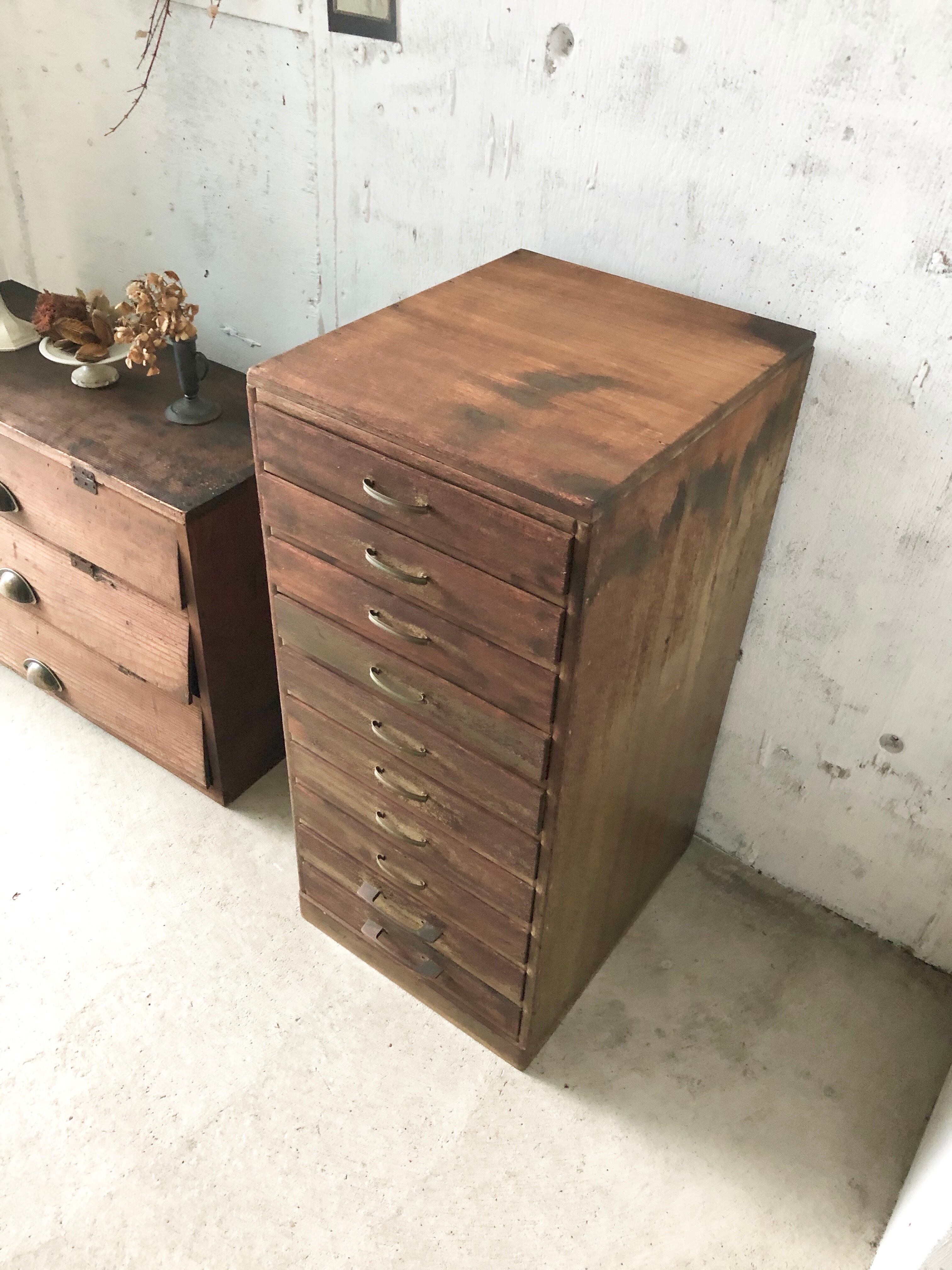 経年変化の味のある木肌と取手が雰囲気の良い収納棚。10杯の引出しが綺麗に並んだ素敵な佇まいです。引出し中は少し汚れがありますが、状態は良いです。リビングや作業スペース、趣味部屋で紙物、書類、パーツ、細々したものなどの収納棚としても活躍してくれそうです。
