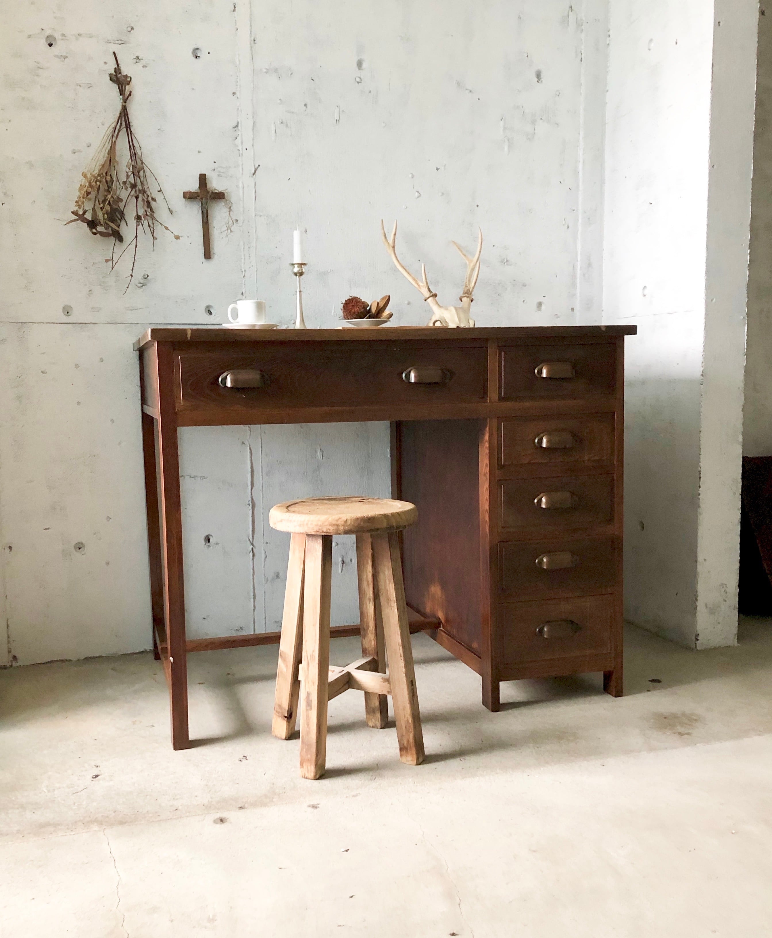 経年変化の雰囲気の良い木肌と取手、上品な佇まいが感じ良い木製デスク。深さのある引出しが6杯あり、収納力もたっぷりです。実用使いで作業テーブル、パソコンテーブルとしてやお子さんの勉強机としても素敵にお使いいただけそうです。