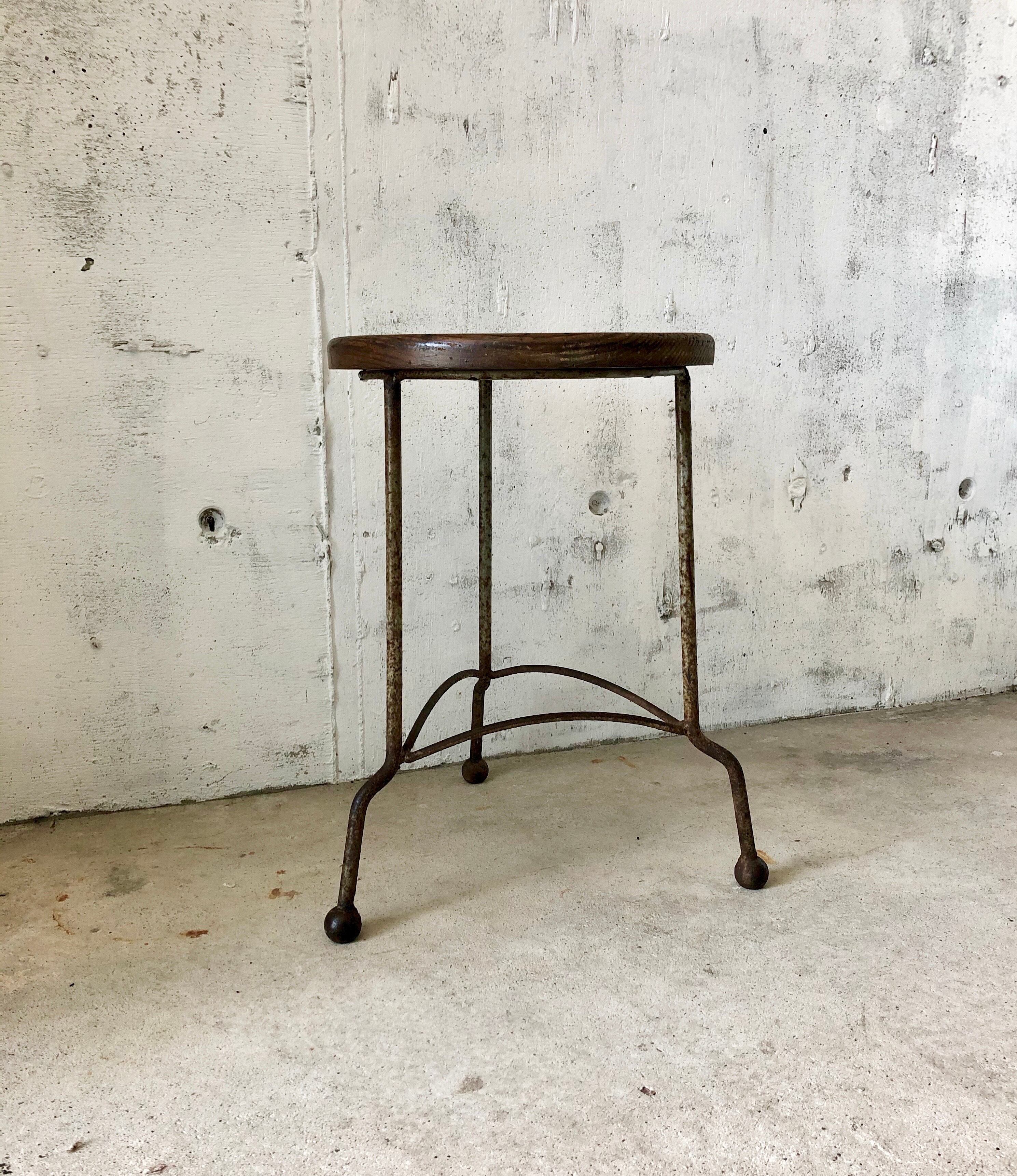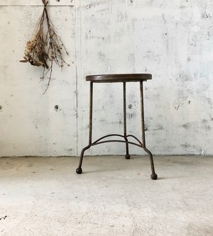 経年変化の味のある丸座面と雰囲気の良いアイアン脚が感じ良いスツール。個性のあるアイアン脚も魅力的です。少しのがたつきはありますが、状態は良いです。実用使いでテーブルの椅子、キッチンや玄関先の腰掛け椅子としてや、植物を飾るディスプレイ台としても感じ良さそうです。