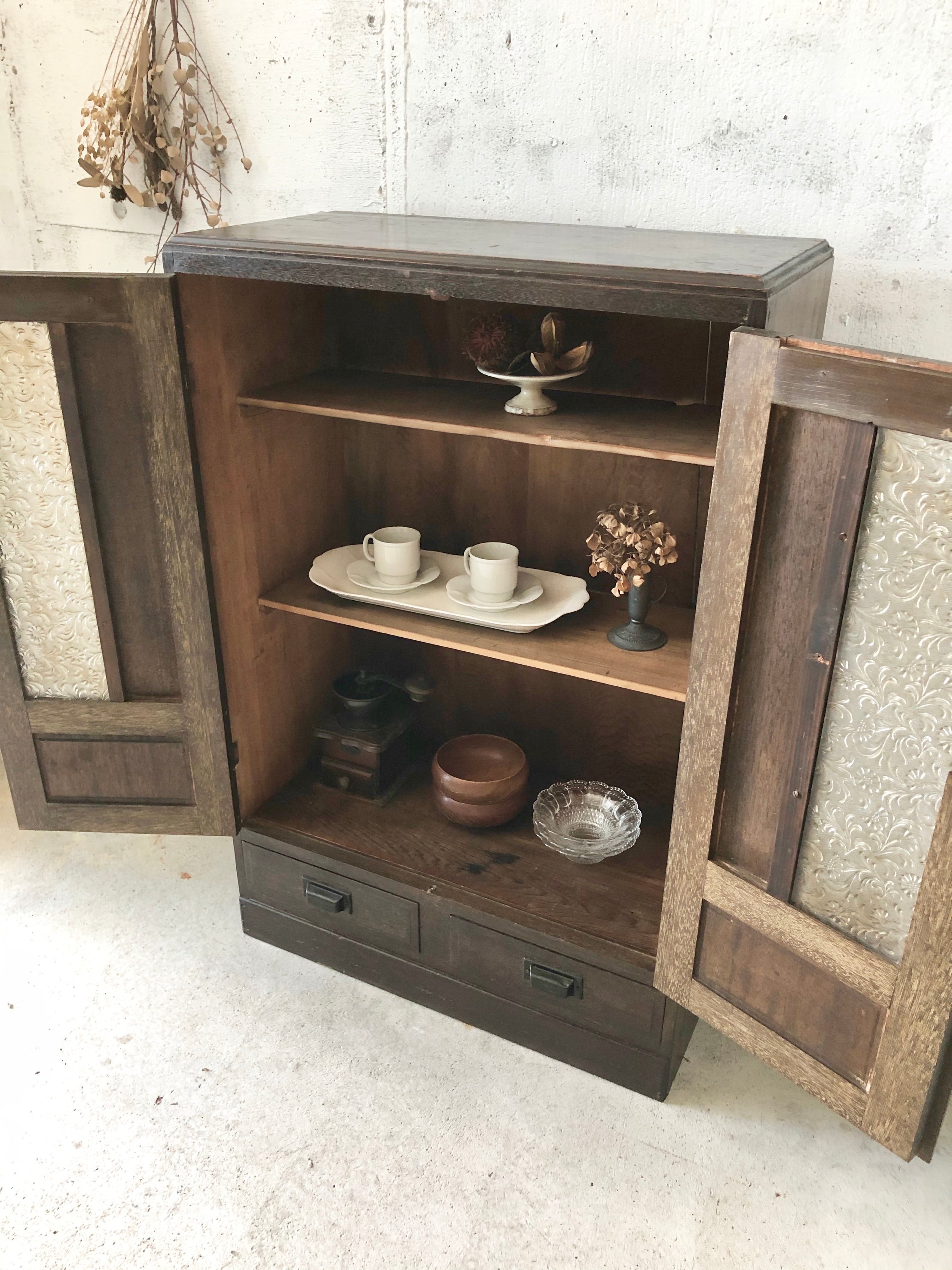 経年変化の落ち着きのある木肌、上品な佇まいが雰囲気の良い収納棚。ガラス扉の収納と2杯の引き出しがあり、収納力も十分です。経年による傷などもありますが、ガラス扉、引出しの開閉も比較的スムーズに行え、使用上問題なくお使いいただけます。食器棚や小物、本などの収納棚として、毎日の暮らしの中で手元に置いてお役立てください。
