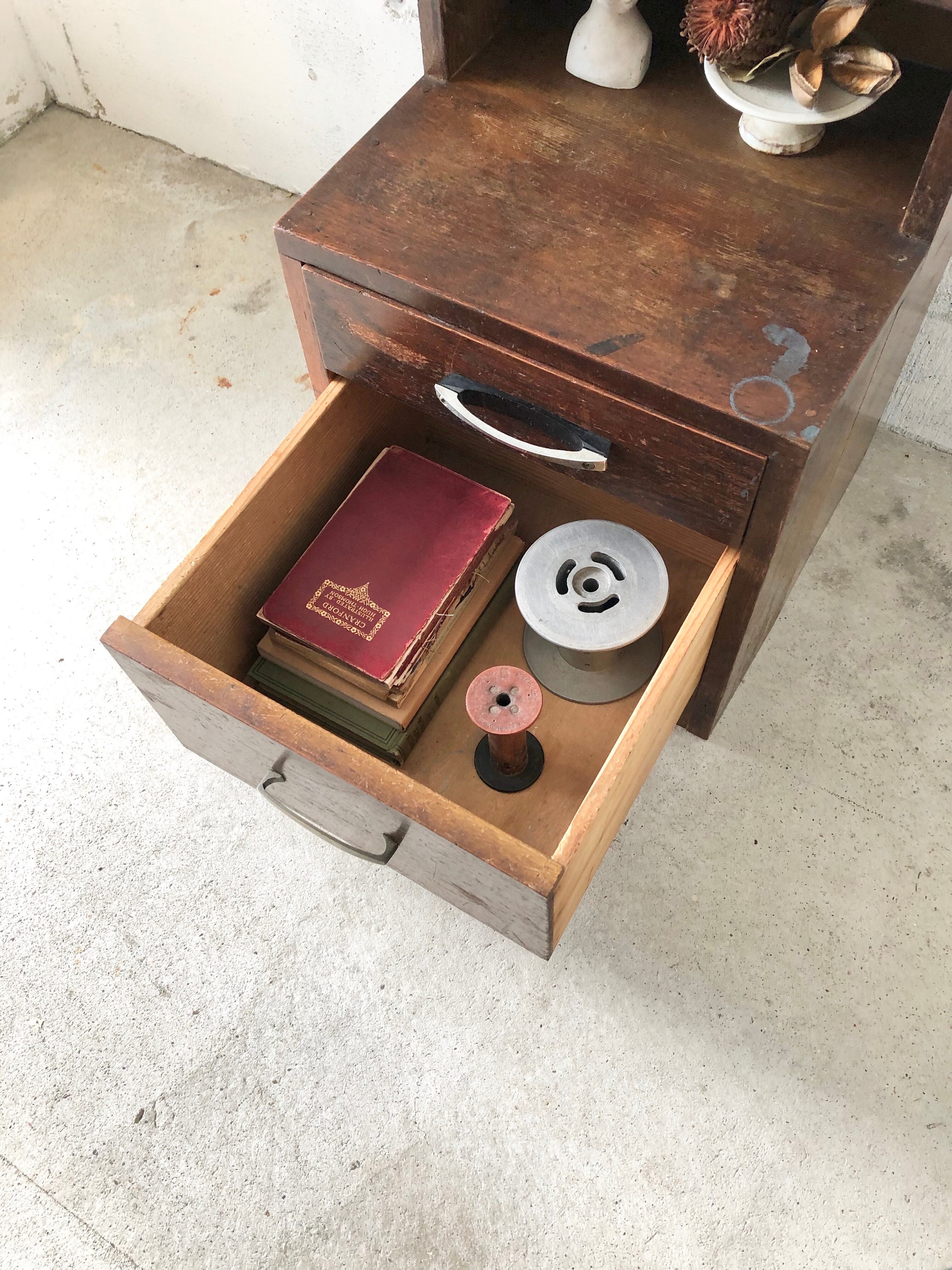 経年変化の味のある木肌と取手、個性のある姿が感じ良い収納棚。引出しの開閉はスムーズに行え、飾り台があるので使い勝手も良いです。リビングや趣味部屋、子供部屋で小物や本、おもちゃの収納などとしても素敵にお使い頂けそうです。