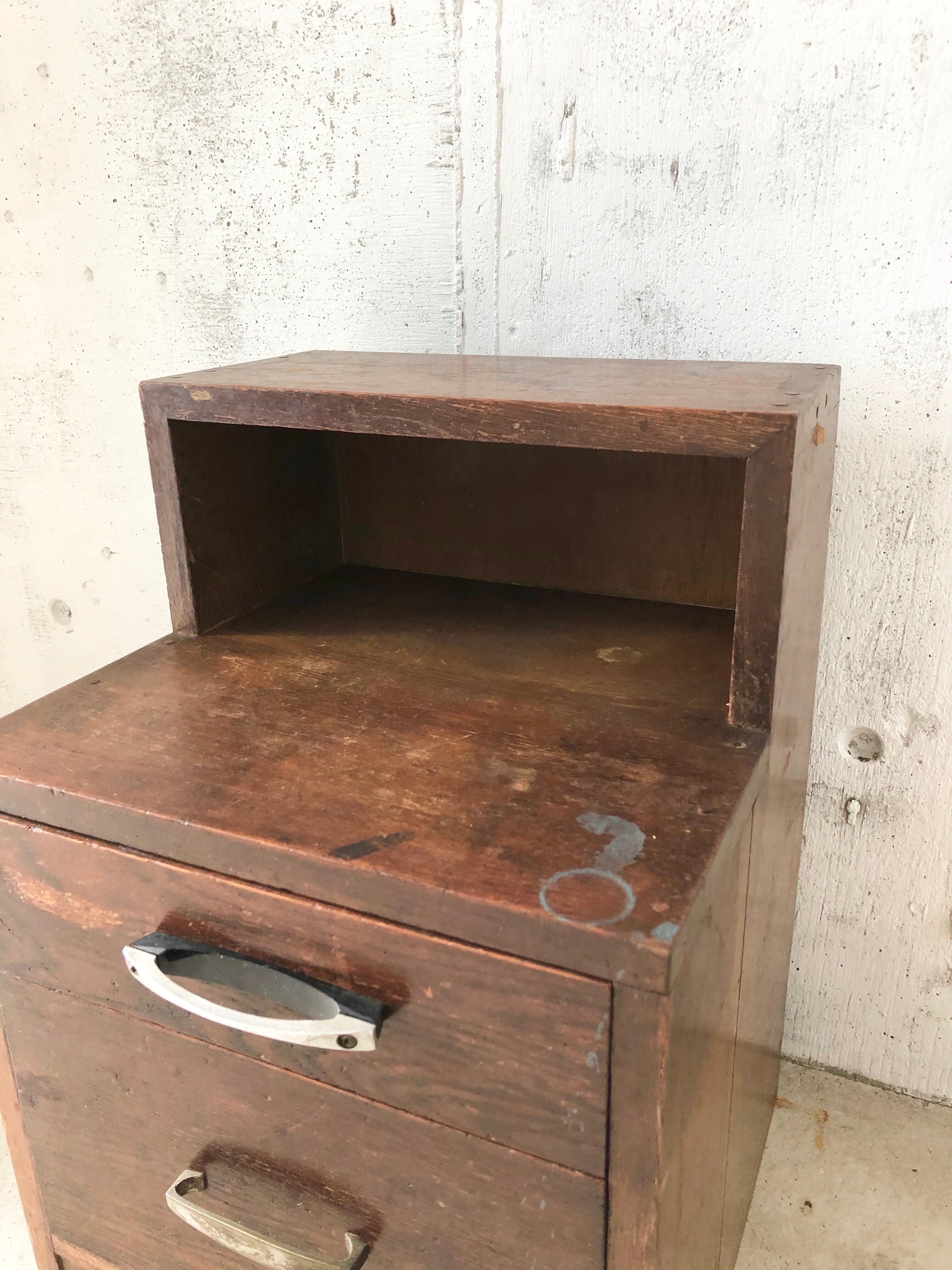 古い収納棚になります。スレや当たりキズ、欠け、割れ、サビ、隙間、剥げ、落としきれない汚れなどがあります。引出しの開閉はスムーズに行えます。全体的に状態も良いのでまだまだ実用的にお使いいただけます。