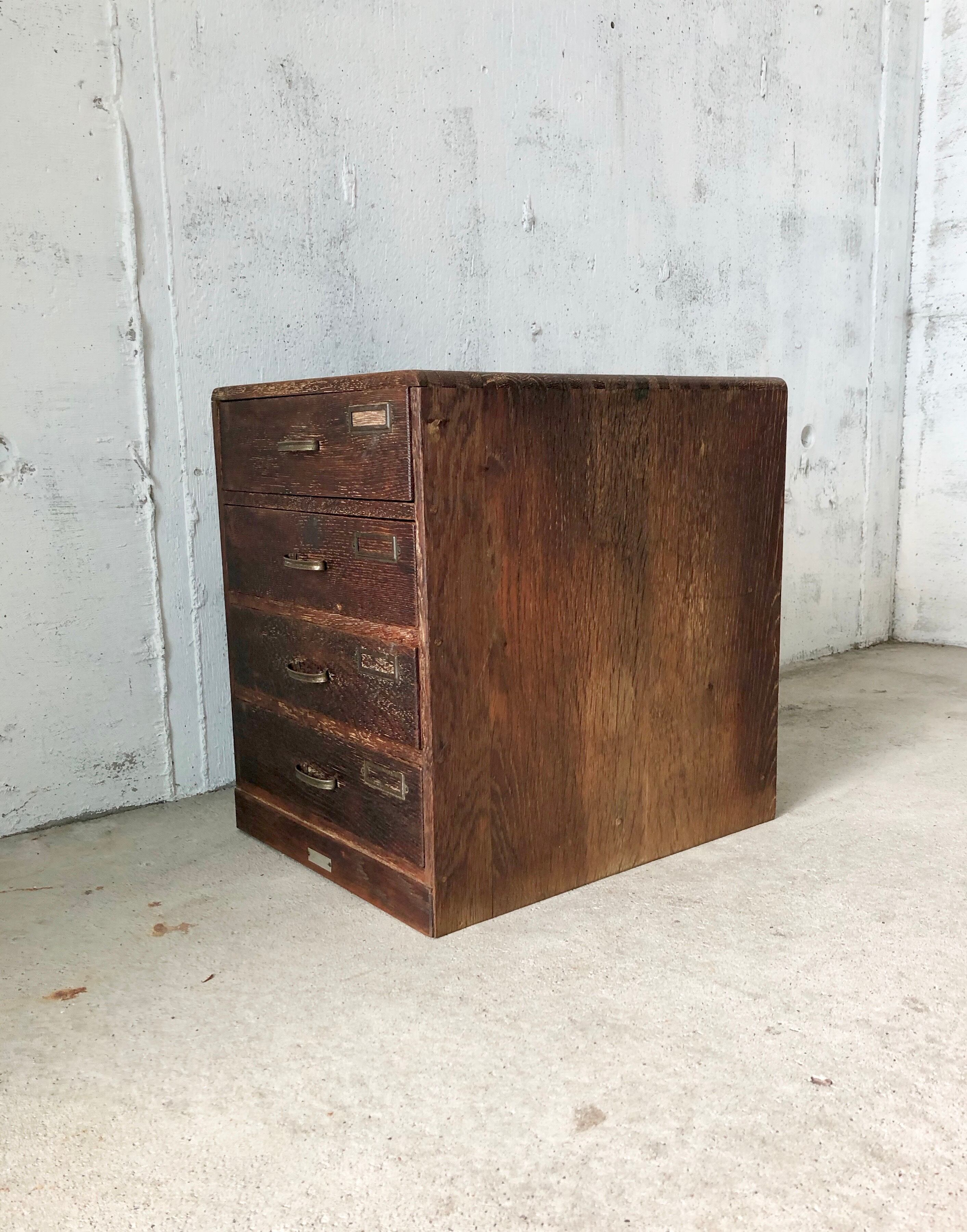 経年変化の雰囲気の良い木肌、味のある取手が感じ良い小引き出し。引出しにはネームプレートが付いているので、仕分けにも便利。お部屋のカウンター上やリビング、作業場などの卓上で細々したものやステーショナリーの整理に活躍してくれそうです。