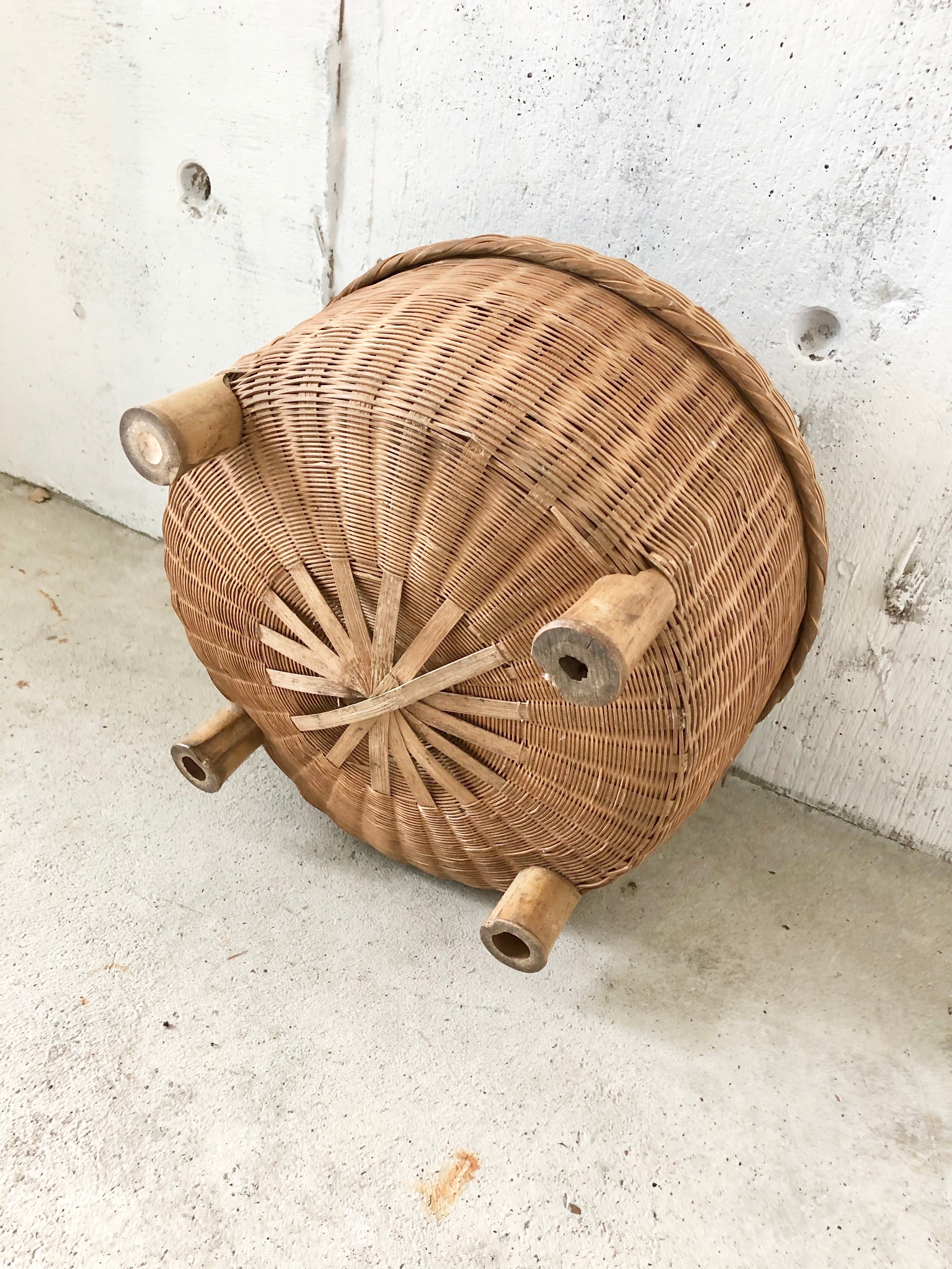 経年変化の使い込まれた良い雰囲気、脚のある姿が感じ良い蓋付きの藤かご。特に目立つダメージもなく、状態は良いです。キッチンやカウンター上、棚上でフルーツや野菜入れとしてや、リビング、子供部屋で小物やおもちゃ入れとしても素敵にお使い頂けそうです。