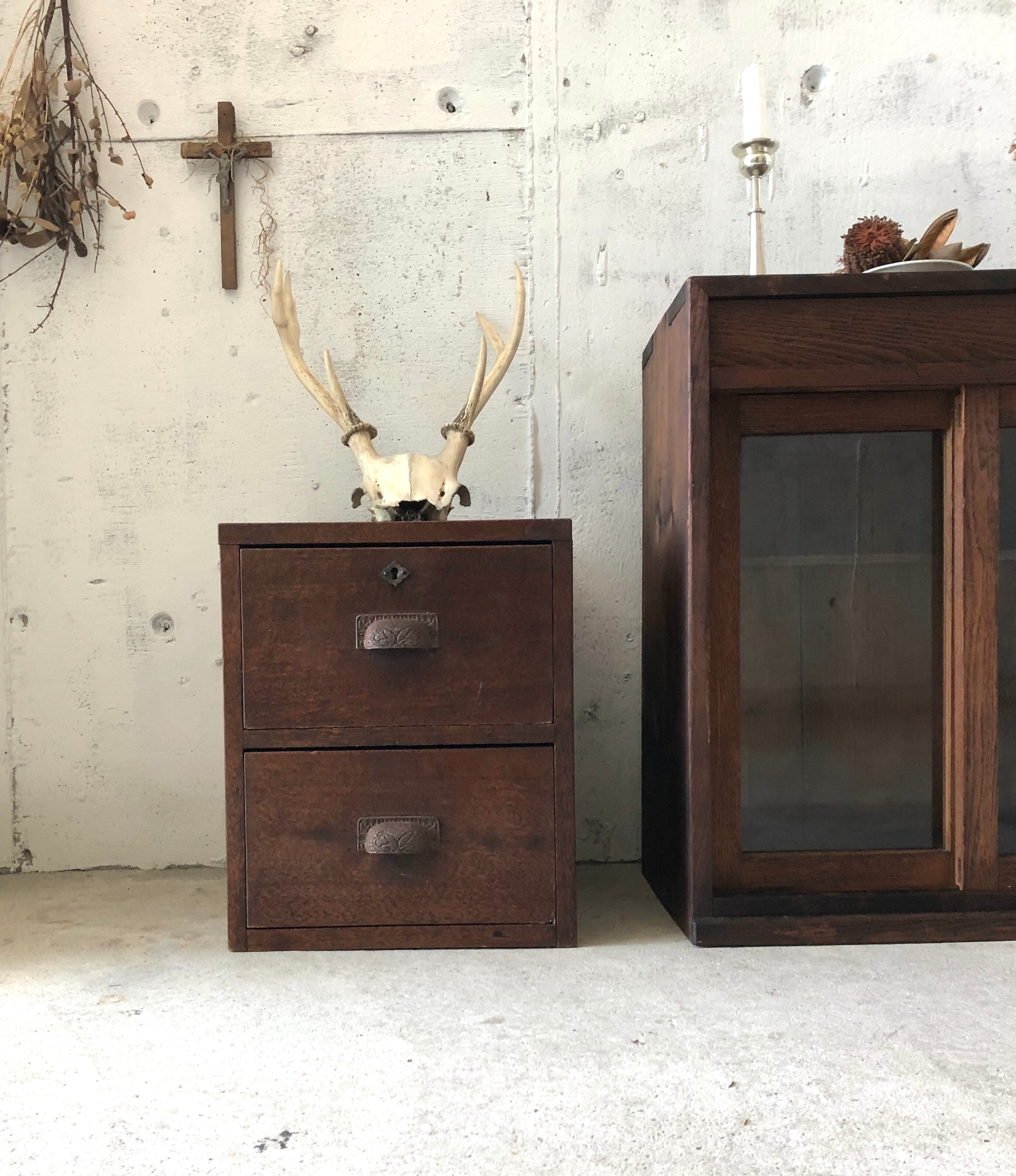 経年変化の味のある木肌と取手、上品な佇まいが感じ良い収納棚。収納は深さのある引出しが2杯あり収納力は十分です。リビングや趣味部屋、子ども部屋で小物やおもちゃの収納としても素敵です。