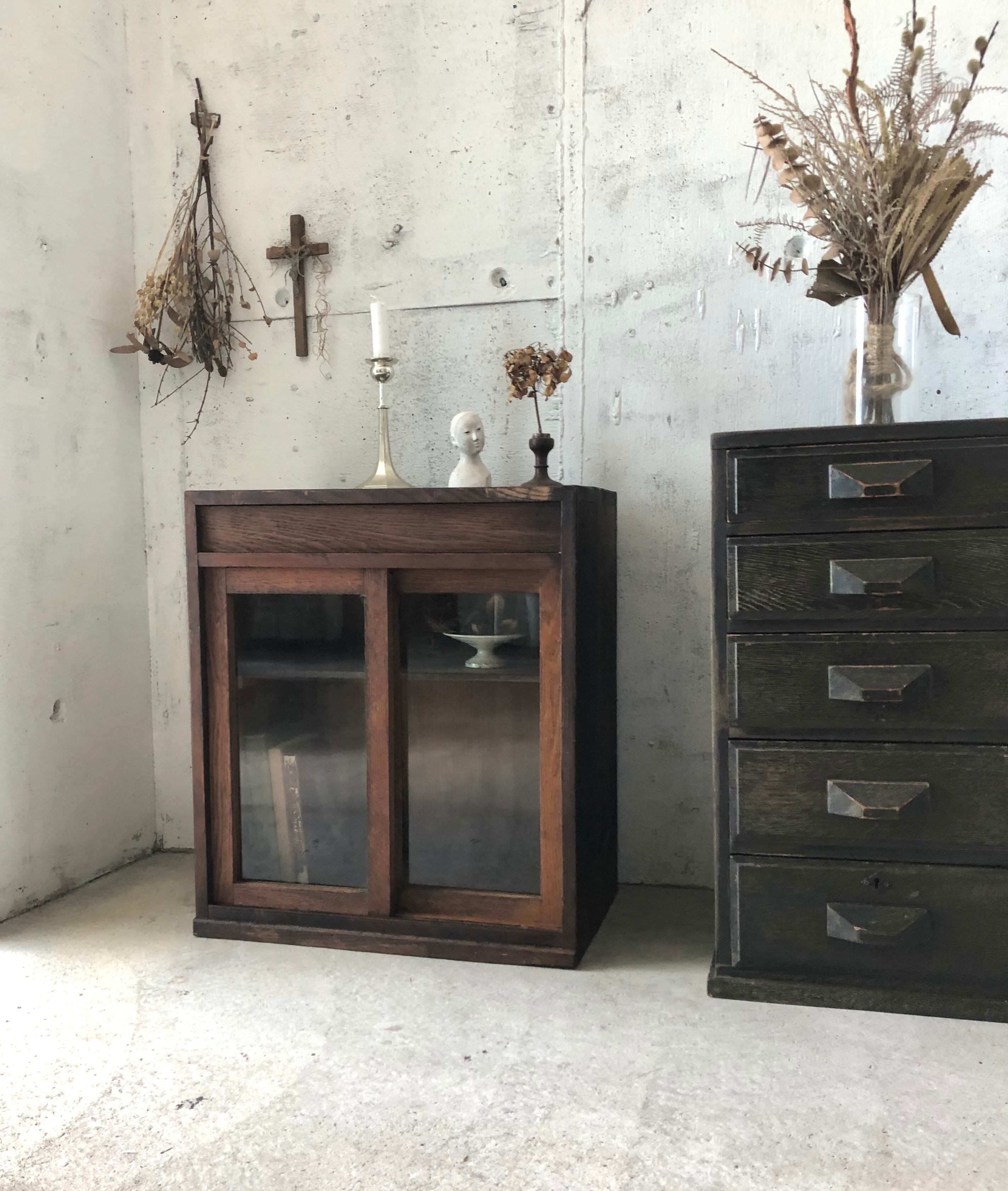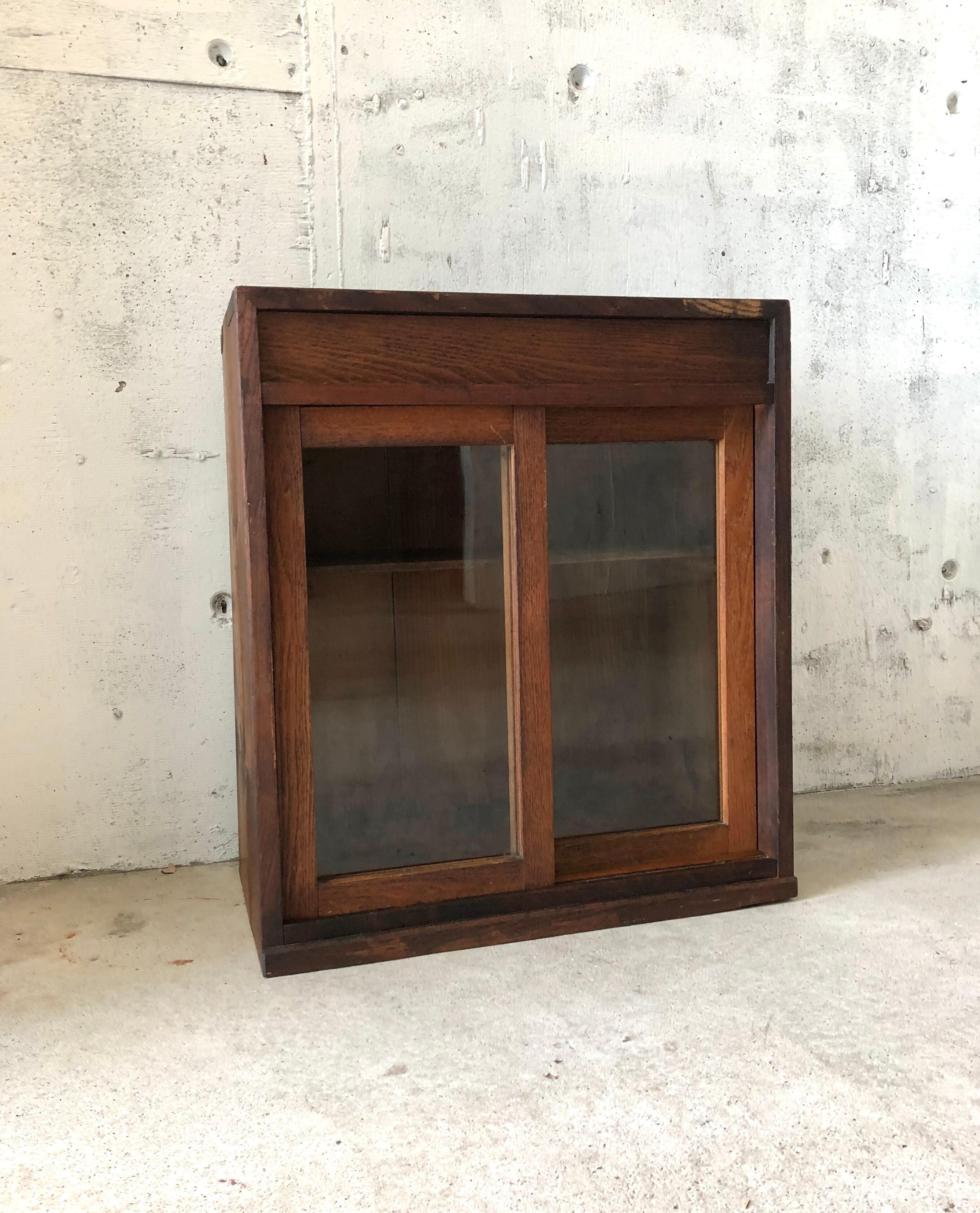 経年変化の味のある木肌とガラス引戸が感じ良い収納棚。ガラス引戸の開閉は比較的スムーズに行えます。リビングや作業部屋で書類や紙物、小物の収納としてや、キッチンで小皿や調味料のストック棚としても素敵にお使い頂けそうです。