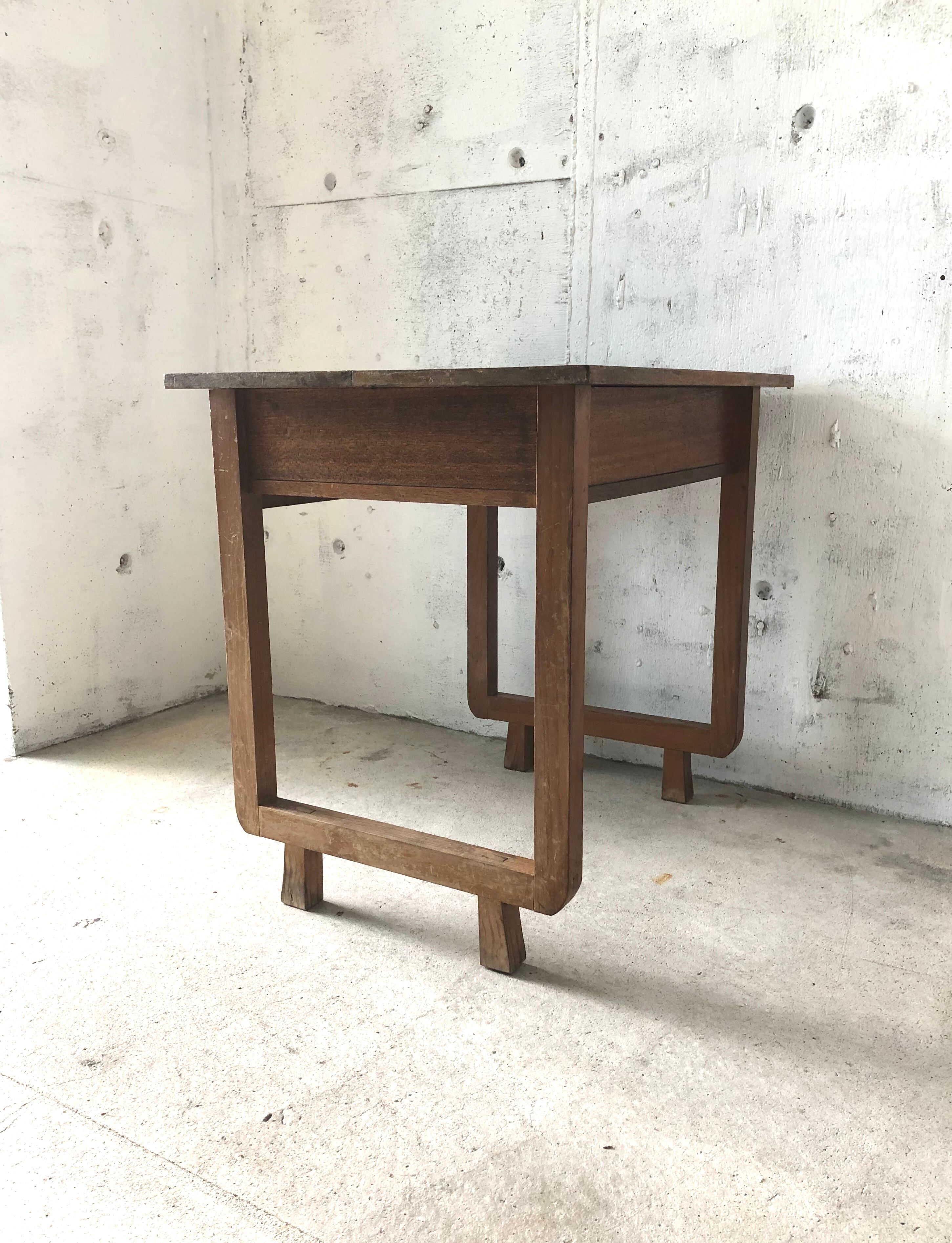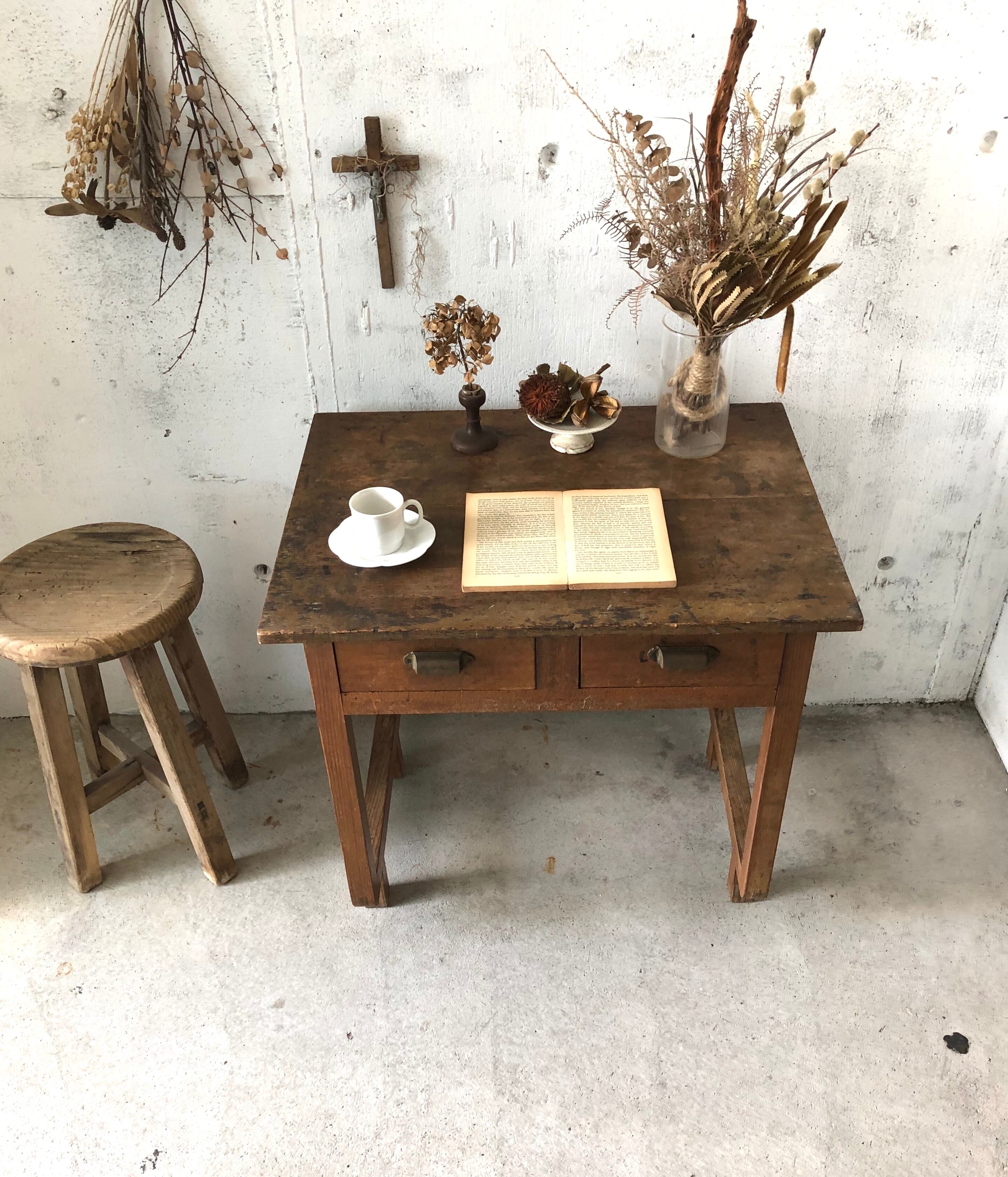 経年変化の雰囲気良い木肌と取手、個性のある脚が感じ良いローデスク。少しのがたつきはありますが、引出しの開閉はスムーズに行えます。ソファテーブルとしてやカフェテーブル、お子さん用の机やお気に入りの小物や植物を飾る台としても素敵です。