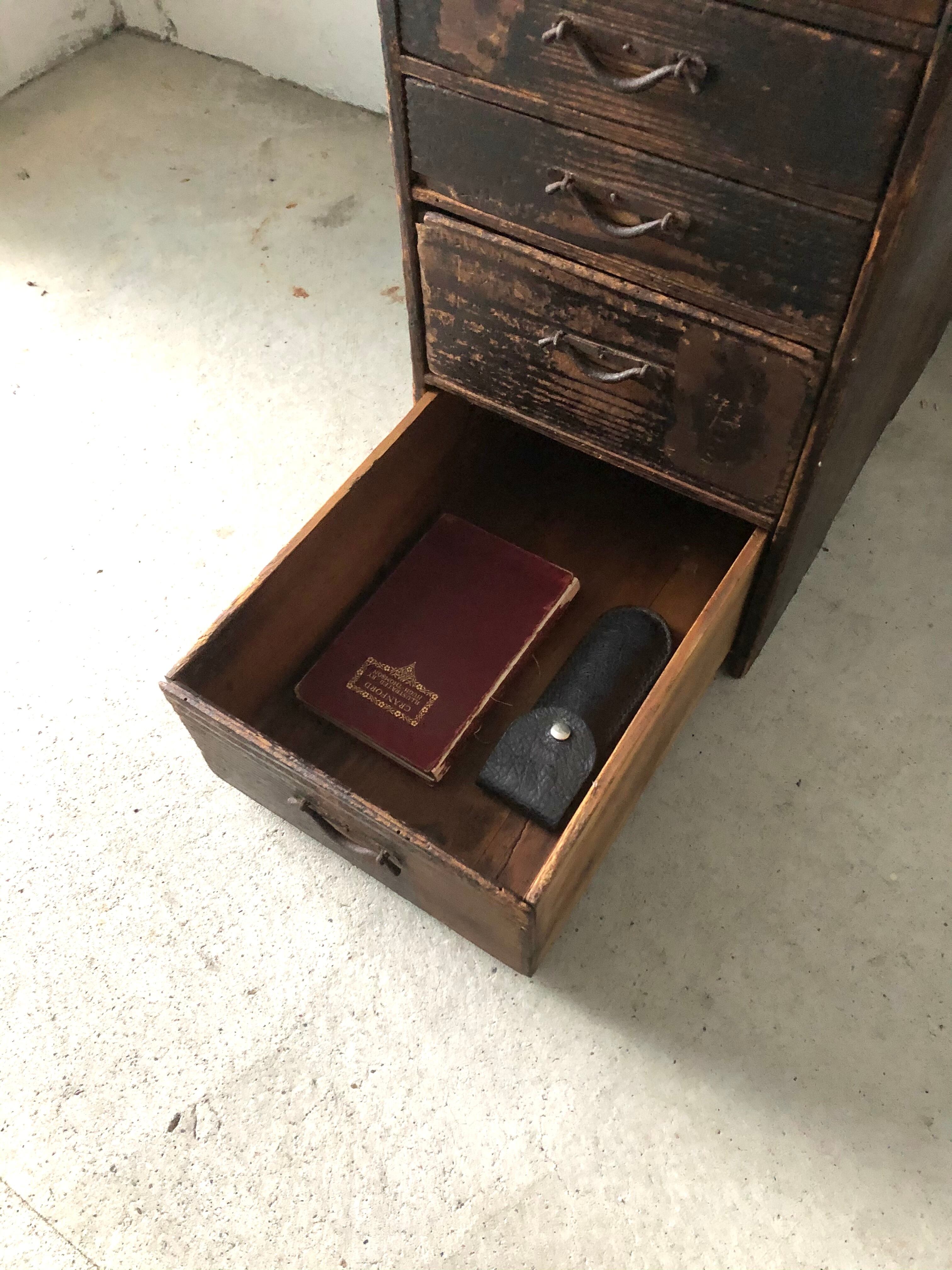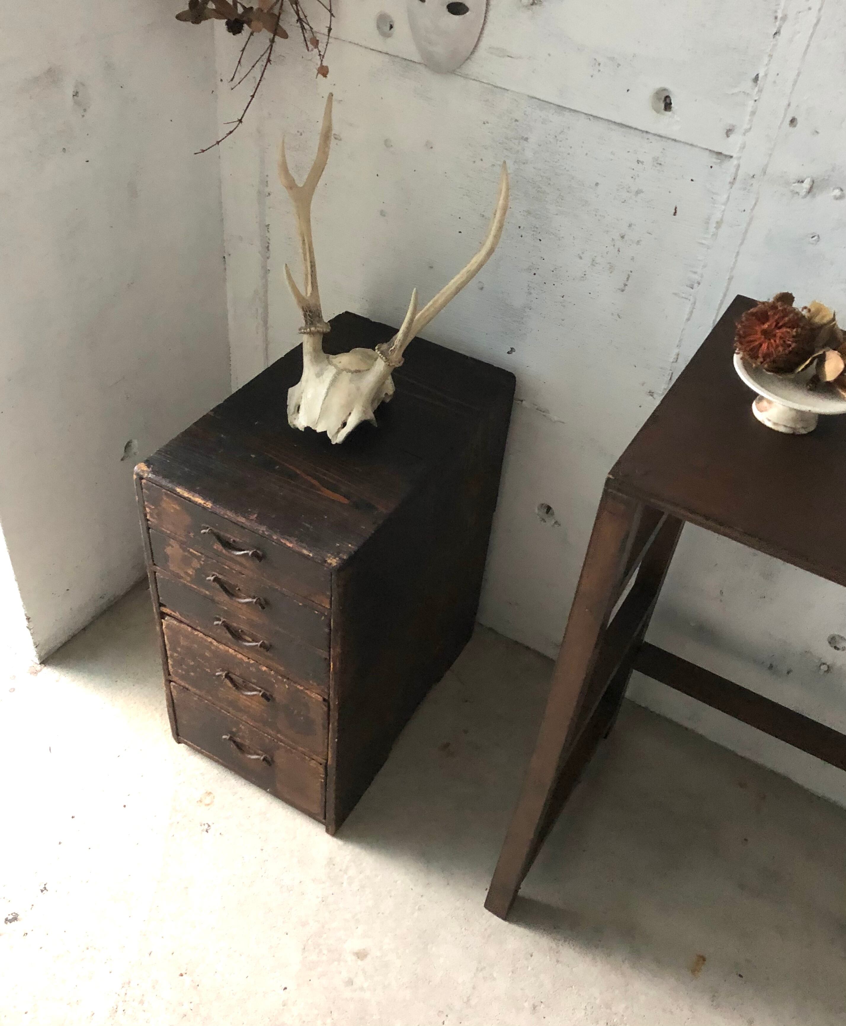 経年変化の深みのある木肌と味のある取手が感じ良い収納棚。引出しの開閉は比較的スムーズに行えます。リビングや趣味部屋で、細々した物や紙物、ステーショナリーの収納としても素敵にお使い頂けそうです。