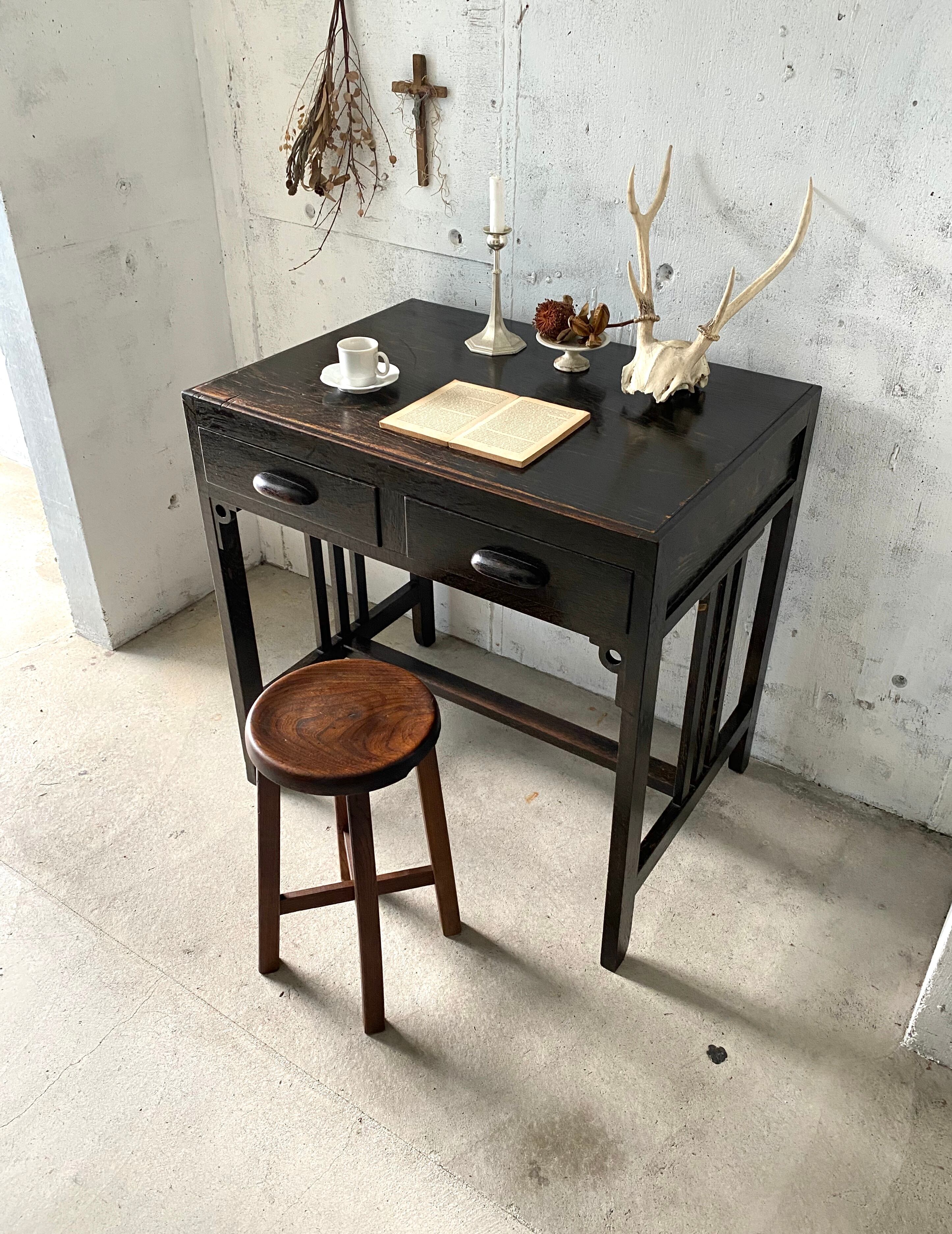 経年変化の雰囲気の良い木肌と木製取手、上品な佇まいが感じ良い木製デスク。引出しは2杯あり、収納力も十分です。実用使いで作業テーブル、パソコンテーブルとしてやお子さんの勉強机としても素敵にお使いいただけそうです。