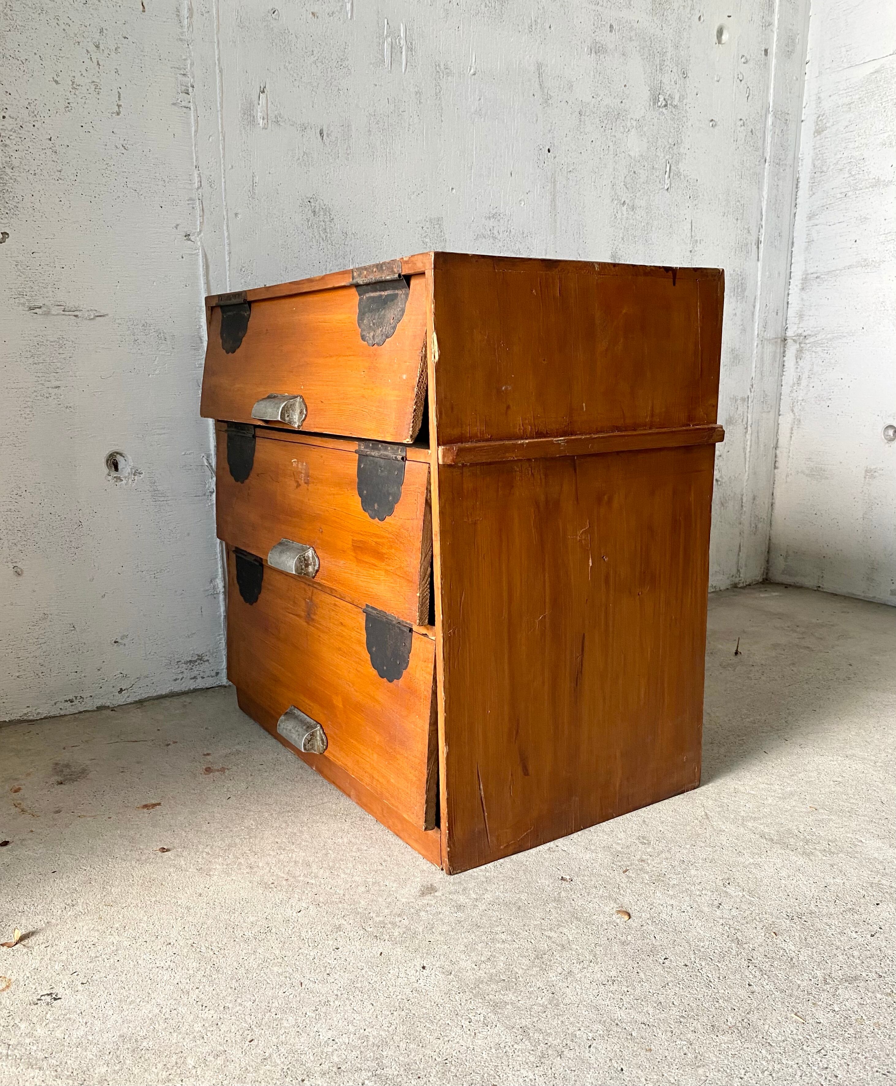 古い収納棚になります。スレや欠け、割れ、削げ、隙間、サビ、当たりキズ、落としきれない汚れなどがあります。扉の開閉は比較的スムーズに行え、使用上問題なくお使いいただけます。全体的に状態も良いのでまだまだ実用的に活躍してくれます。