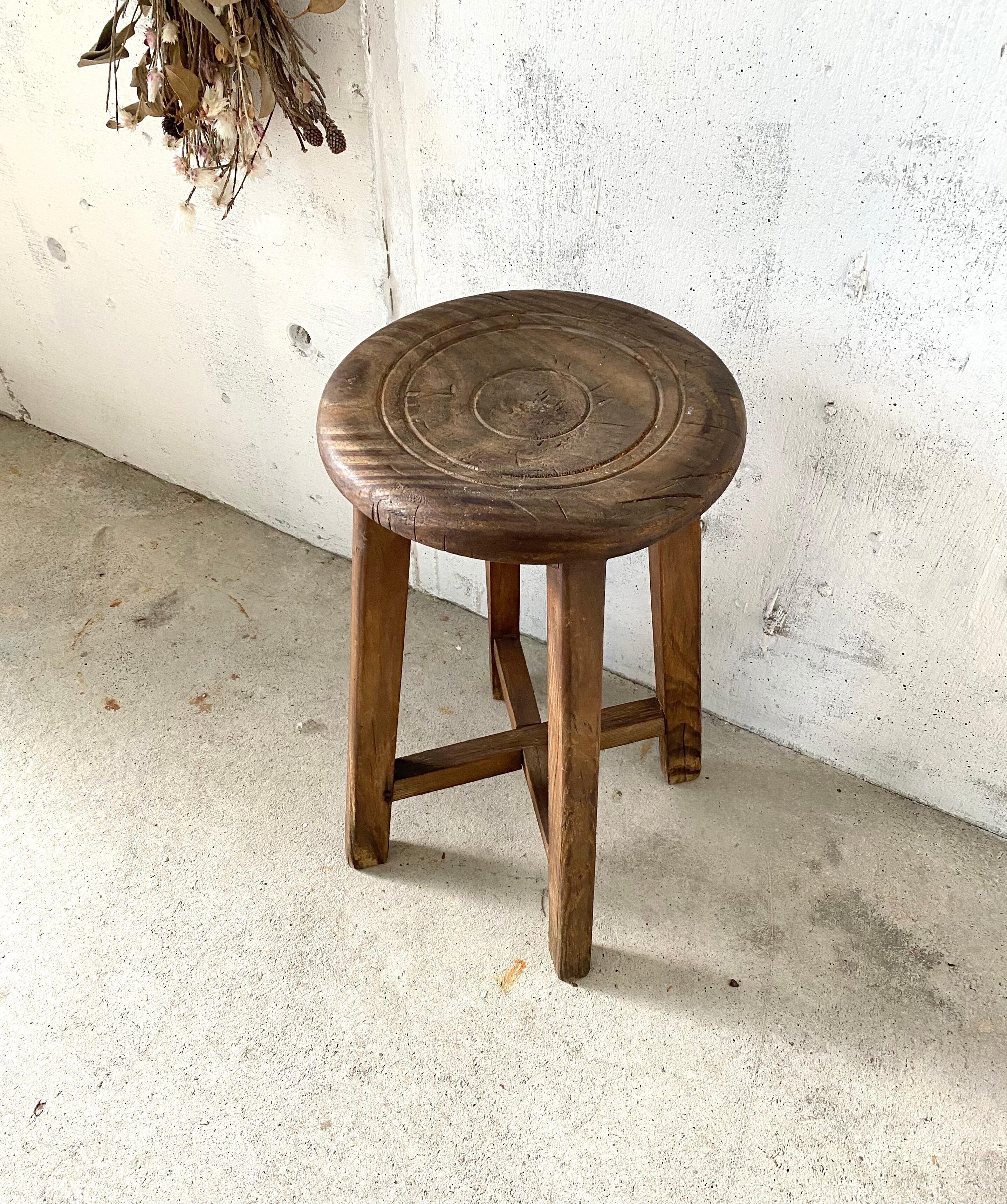経年変化の味のある木肌、すっきりとした姿が感じ良い木製スツール。少しのがたつきはありますが、状態は良いです。実用使いでアトリエや食卓用の椅子、お子さん用の椅子、キッチンや玄関先で腰掛け椅子、ディスプレイ台として植物を飾ってみても感じ良さそうです。