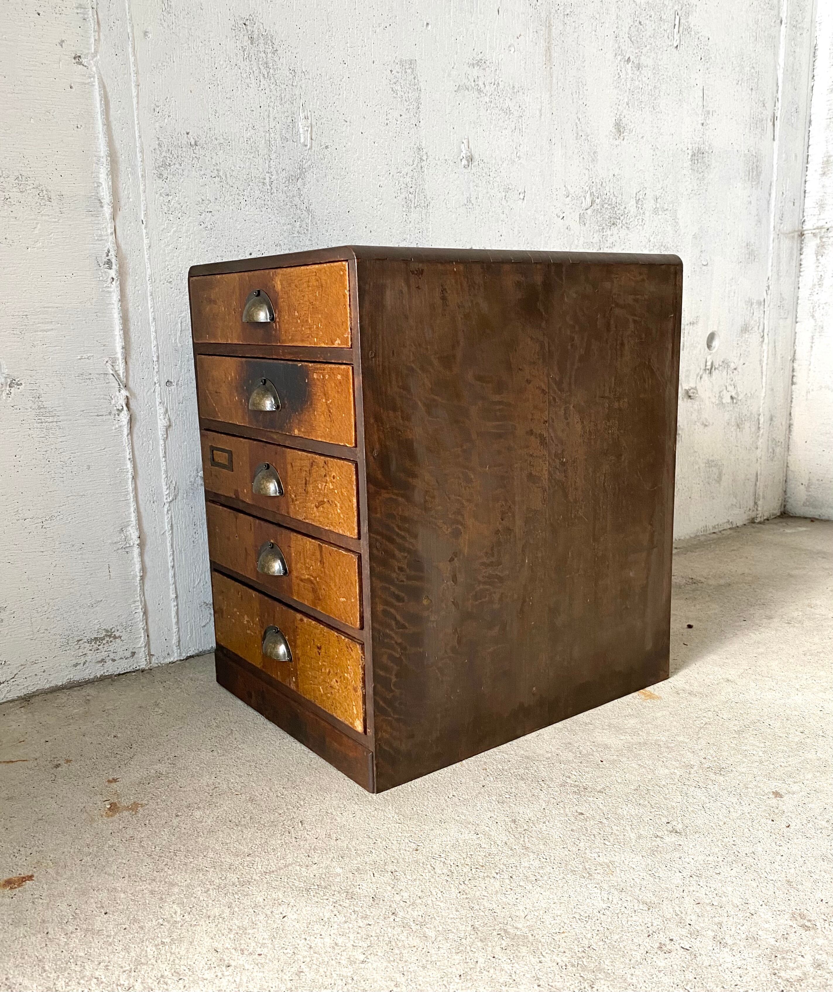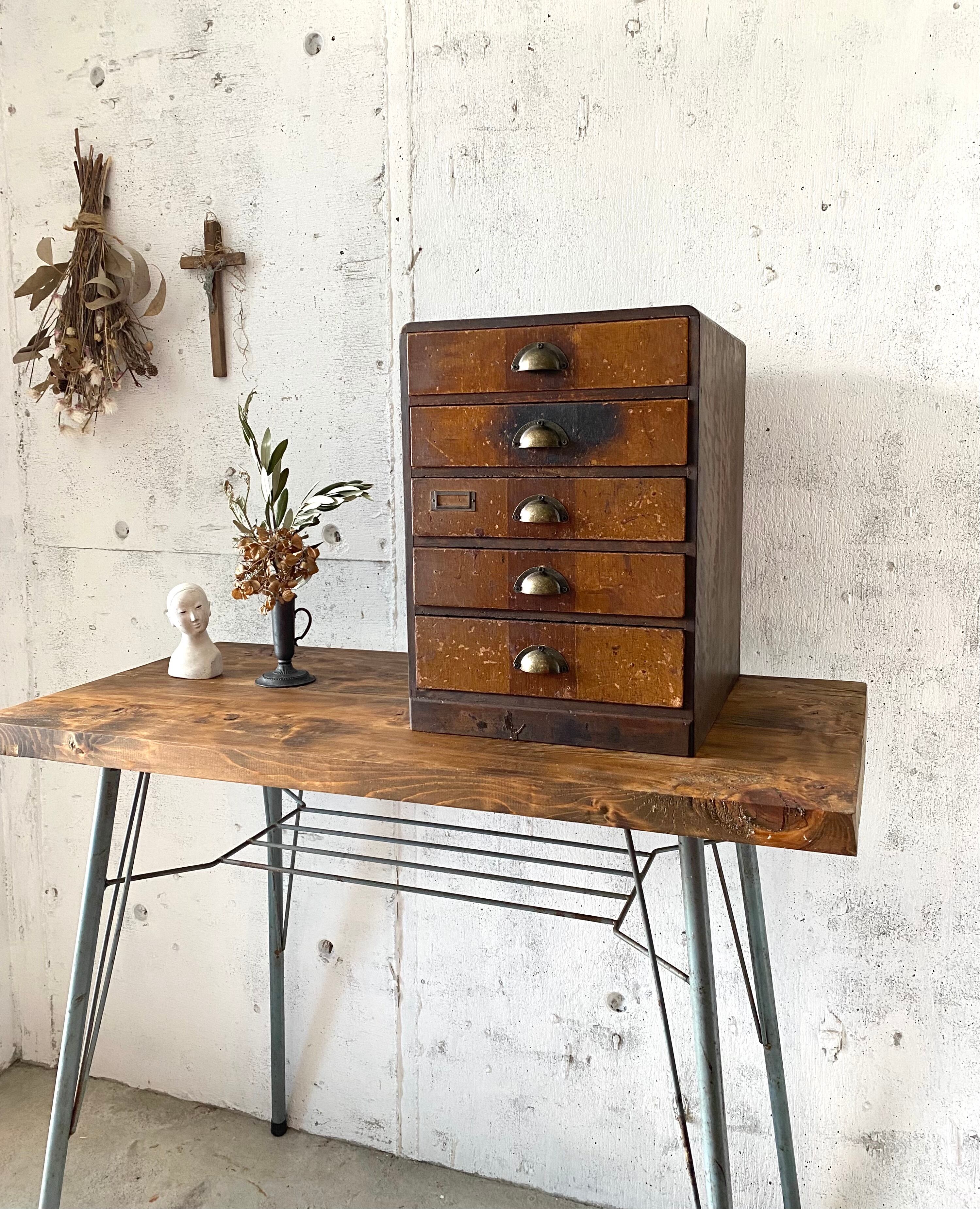 経年変化の雰囲気良い木肌と真鍮取手、上品な佇まいが感じ良い小引出し。引出しの開閉は比較的スムーズに行えます。お部屋のカウンター上やリビング、作業場などの卓上で細々したものやステーショナリーの整理にも役立ちそうです。