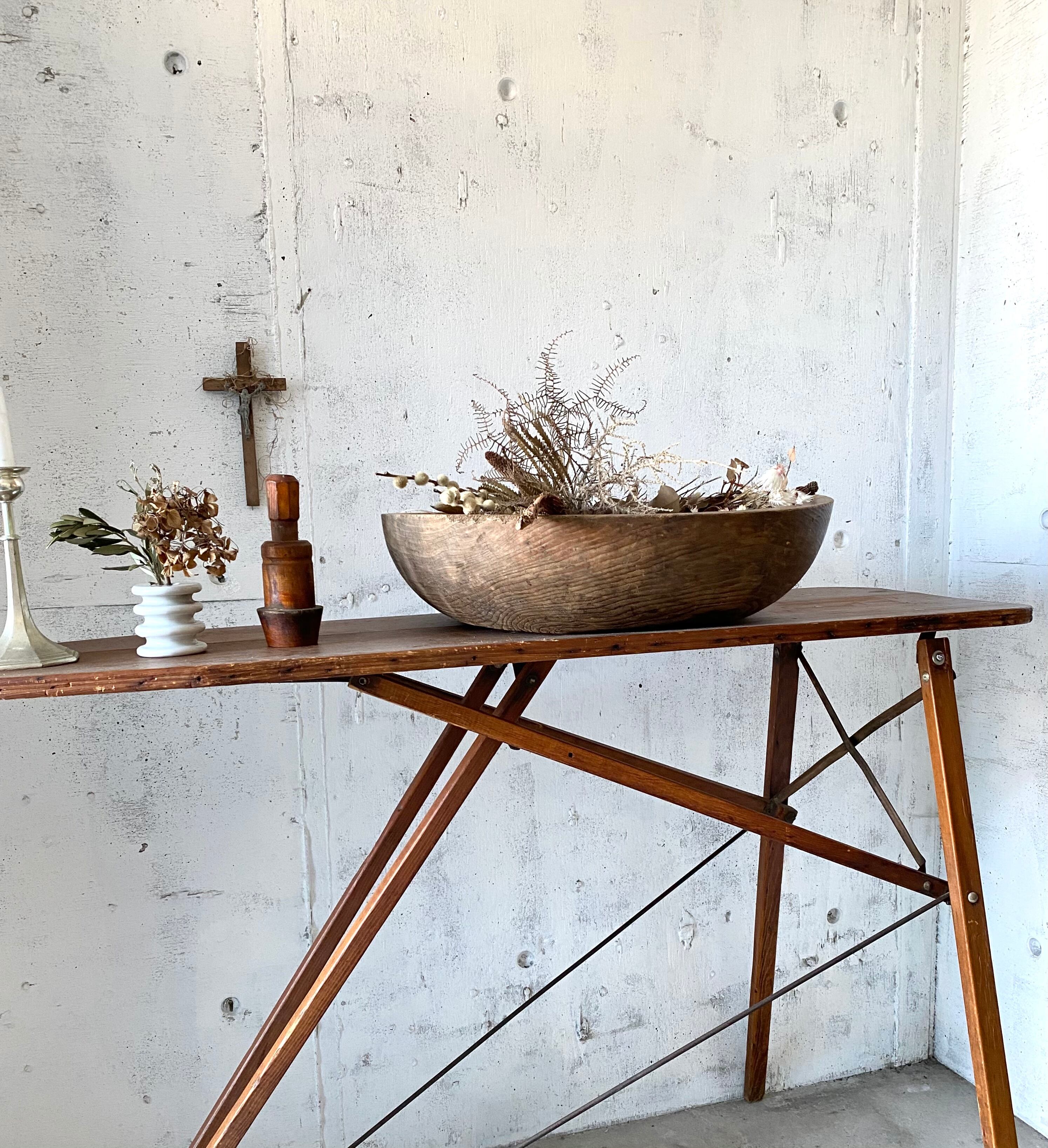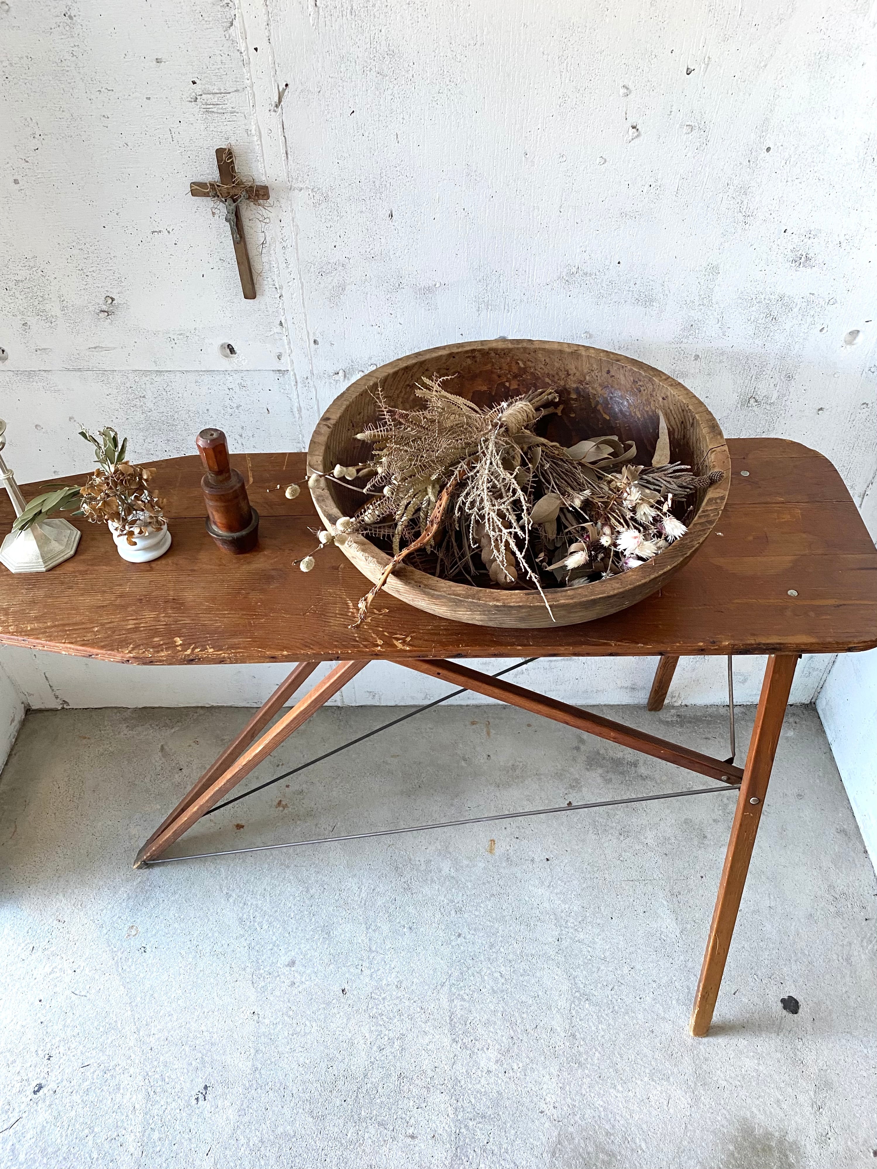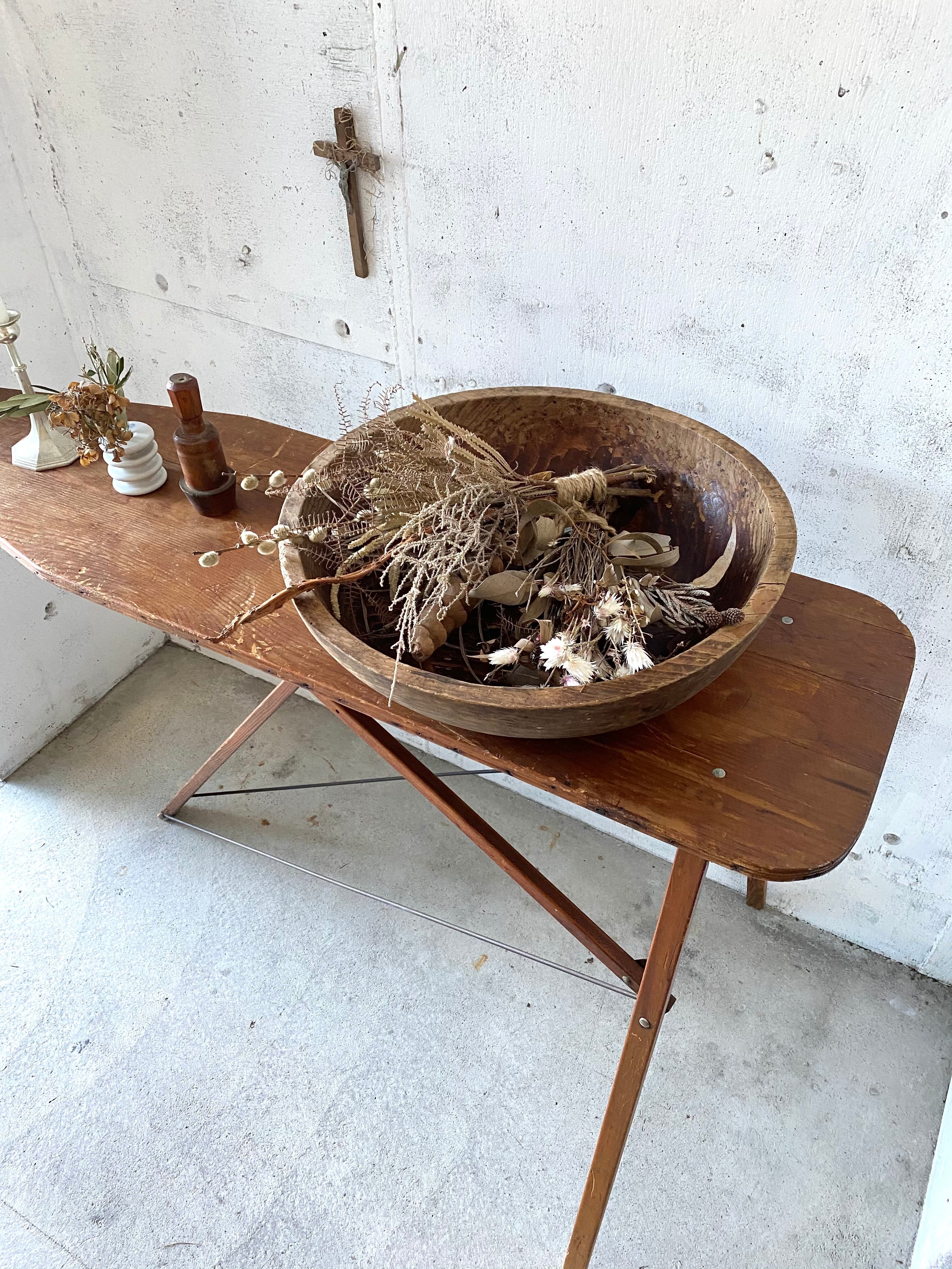 使い込まれて味の出た、雰囲気の良い捏鉢。重量感があり、しっかりとしていて状態は良いです。キッチンでフルーツやお野菜を入れたり、玄関先やリビングなどでドライフラワーをこんもり入れて飾ってみても素敵な空間演出が叶いそうです。