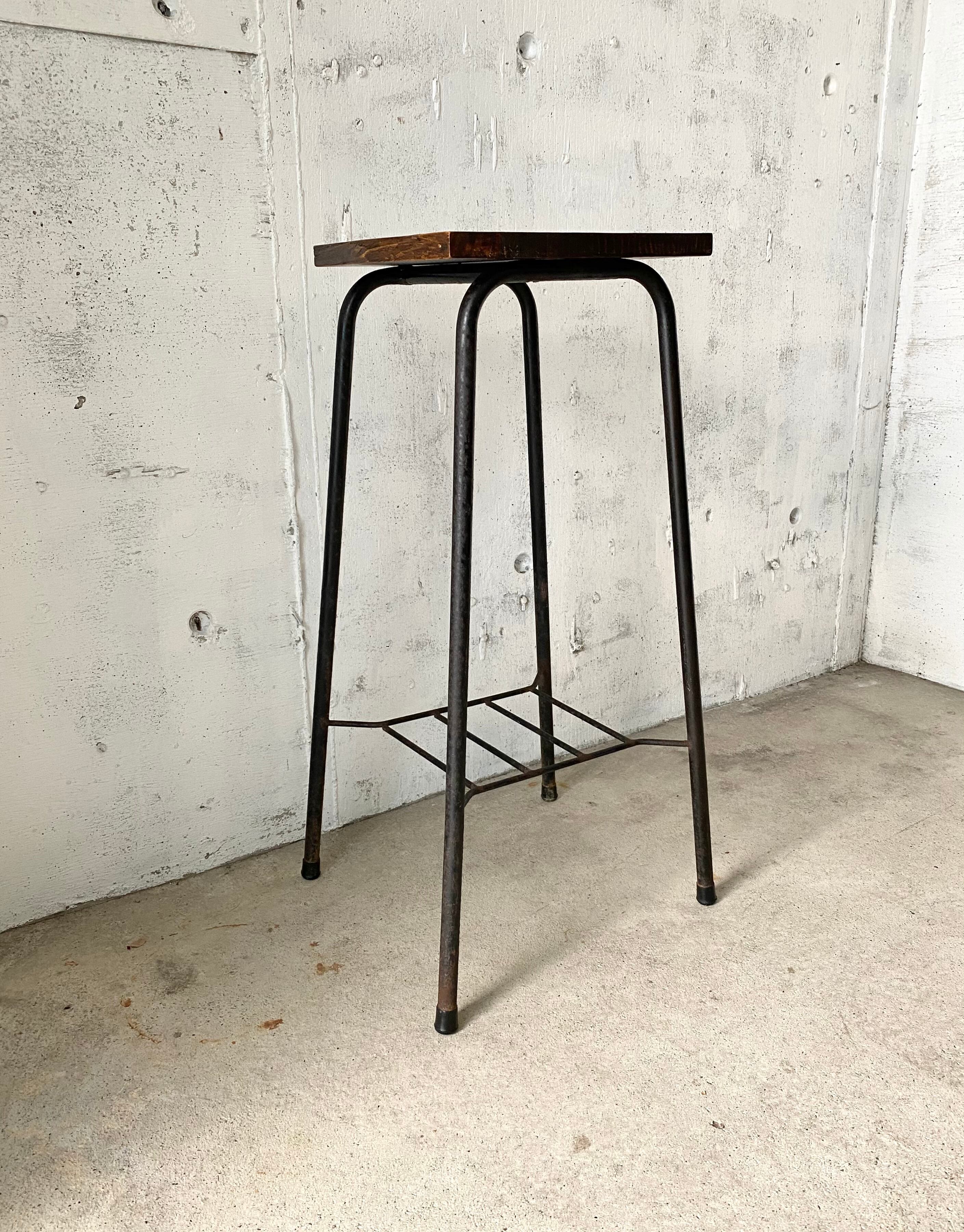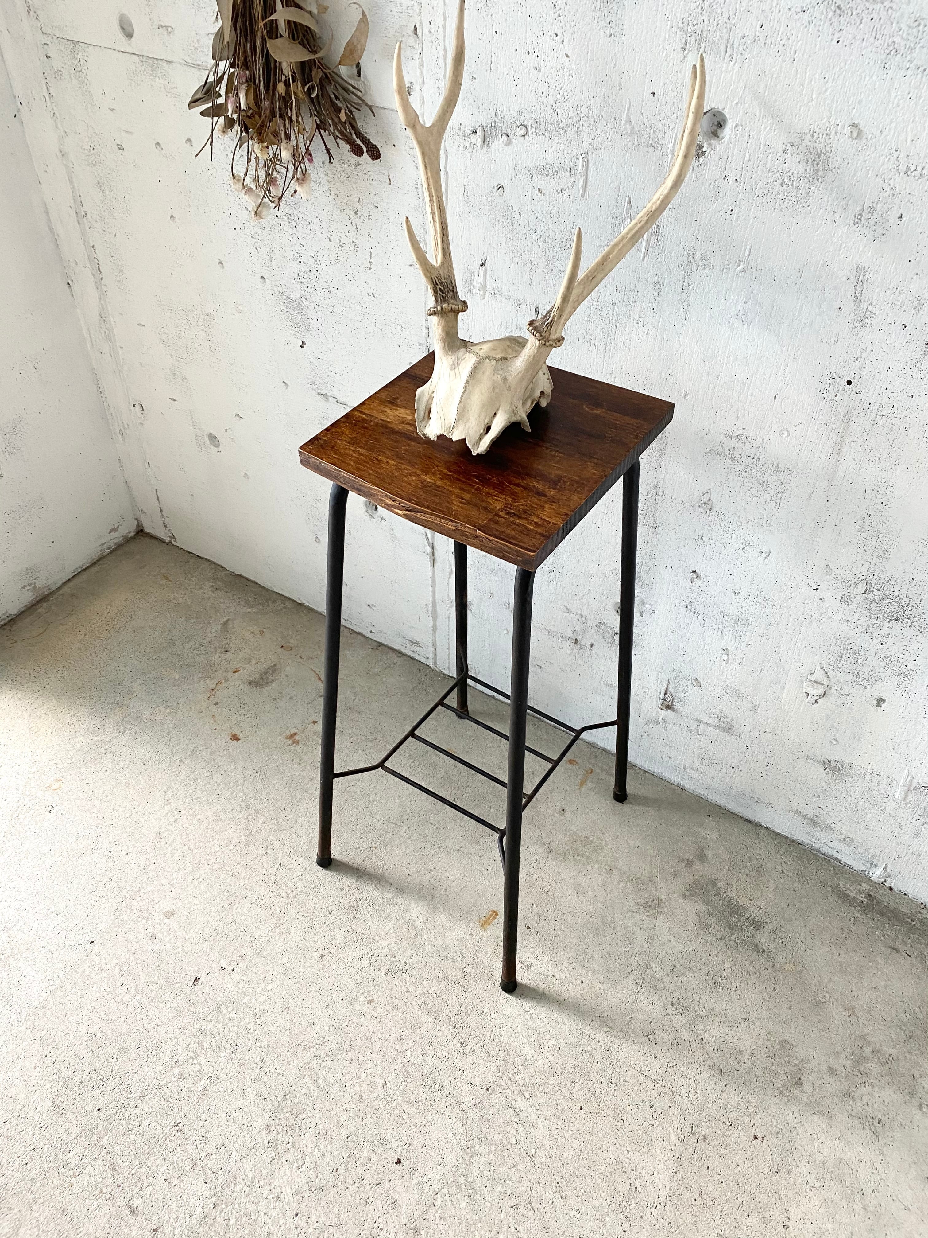 味のある木板とサビ脚の掛け合わせが感じ良い飾り台。少しのがたつきはありますが、状態は良いです。リビングや玄関先、ガーデニングなどで植物や小物を飾る台としても素敵です。店舗什器としてショップカードなどを置く台としても活躍してくれそうです。
