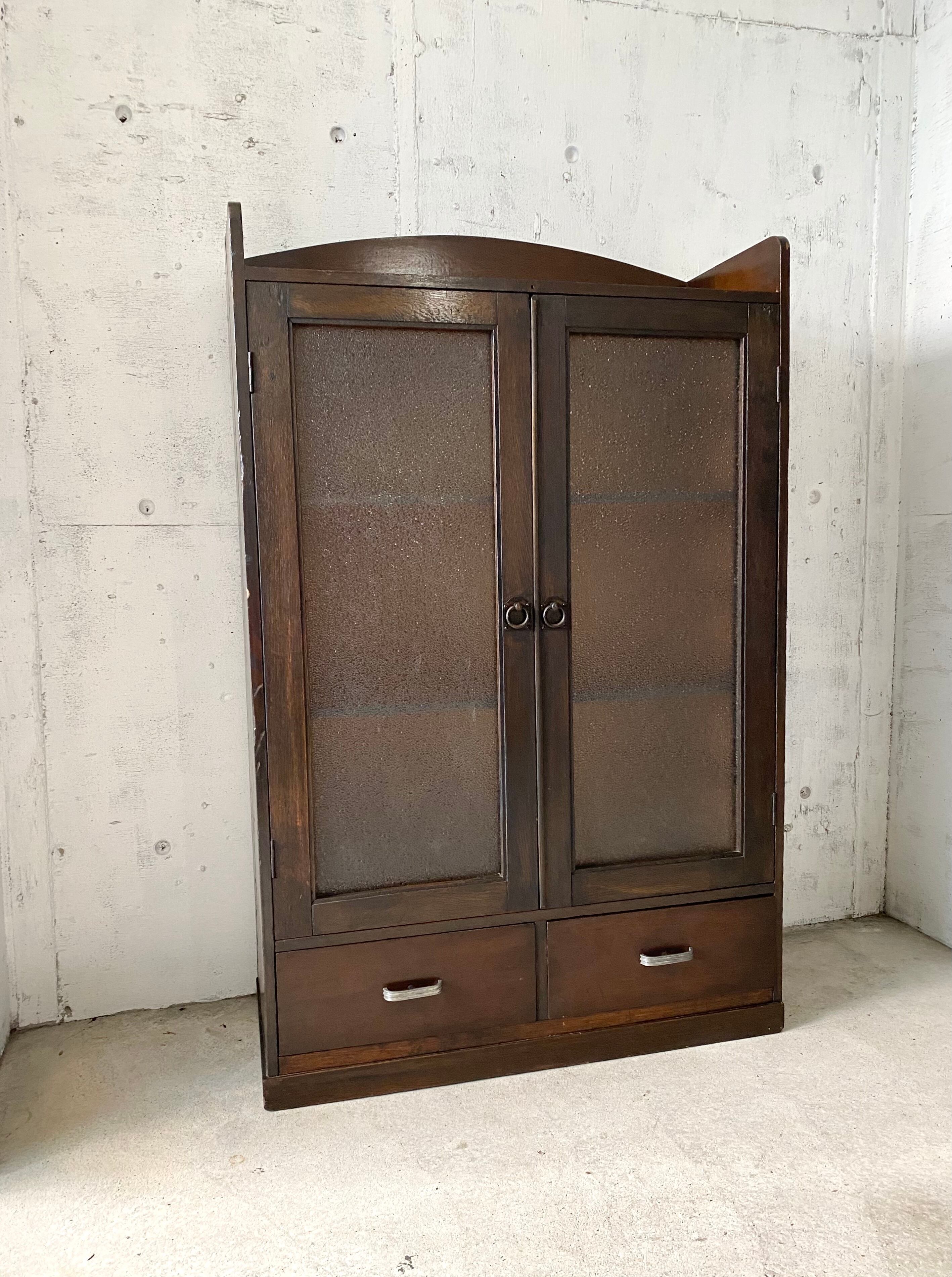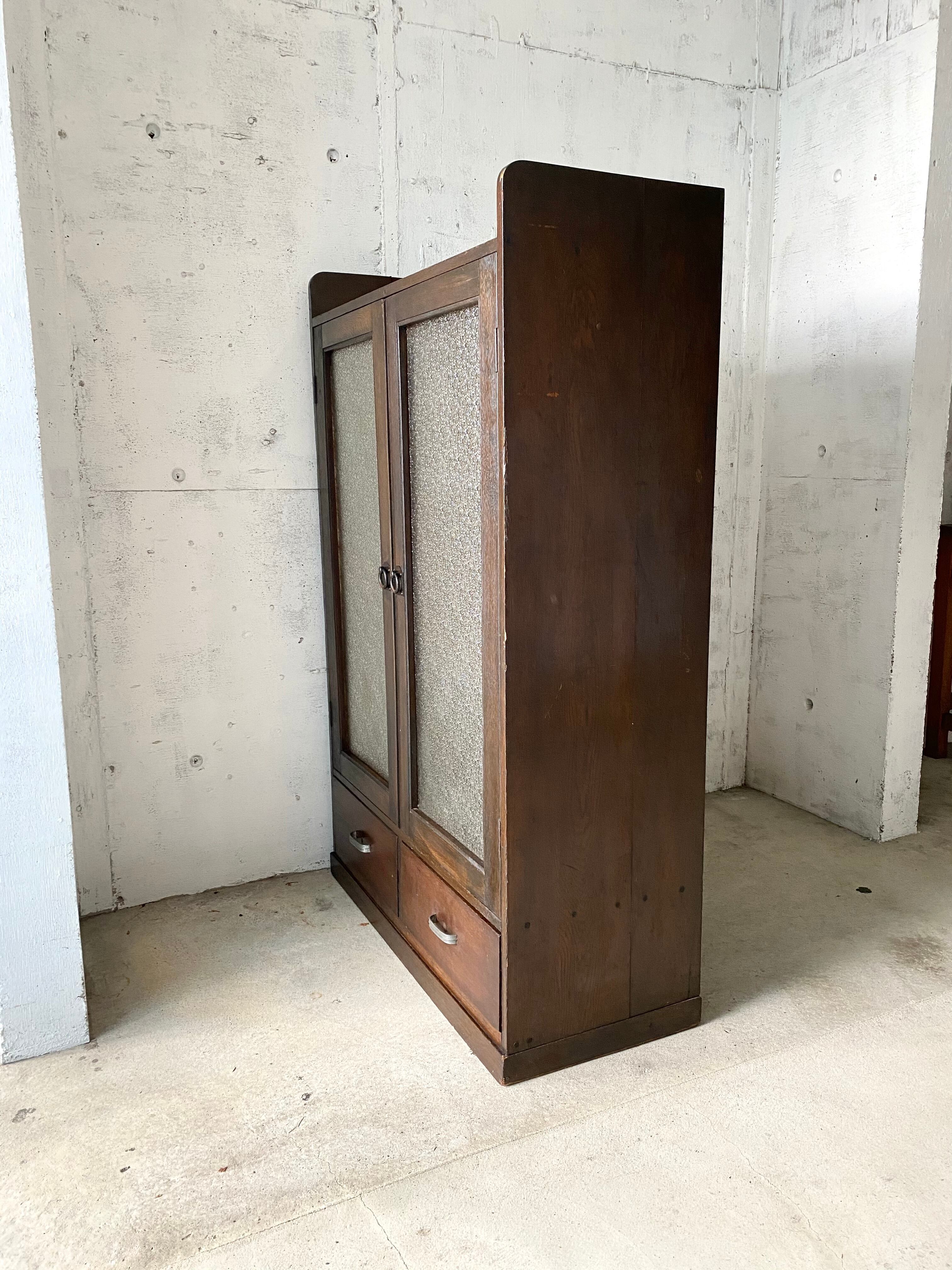 古いキャビネットになります。スレや欠け、当たりキズ、割れ、反り、サビ、隙間、落としきれない汚れなどがあります。ガラス扉、引出しの開閉は比較的スムーズに行え、使用上問題なくお使いいただけます。ガラスの状態は特に目立つ割れもなく綺麗で、全体的に状態も良いのでまだまだ実用的に活躍してくれます。