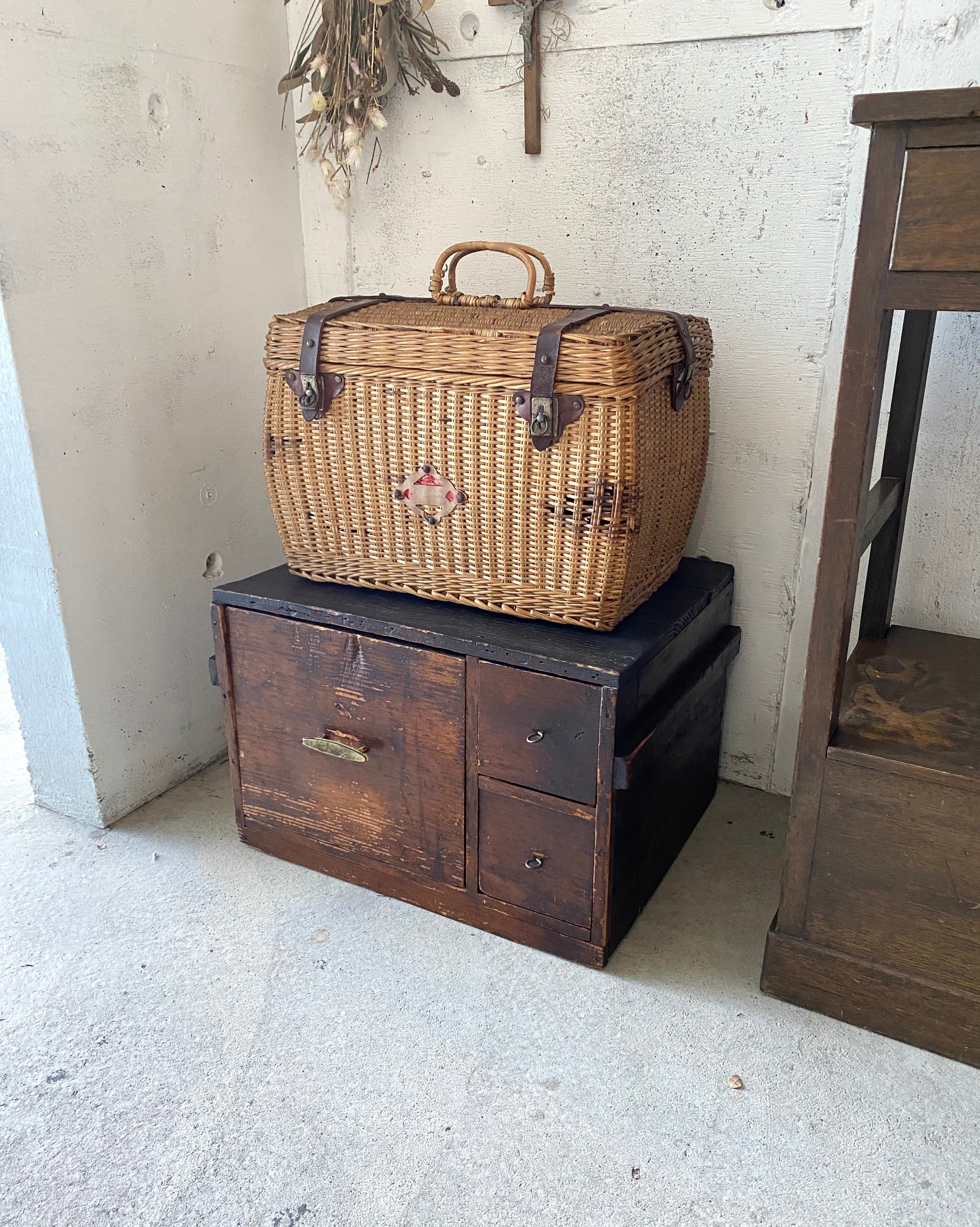 経年変化の深みのある木肌と味のある取手が感じ良い収納棚。引出しの開閉は比較的スムーズに行えます。リビングや趣味部屋で、細々した物や紙物、ステーショナリーの収納としても素敵にお使い頂けそうです。