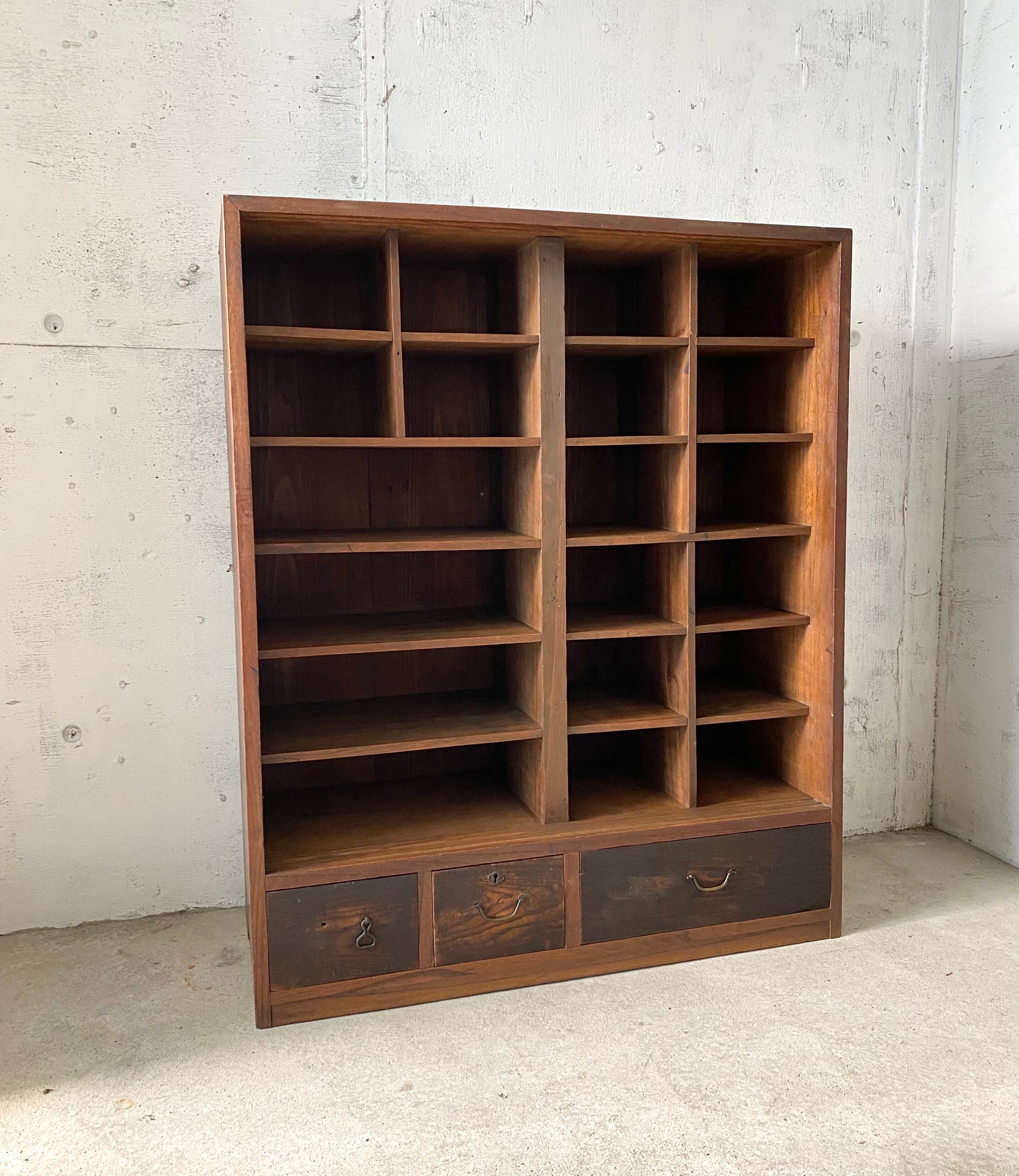 経年変化の味のある木肌と取手、上品な佇まいが感じ良いマス棚。引出しの開閉は比較的スムーズに行えます。キッチンで食器や調味料のストック棚としてや、リビングで小物や本、紙物の収納棚としても素敵です。