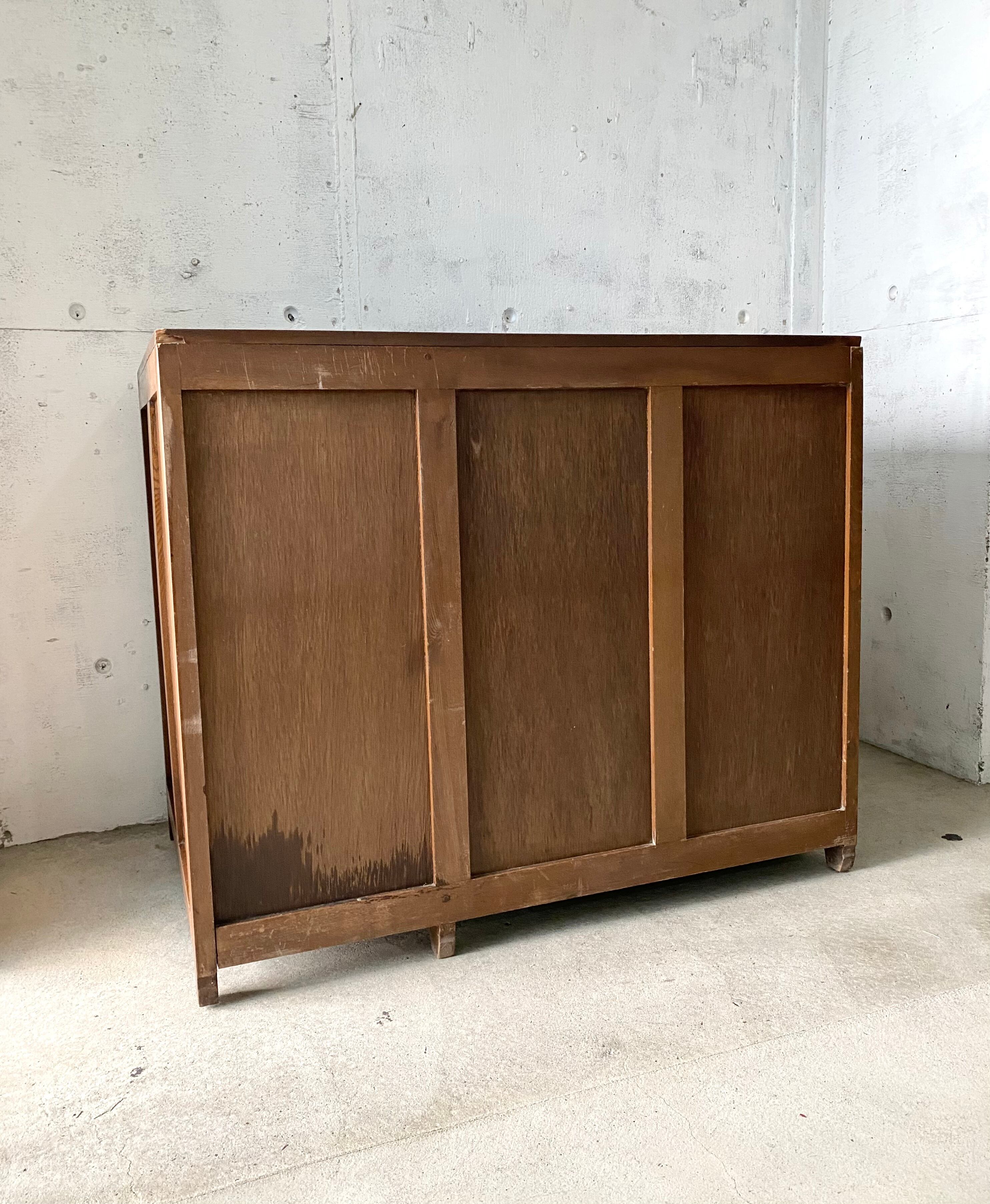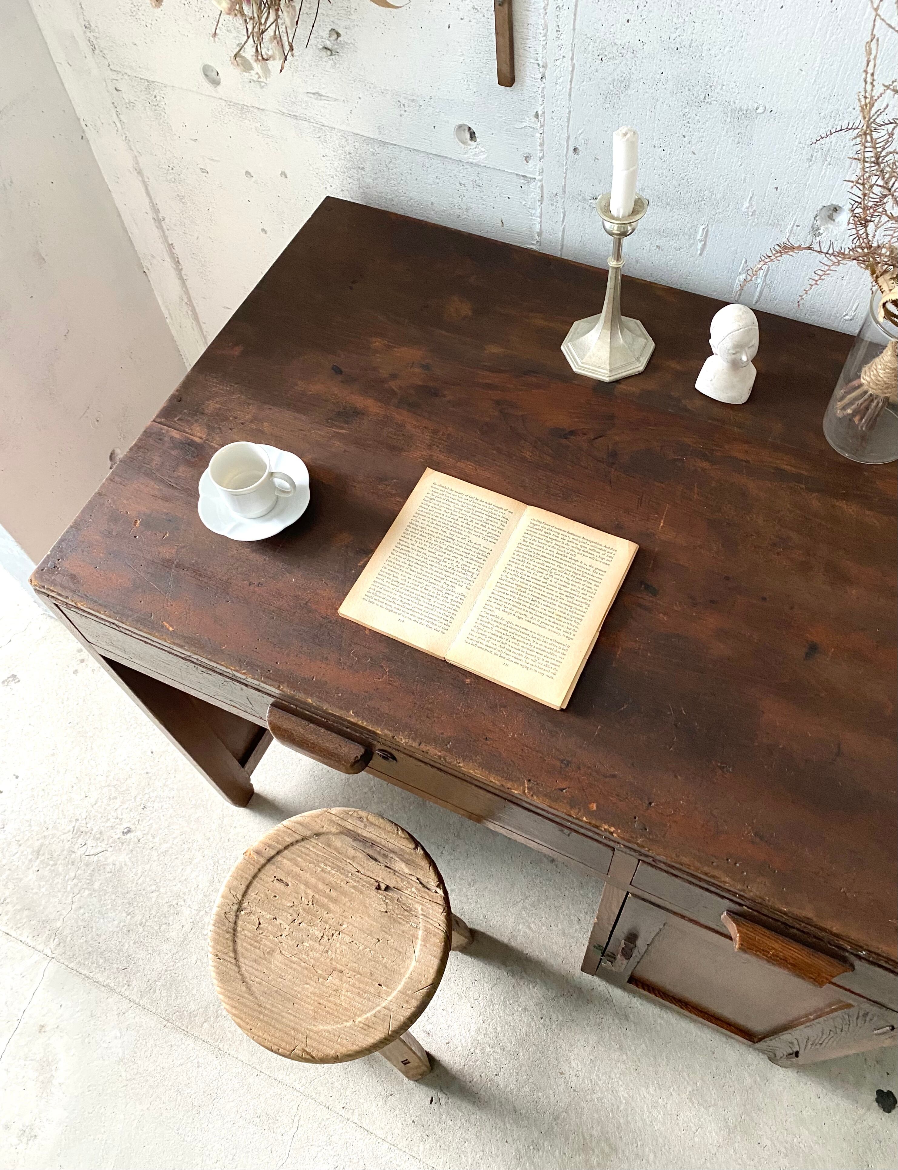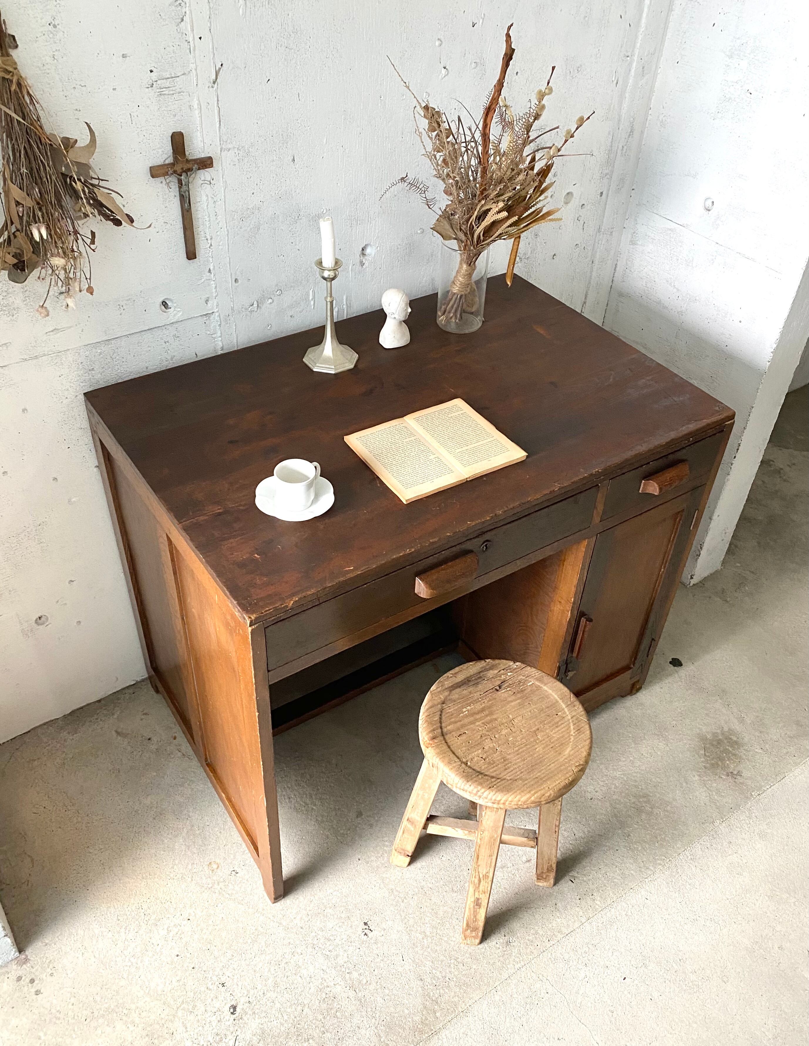 古い木製デスクになります。スレや欠け、当たりキズ、割れ、禿げ、反り、サビ、隙間、落としきれない汚れなどがあります。少しのがたつきはありますが、扉戸、引出しの開閉は比較的にスムーズに行えます。全体的に状態も良いのでまだまだ実用的に活躍してくれます。