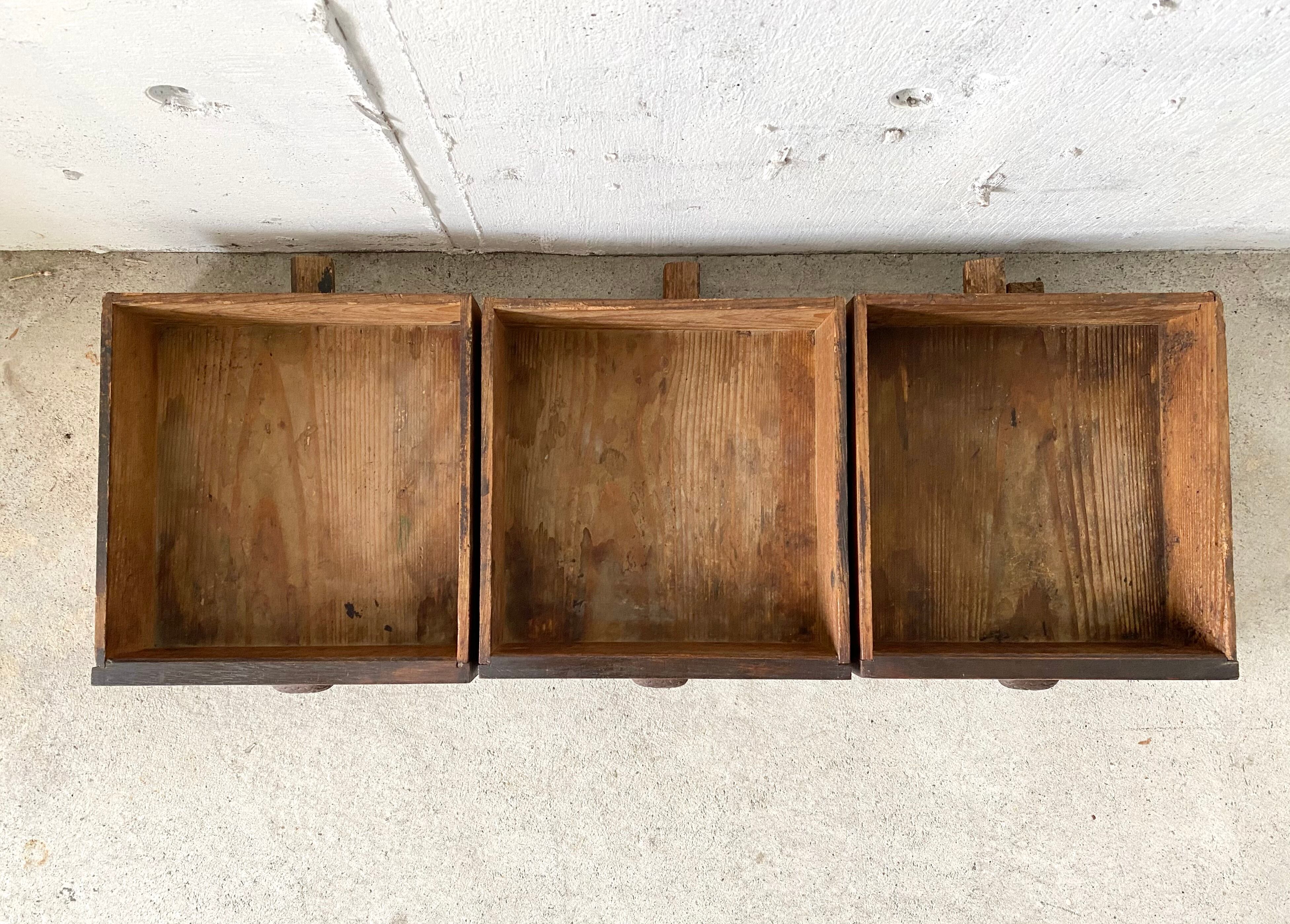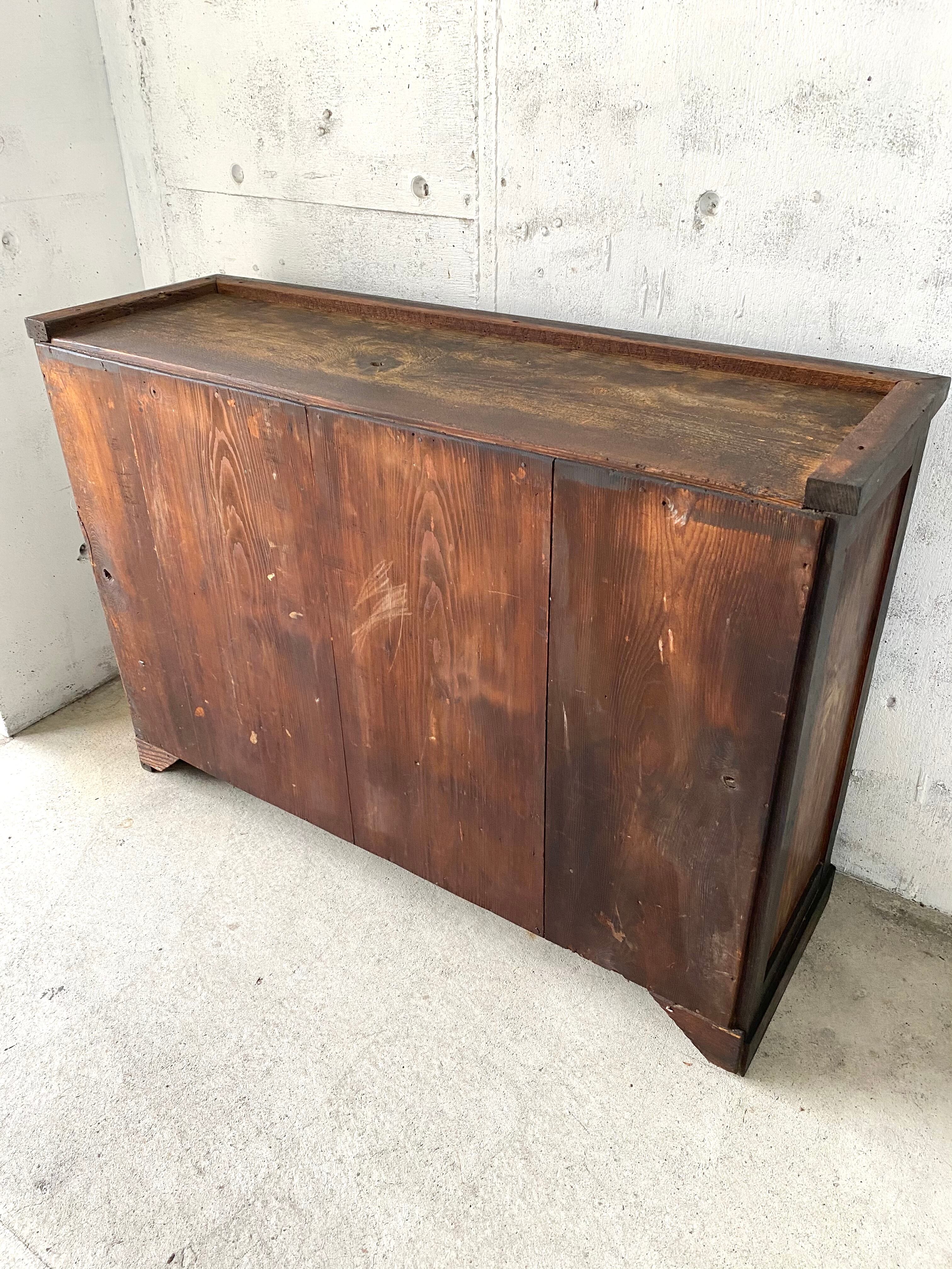 古い収納棚になります。スレや欠け、当たりキズ、割れ、虫食い、反り、サビ、隙間、落としきれない汚れがあります。引戸、引出しの開閉は比較的スムーズに行えます。しっかりとしていて重量感があり全体的に状態も良いのでまだまだ実用的に活躍してくれます。
