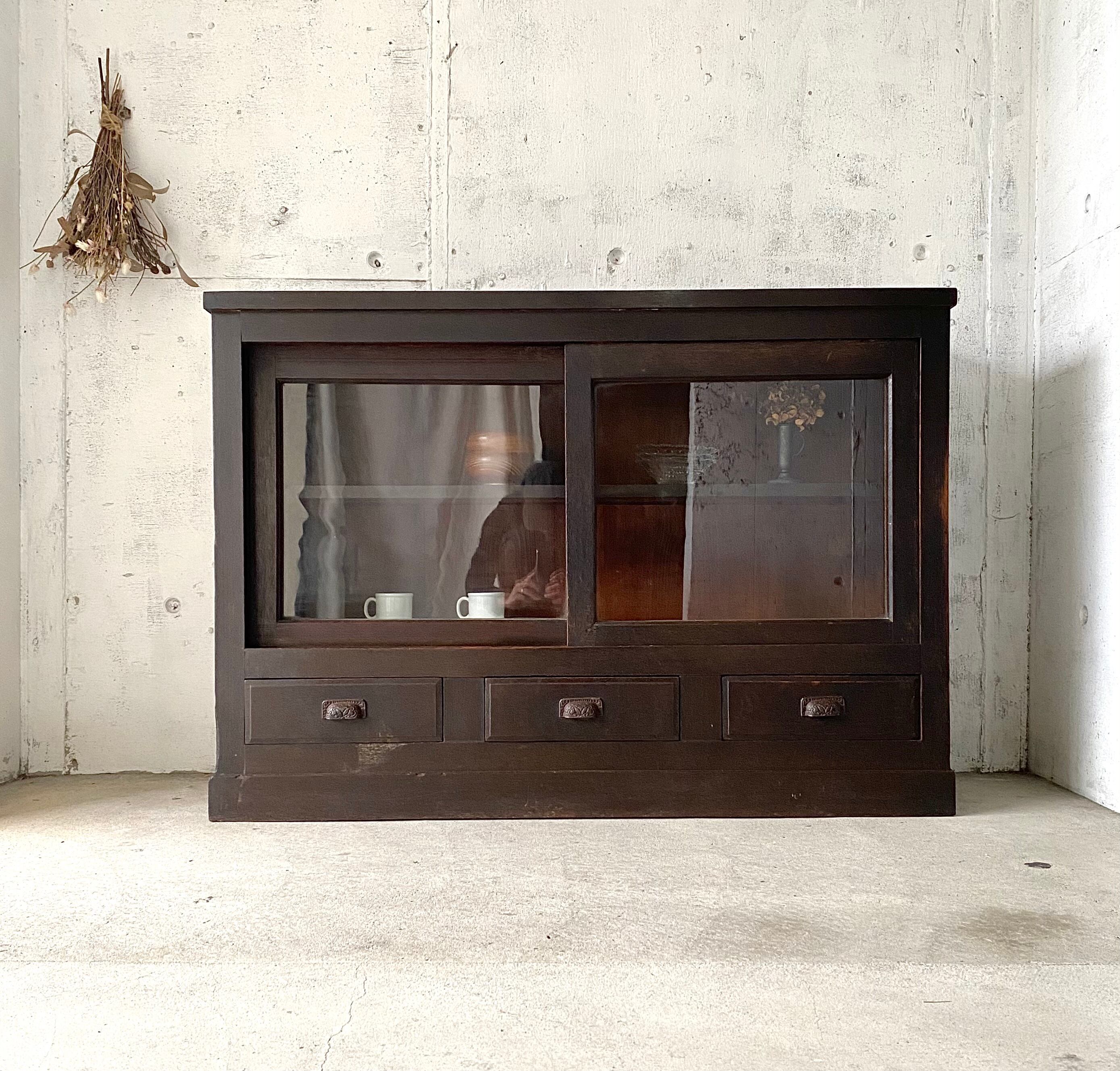 経年変化の味のある雰囲気良い木肌と取手、ガラスの引戸が感じ良い収納棚。天板上には飾り台があるので使い勝手も良いです。キッチンで食器の収納としてや、リビングで小物や本の収納としても素敵です。ショップの店舗什器としてもおすすめの品です。