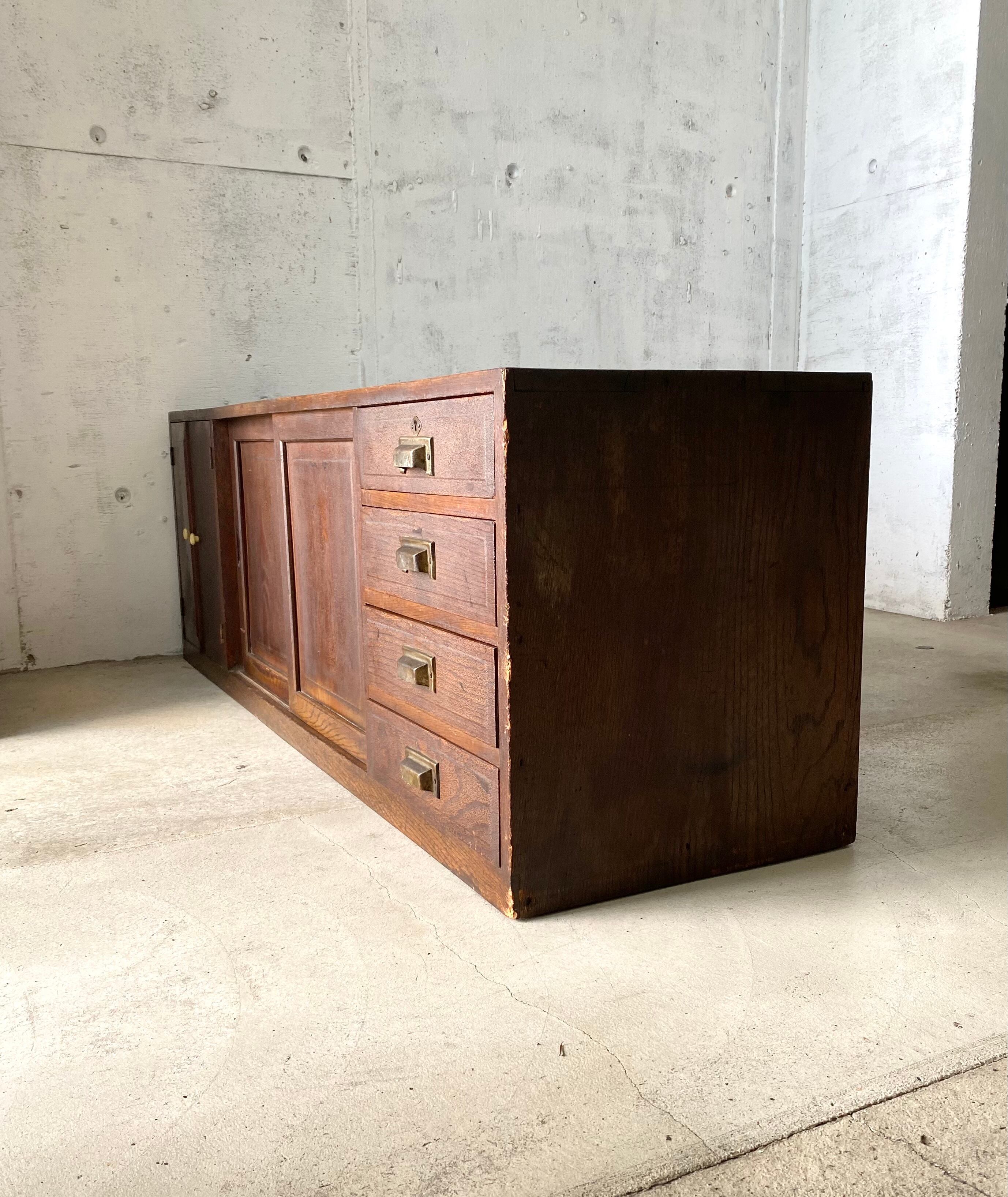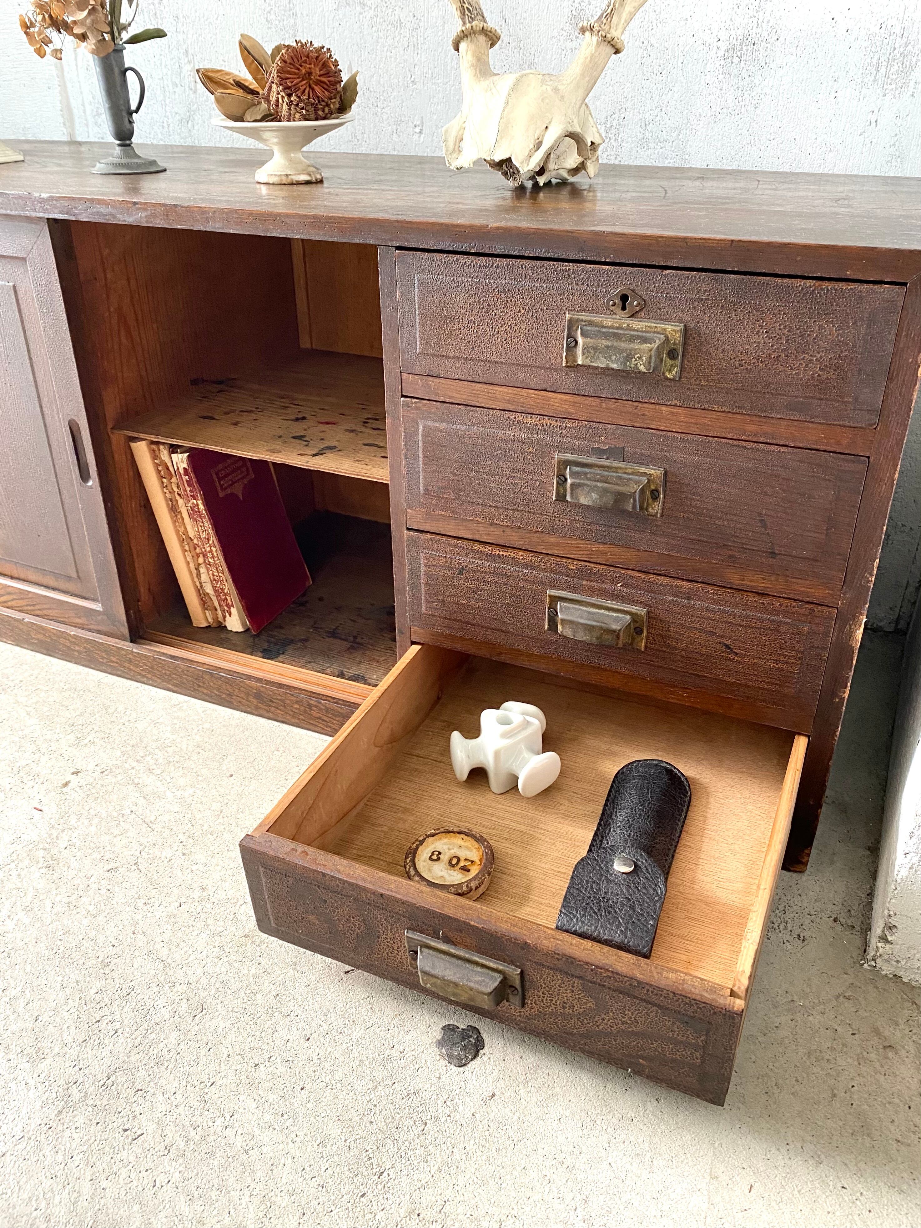 経年変化の味のある木肌と取手、横長い姿が感じ良い収納棚。引出し、引戸、扉戸の開閉は比較的スムーズに行えます。お部屋ででテレビボードとして使ってみたり、小物や本を収納しながら天板上にお気に入りのコレクションを並べて飾ってみても素敵です。