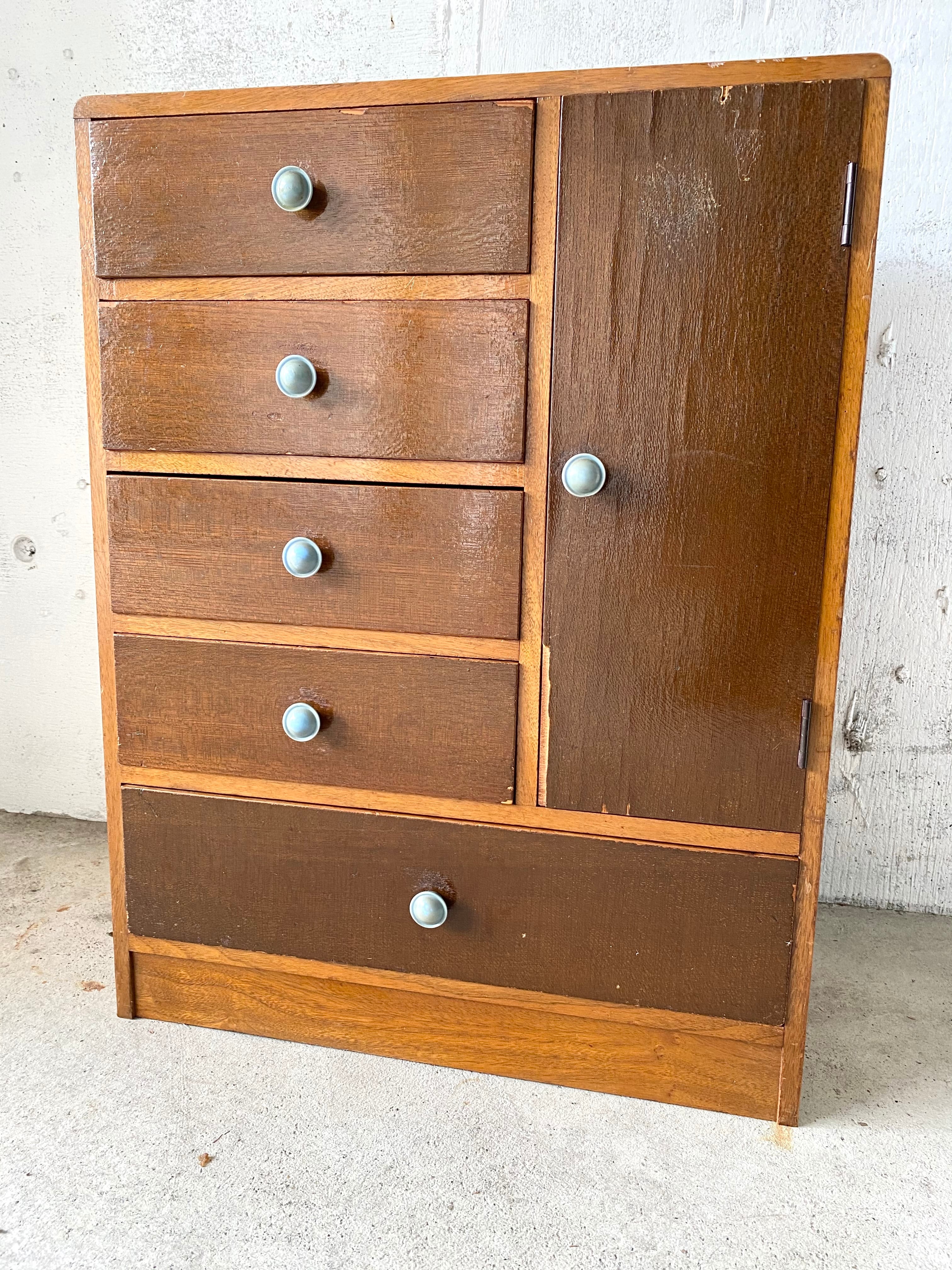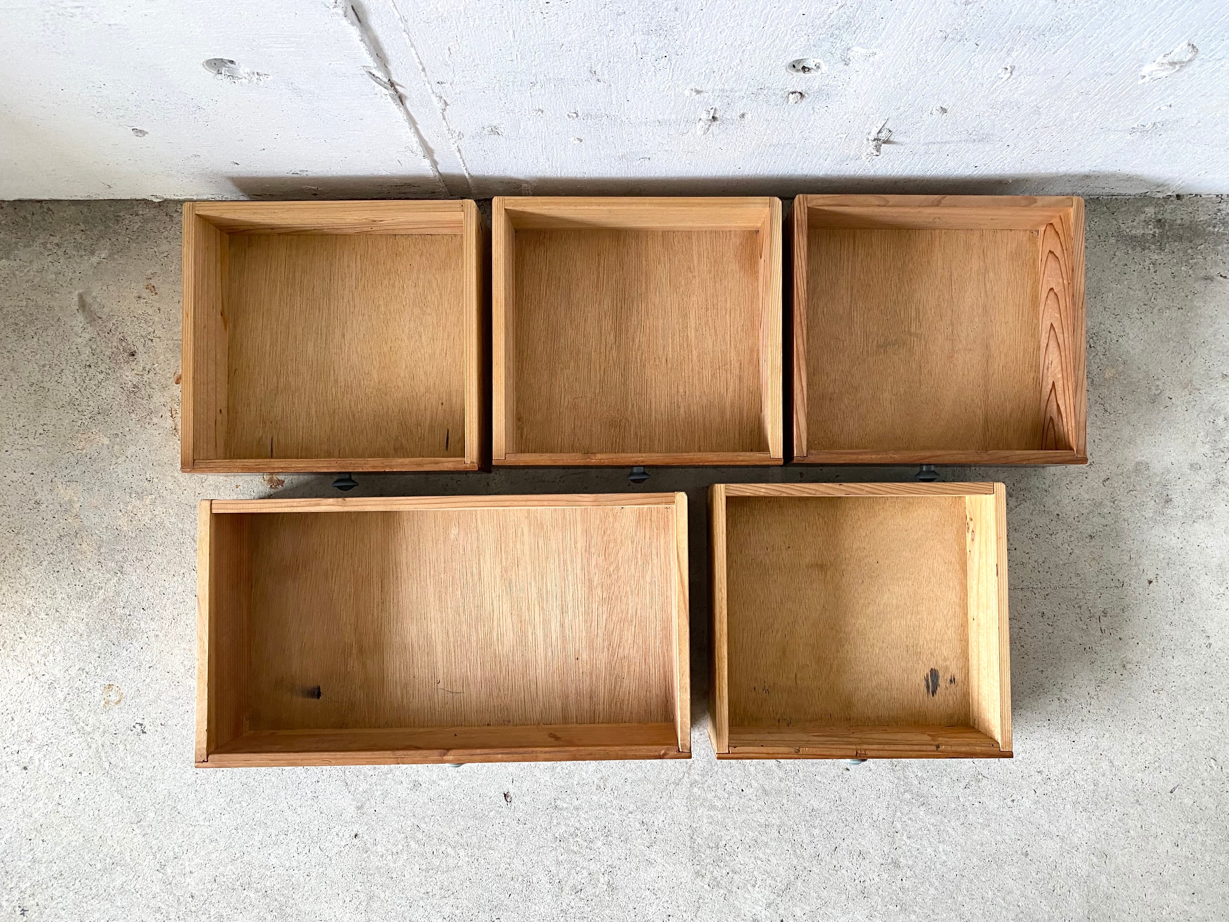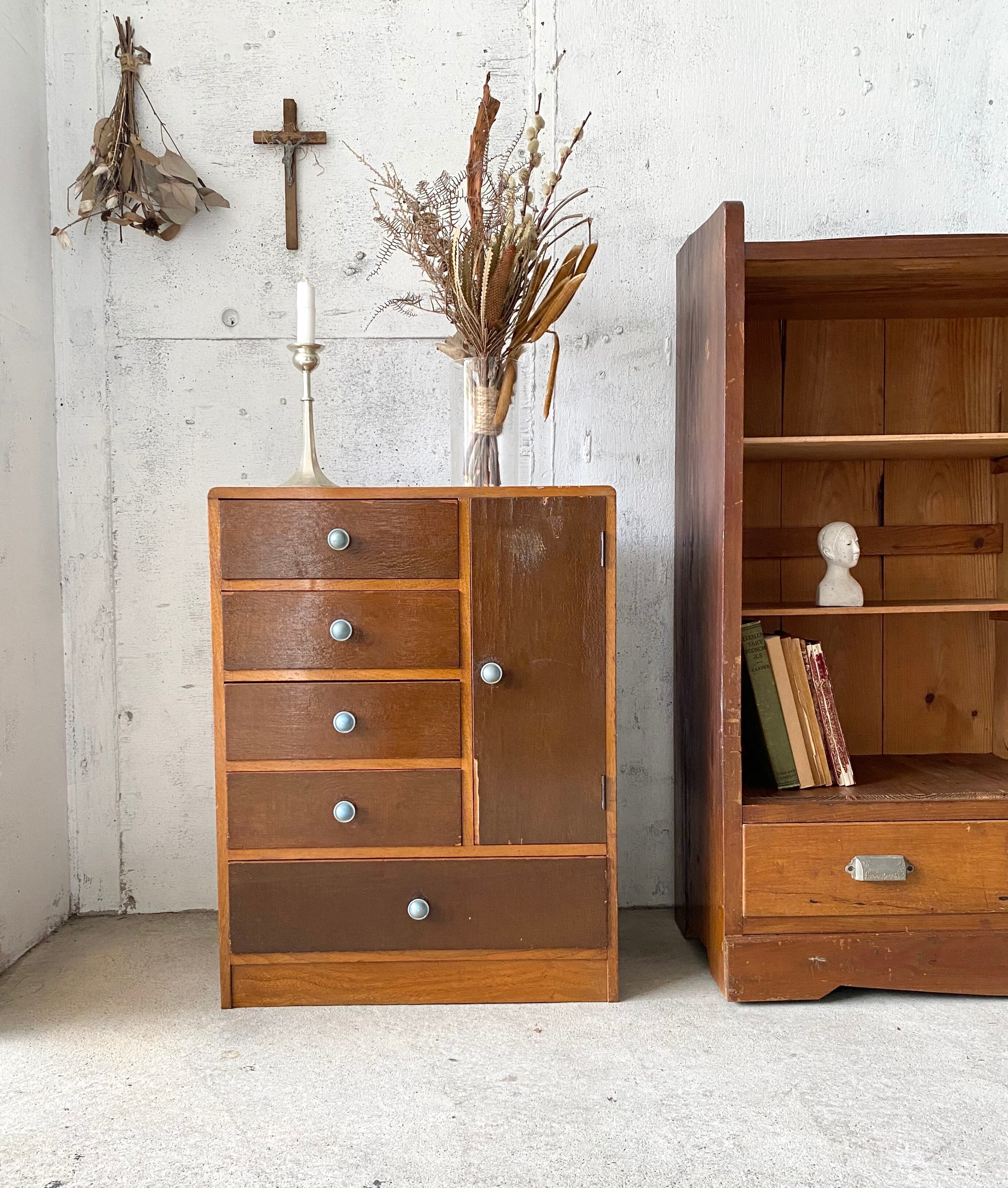 経年変化のバイカラーな味のある木肌と取手が感じ良い収納棚。リビングや趣味部屋で小物や本、紙物の収納としてやキッチンで細々した物の収納としても素敵にお使い頂けそうです。