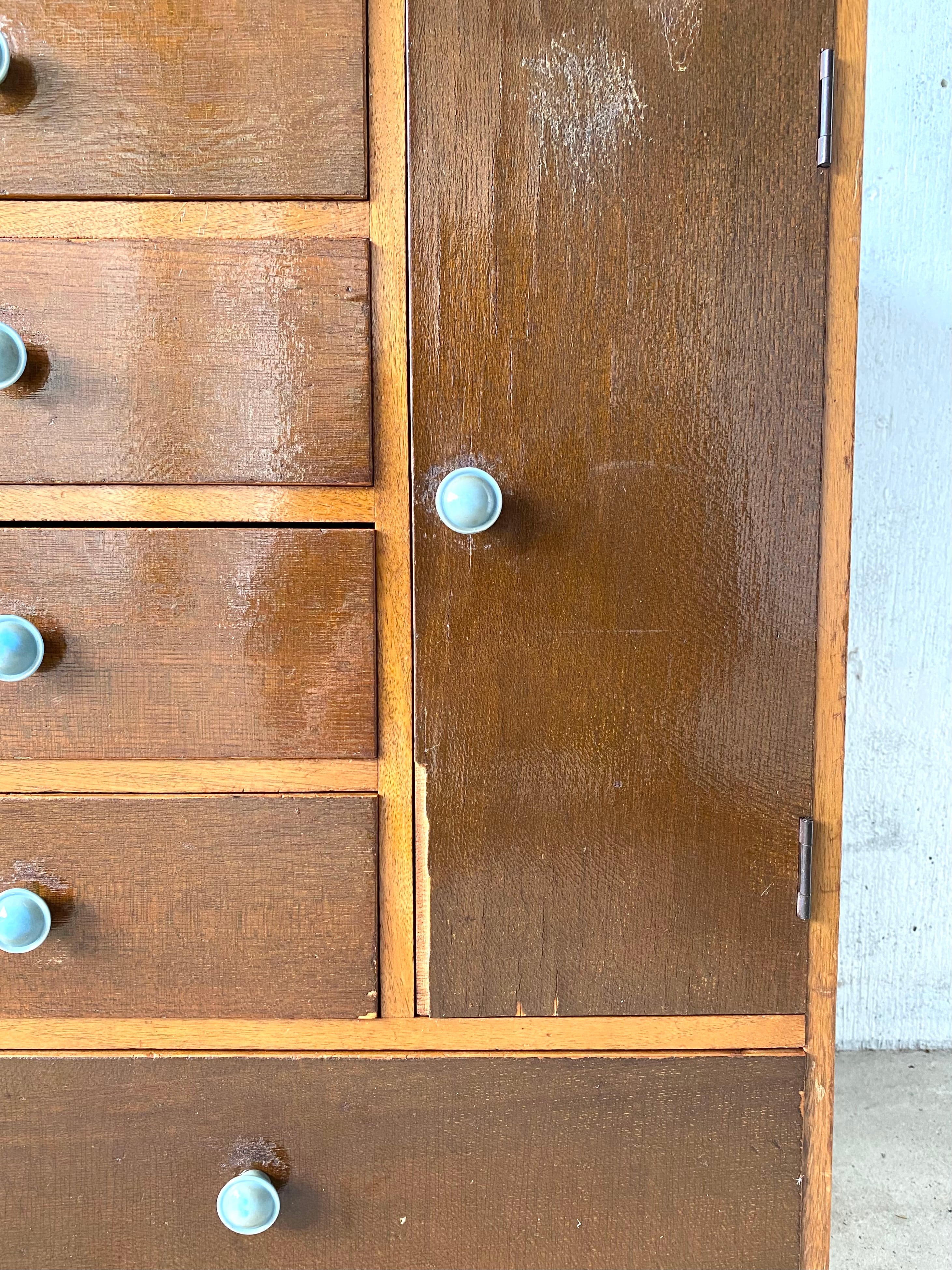 古い収納棚になります.。スレやハゲ、割れ、欠け、隙間、反り、当たりキズ、落としきれない汚れなどがあります。特にガラスの割れもなく、扉は少し硬いですが、引出しの開閉は比較的スムーズに行えます。全体的に状態も良いのでまだまだ実用的に活躍してくれます。