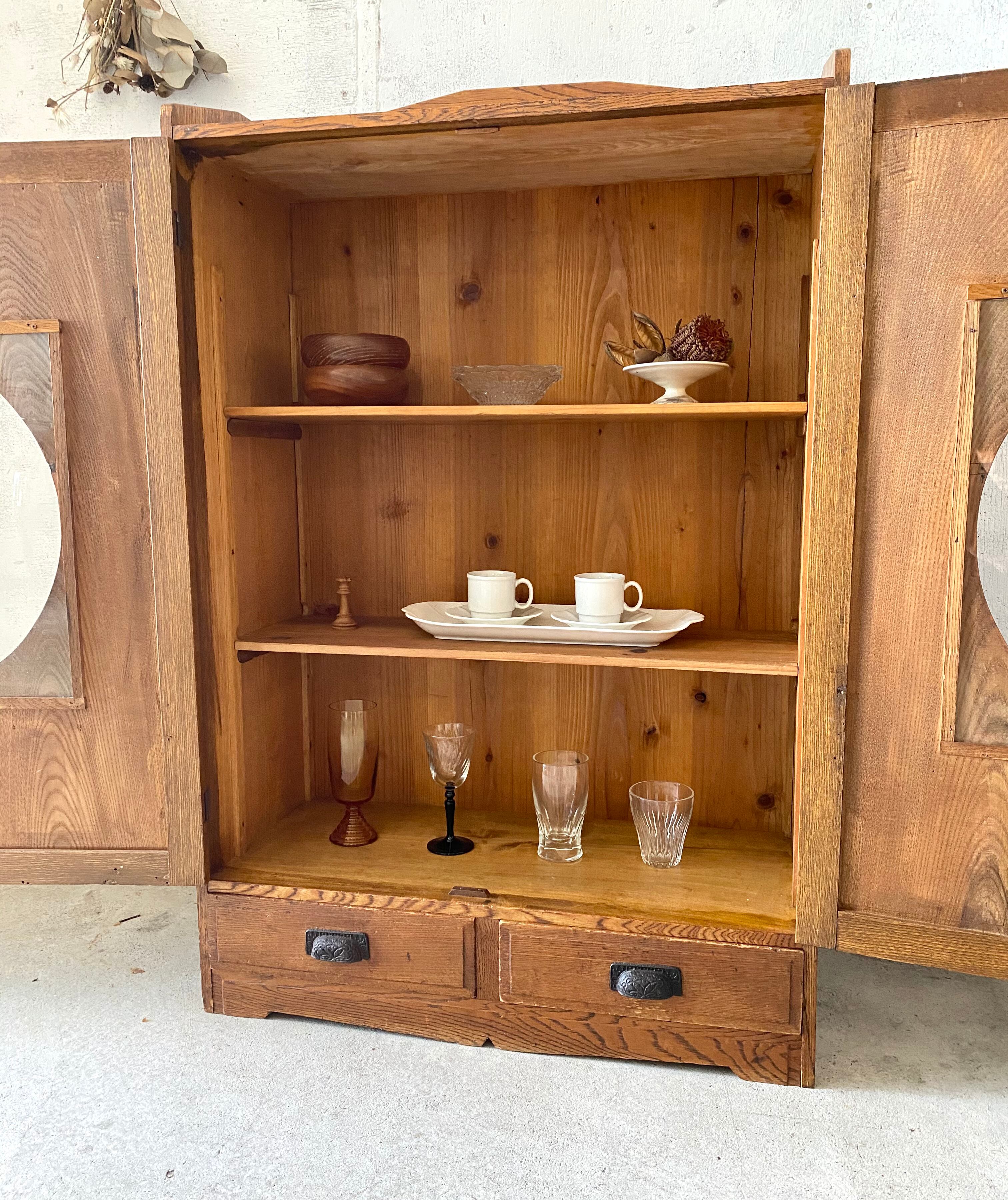 経年変化の雰囲気良い木肌と取手、個性のある姿が感じ良い収納棚。扉戸、引出しの開閉は比較的スムーズに行えます。キッチンで食器の収納棚としてや、アトリエで本や書類、小物の収納としても素敵です。