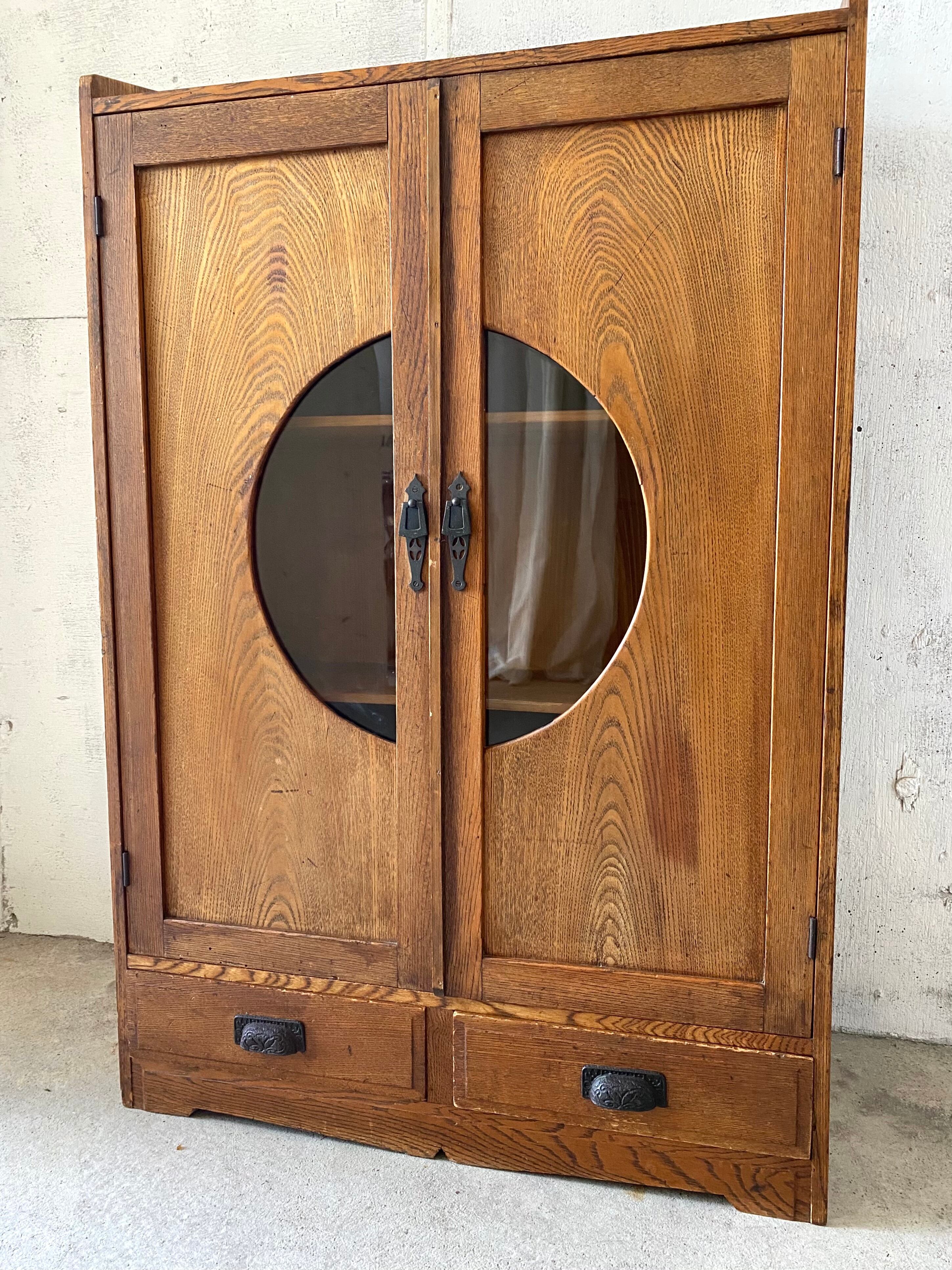 古い収納棚になります.。スレやハゲ、割れ、欠け、隙間、反り、サビ、虫食い、当たりキズ、落としきれない汚れなどがあります。扉戸、引出しの開閉はスムーズに行えます。目立つガラスの割れは特になく、全体的に状態も良いのでまだまだ実用的に活躍してくれます。