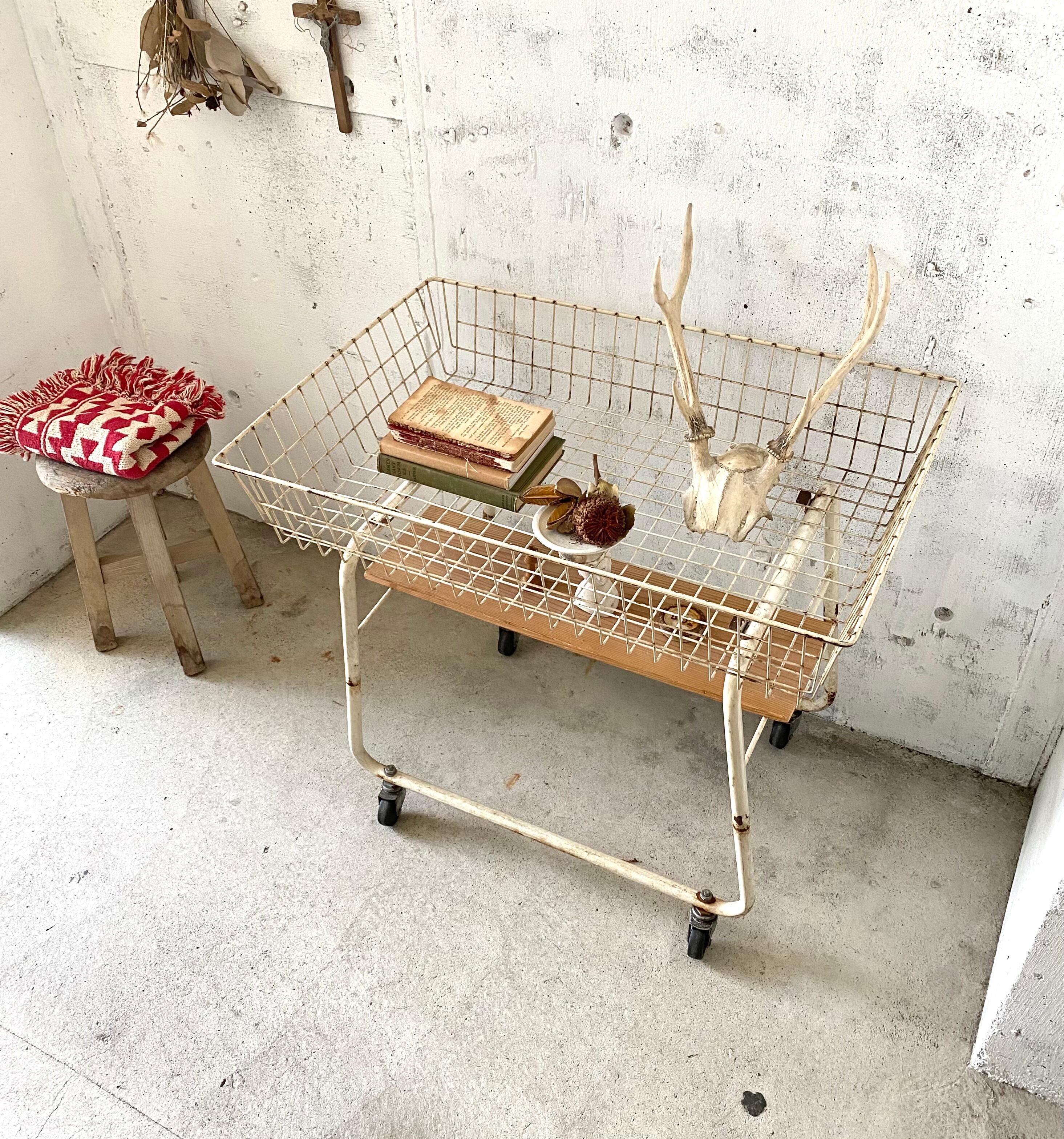 経年変化のシャビーな雰囲気と程良いサビ感が魅力的なワイヤーラック。キャスターは比較的スムーズに動きます。リビングで本や紙物、小物を収納しながらディスプレイしたり、ガーデニングで植物を置くラック、お店の店舗什器としてもオススメの品です。