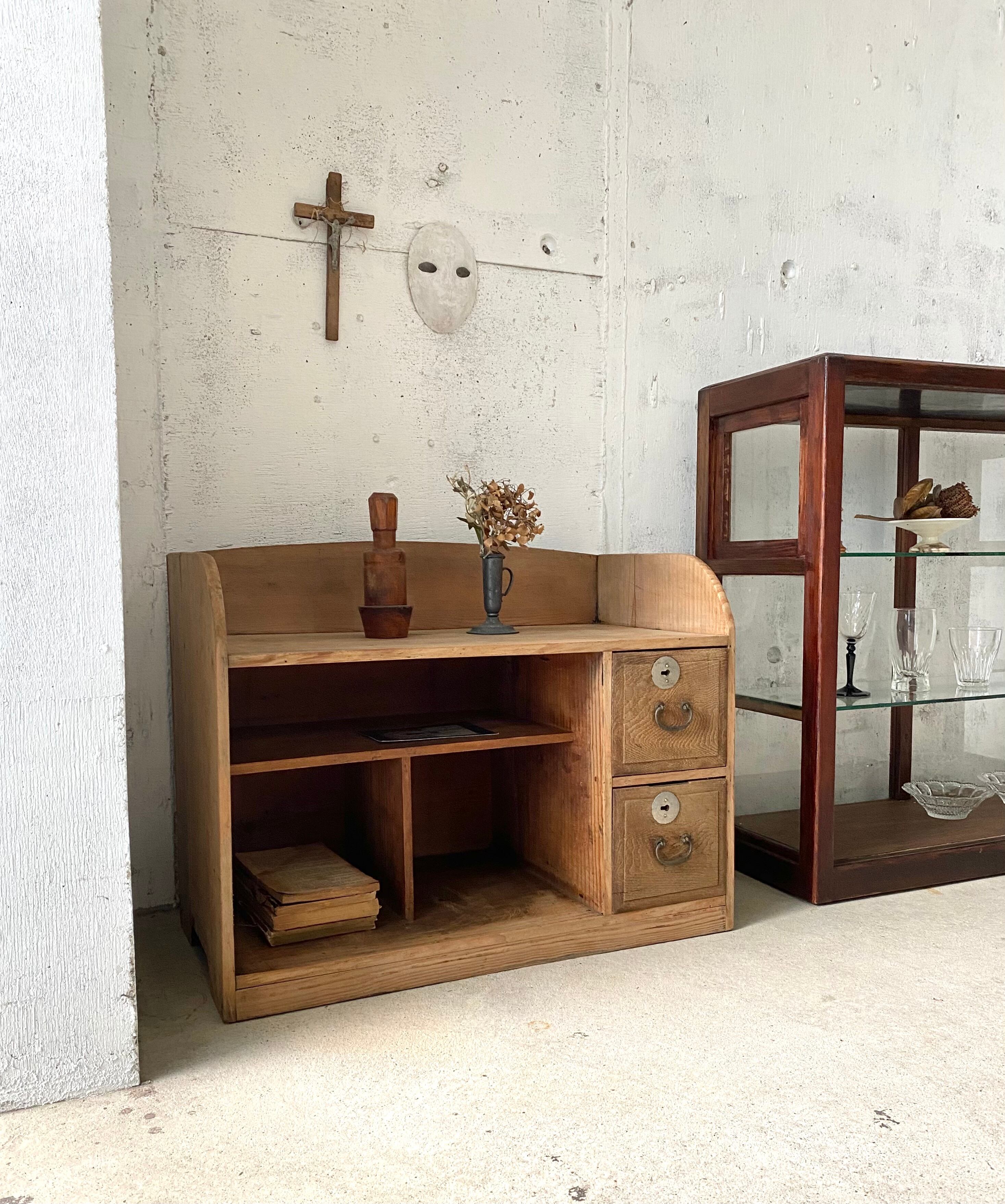 経年変化の古木の風合いが魅力的な収納棚。引出しの開閉は比較的スムーズに行えます。お部屋のカウンターやアトリエ、趣味部屋でお気に入りの本や小物を飾りながら収納しても素敵にお使い頂けそうです。