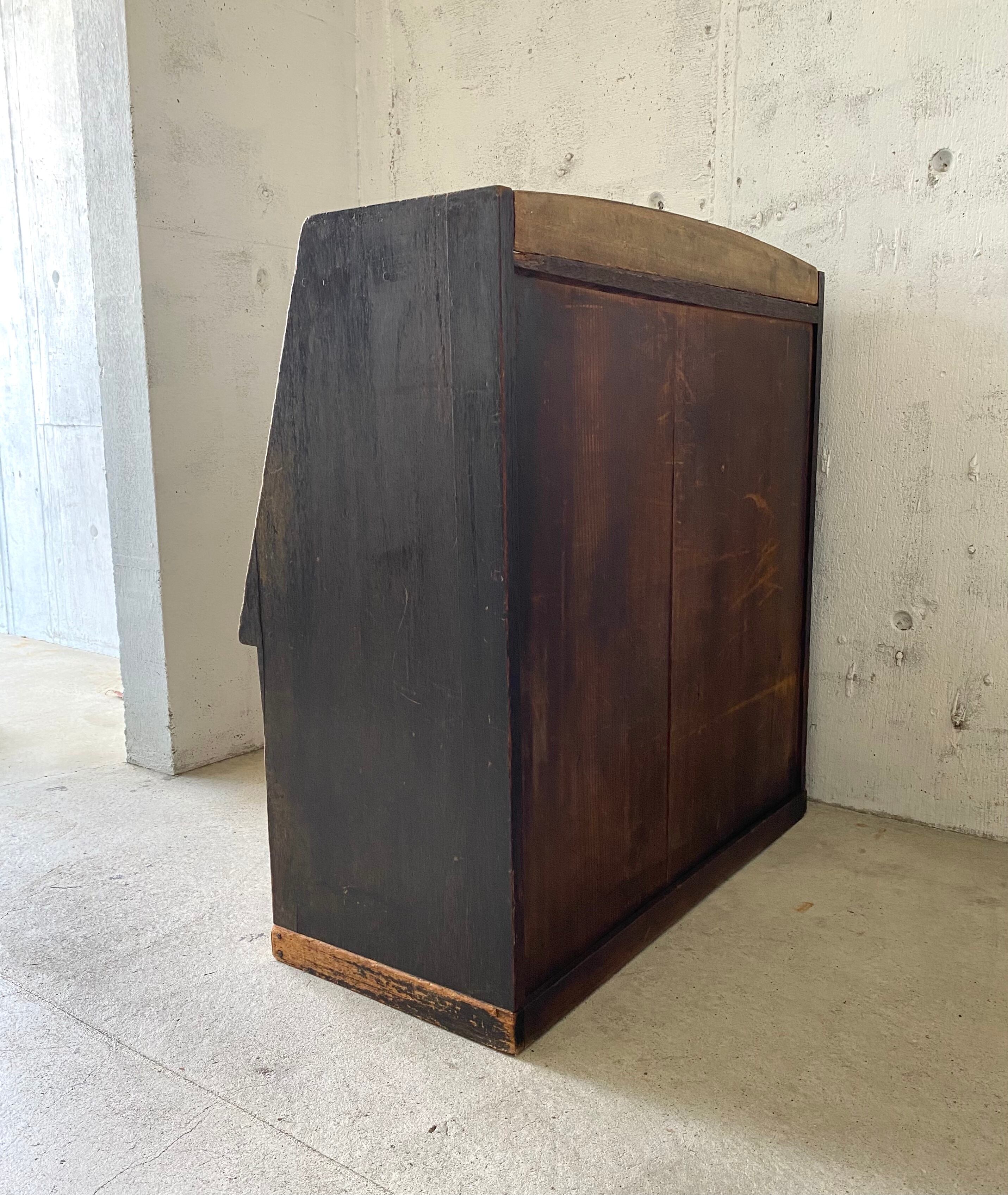 古い収納棚になります。スレや剥げ、当たりキズ、割れ、欠け、引出しの隙間、サビ、落としきれない汚れなどがあります。扉、引戸、引出しの開閉は比較的スムーズに行えます。全体的に状態は良いのでまだまだ実用的にお使いいただけます。