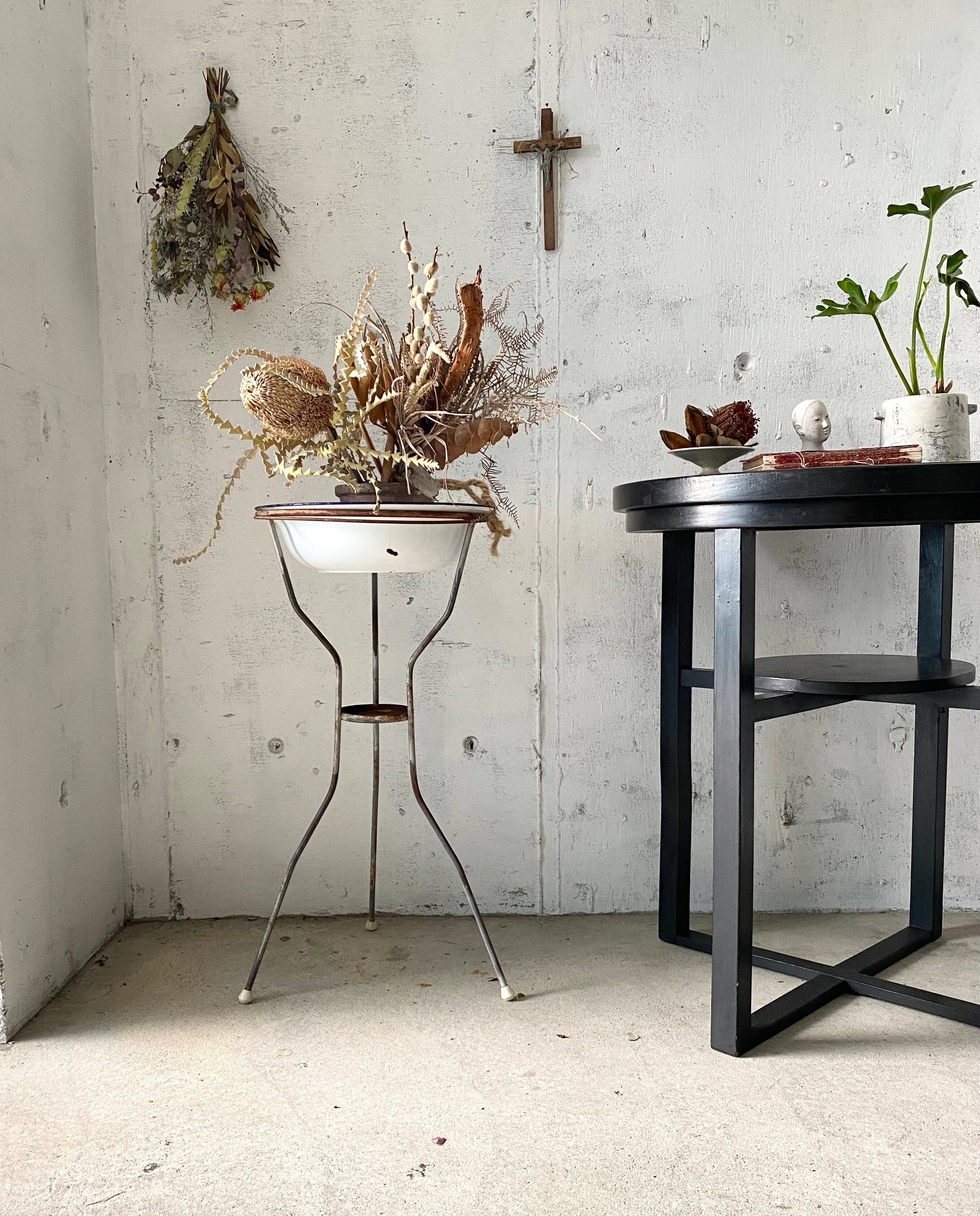 すらっとした綺麗なラインのアイアン脚と程良いサビ感のホーローが雰囲気ある飾り台。ホーロー下にはオープンラックがあるので使い勝手も良いです。ガーデニングで植物を入れて飾ってみたり、お部屋で小物を入れても素敵です。