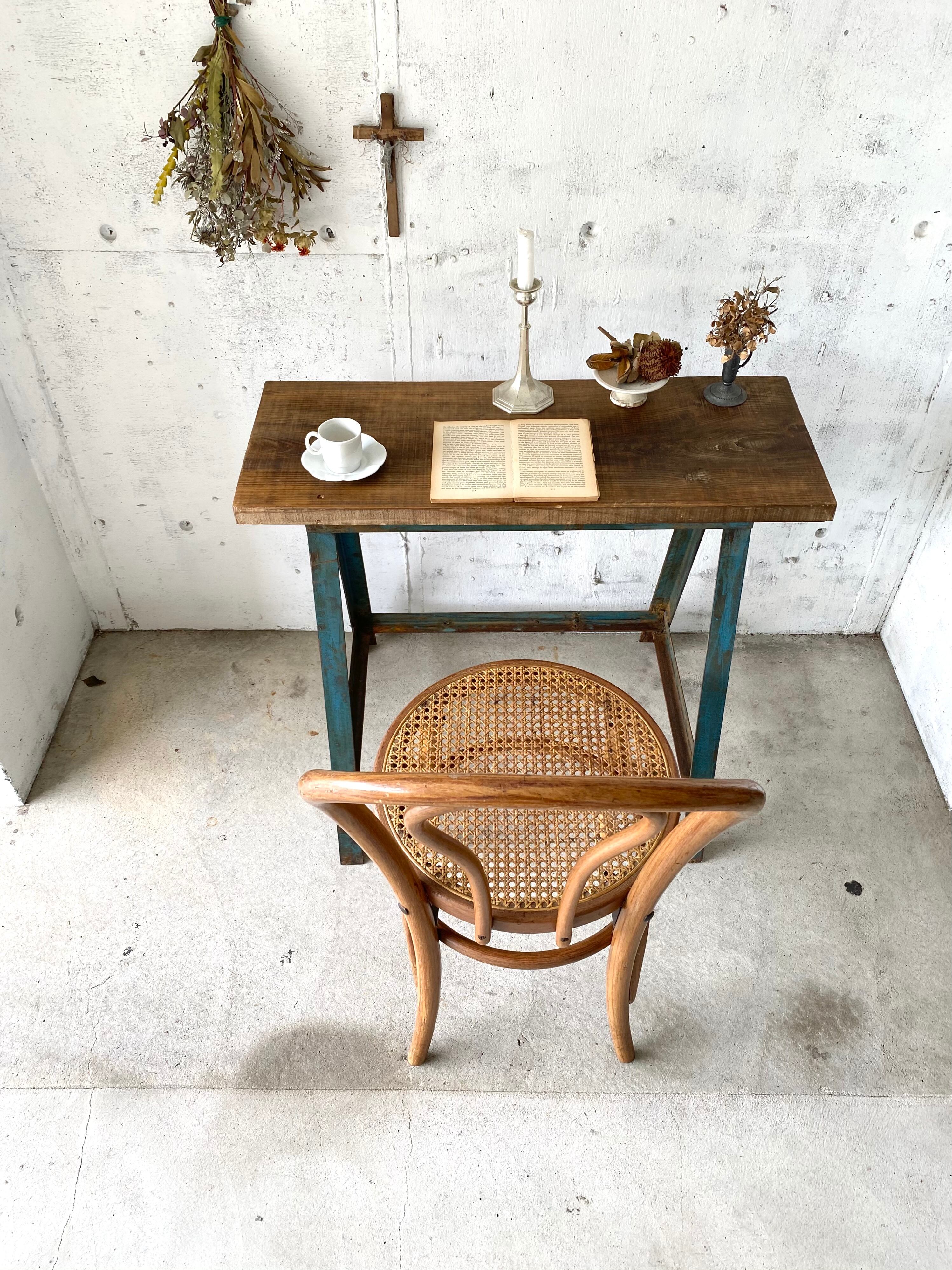 味のある古材の天板と個性のある青いアイアン脚が雰囲気良いテーブル。アトリエで書物をするテーブルとしてや、趣味部屋で読書やお茶をするテーブルとして、ディスプレイ台としてお部屋で小物や植物を飾っても素敵です。