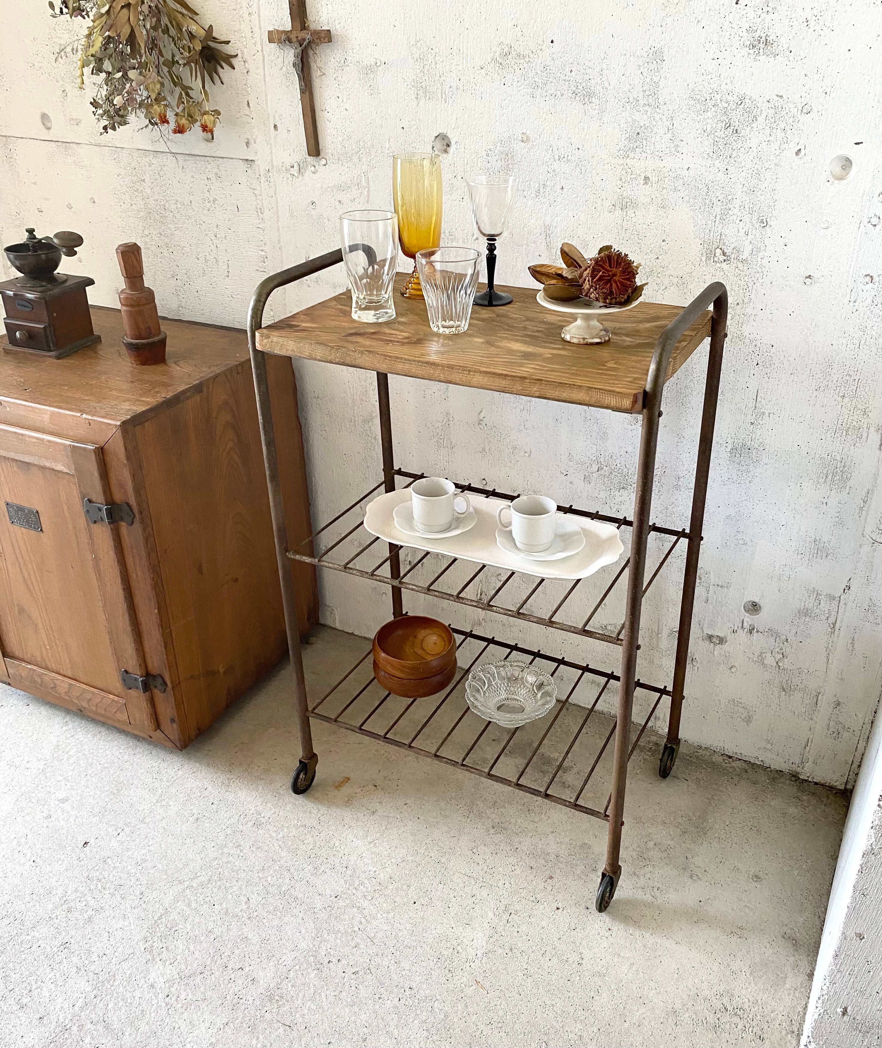 経年変化の雰囲気良い古材と程良いサビ感の脚が感じ良いオープンラック。少しのがたつきはありますが、状態は良いです。キッチンで食器や調味料のストック棚としてや、趣味部屋でお気に入りのコレクションや植物を飾る台としても素敵です。