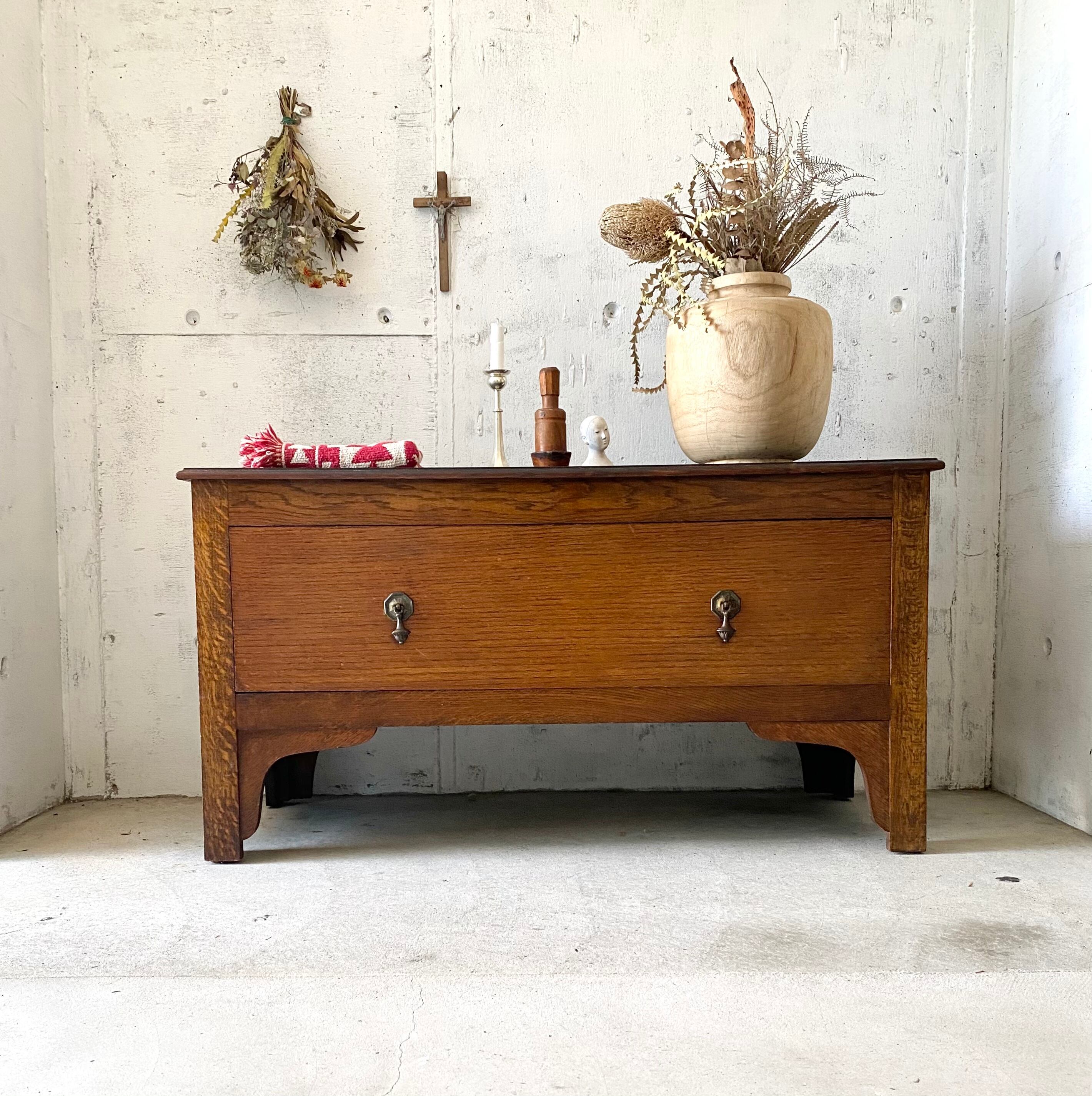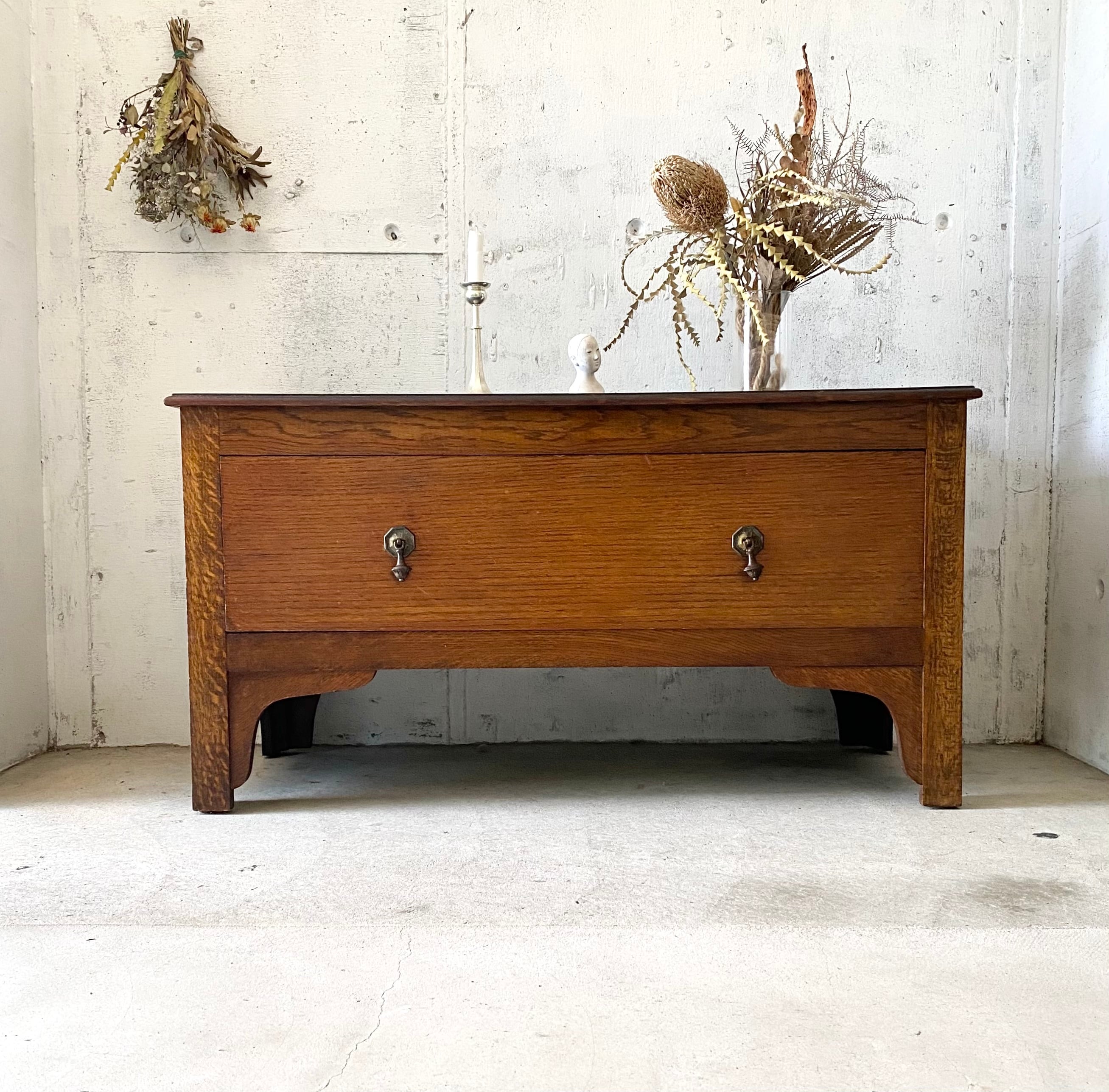 経年変化の雰囲気良い木肌と取手、個性のある姿で上品な佇まいが感じ良いローボード。引出しは深さ、横幅もあり、収納力十分です。テレビボードとしてや、洋服の収納棚、お子さんのおもちゃ入れなどとしても素敵です。