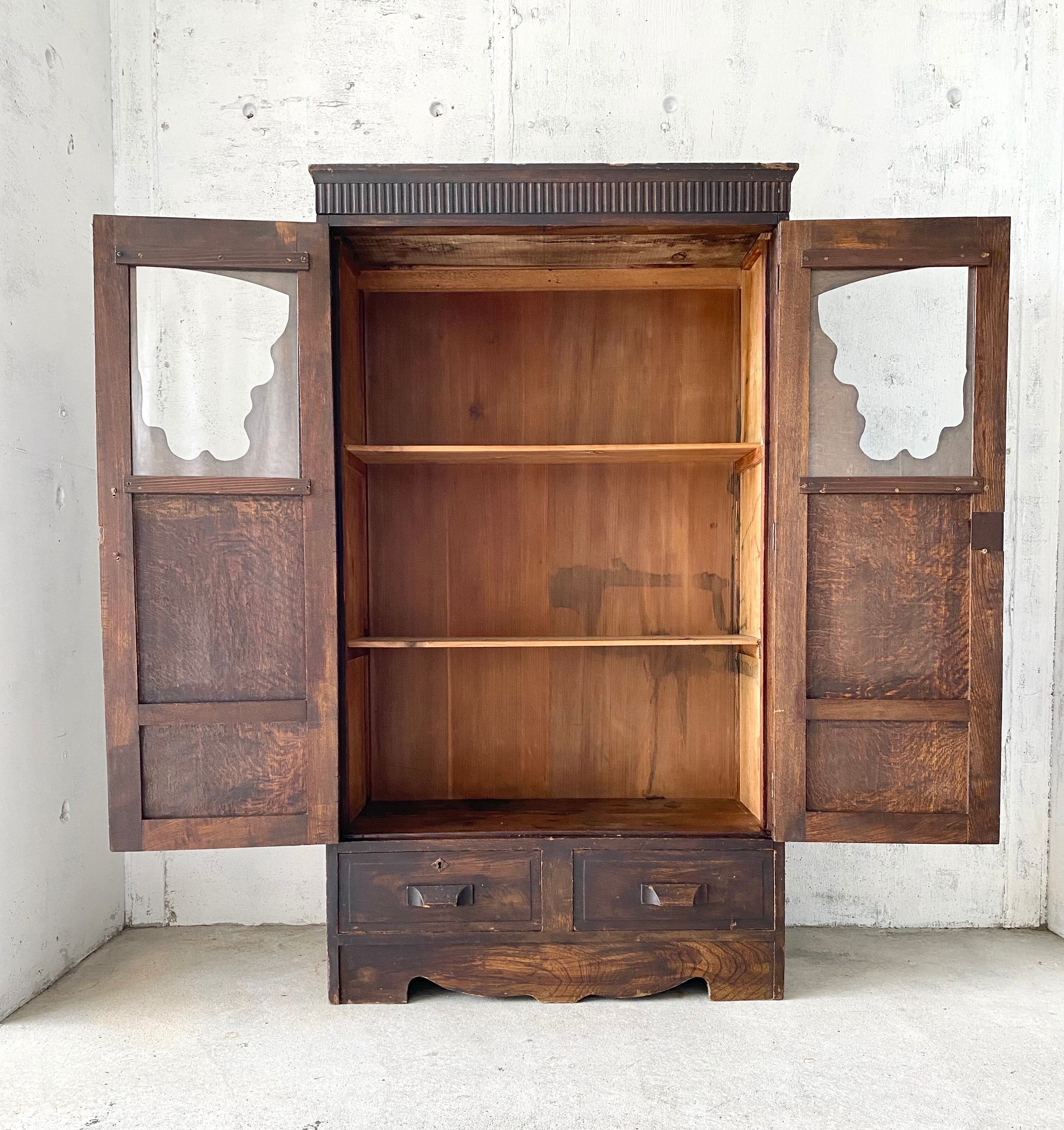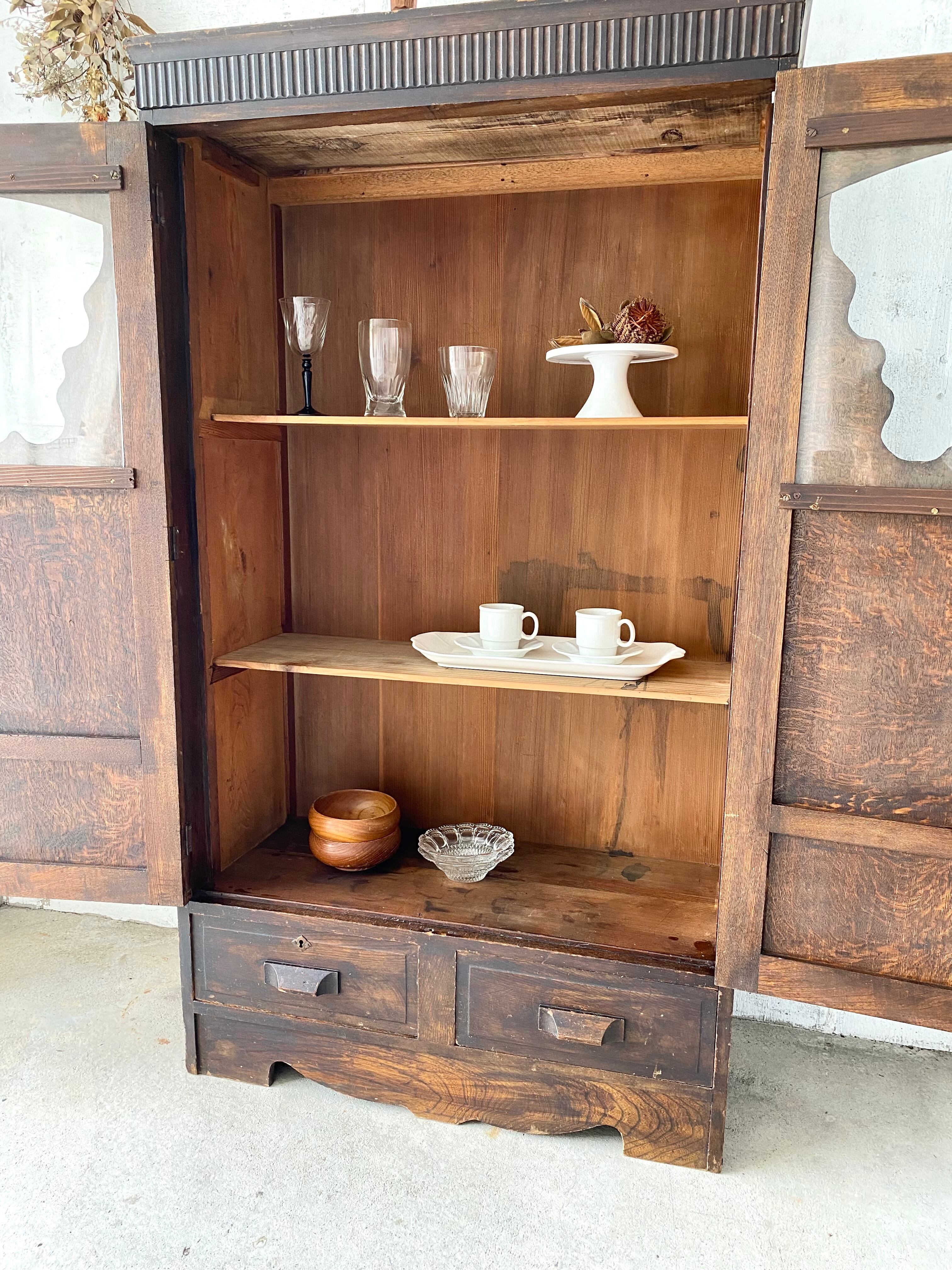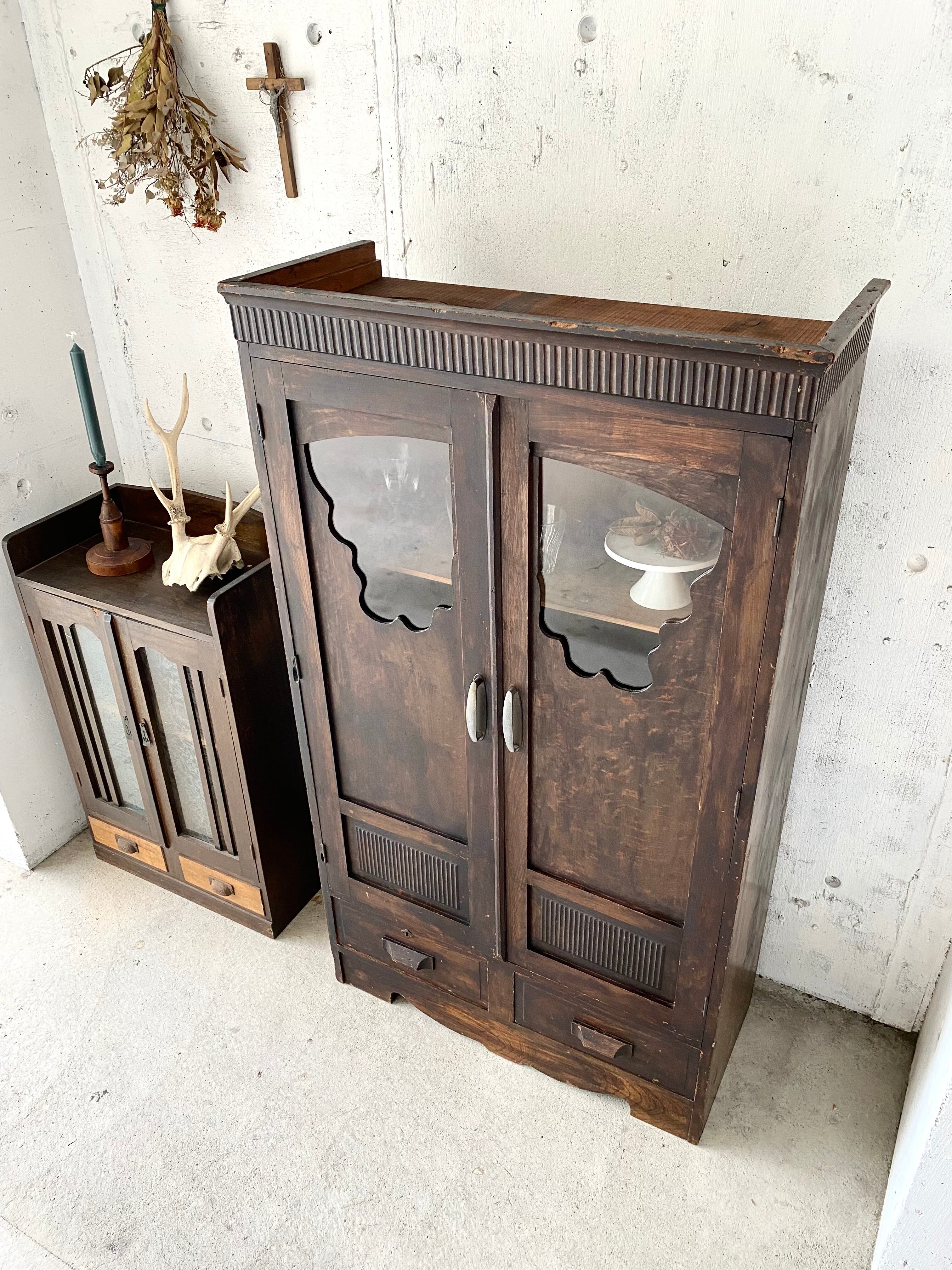 古いキャビネットになります。スレや欠け、当たりキズ、割れ、反り、サビ、隙間、虫食い、落としきれない汚れなどがあります。ガラス扉、引出しの開閉は比較的スムーズに行えます。特にガラスの割れもなく、全体的に状態も良いのでまだまだ実用的に活躍してくれます。