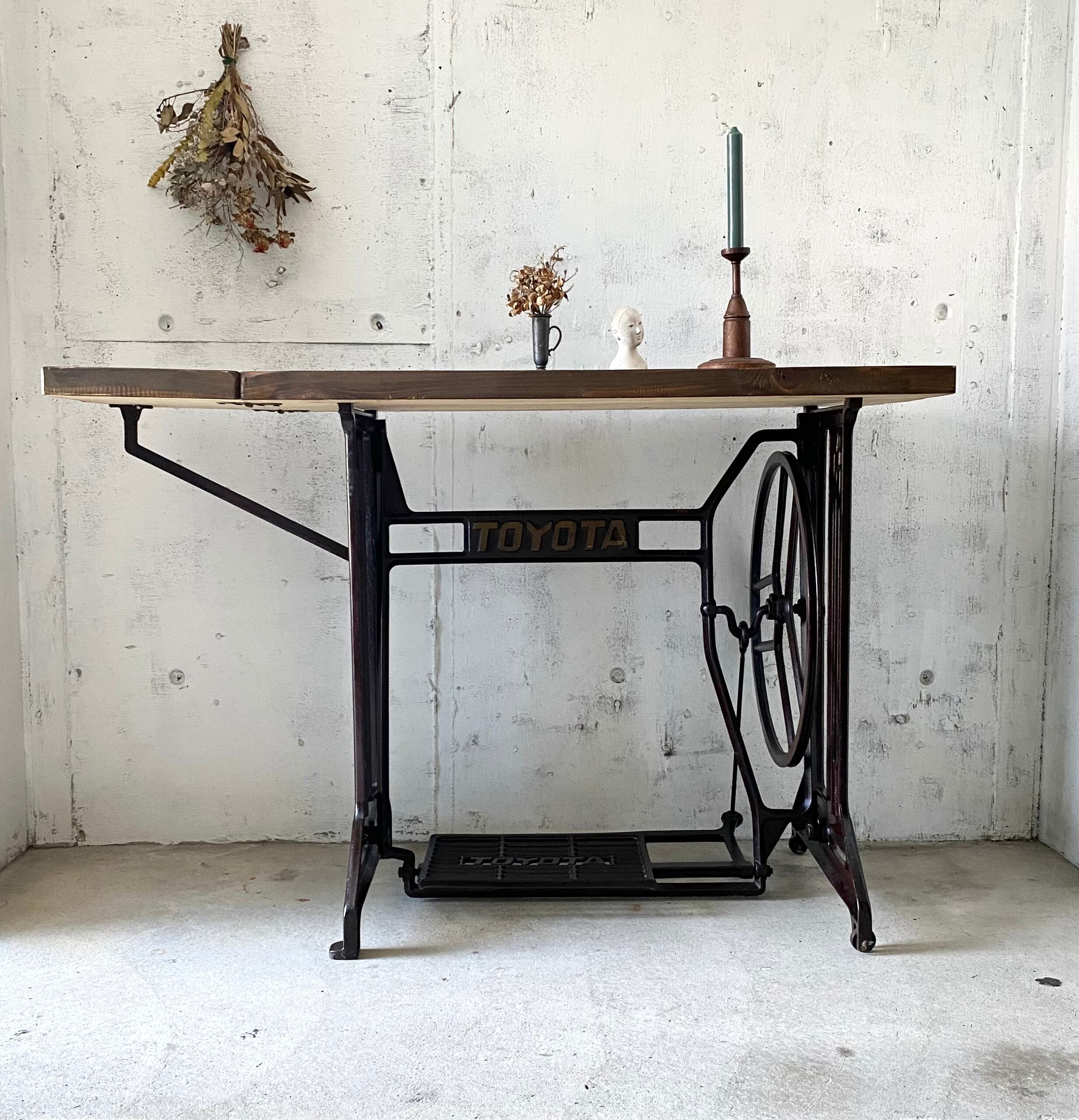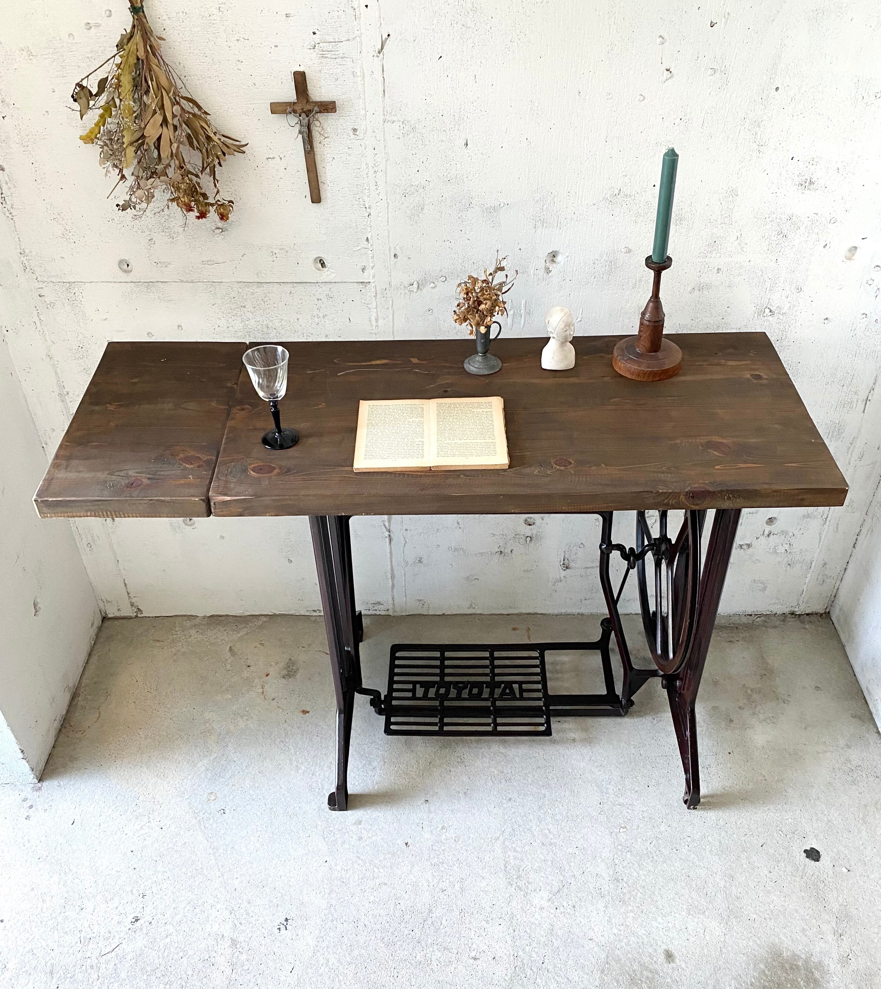 雰囲気の良い木板と古いミシン脚が良く馴染んだテーブル。天板は折り畳み式になっていて幅の調整が出来て、使い勝手も良いです。お部屋でお気に入りの植物や小物を飾るディスプレイ台としてや、日常の作業をするのに程よいサイズ感がオススメです。味のあるテーブルひとつプラスするだけで雰囲気あるお部屋作りが叶いそうです。