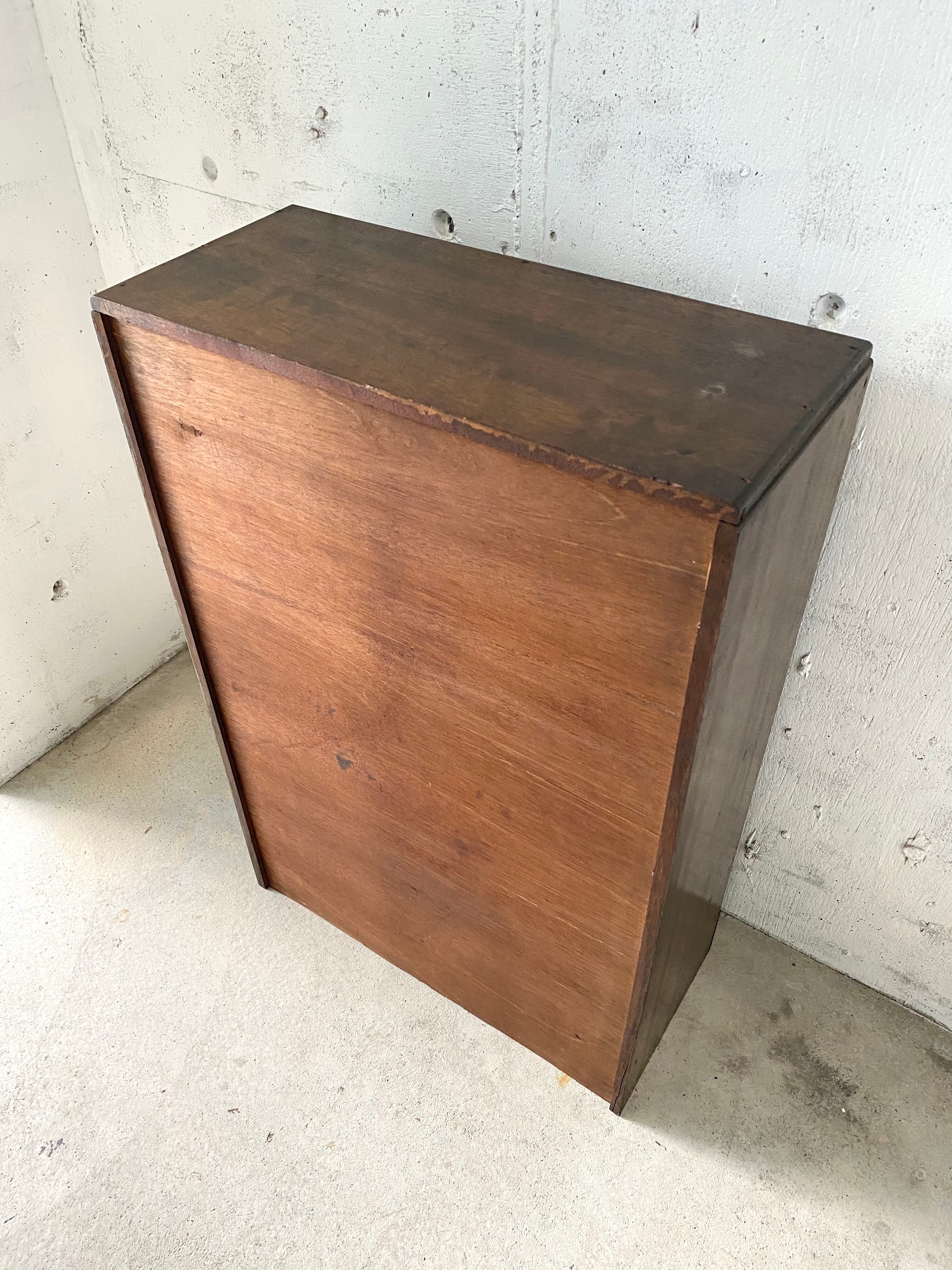 古い収納棚になります。スレや欠け、当たりキズ、割れ、禿げ、隙間、落としきれない汚れなどがあります。少しのがたつきはありますが、扉戸、引出しの開閉は比較的スムーズに行えます。全体的に状態も良いのでまだまだ実用的に活躍してくれます。