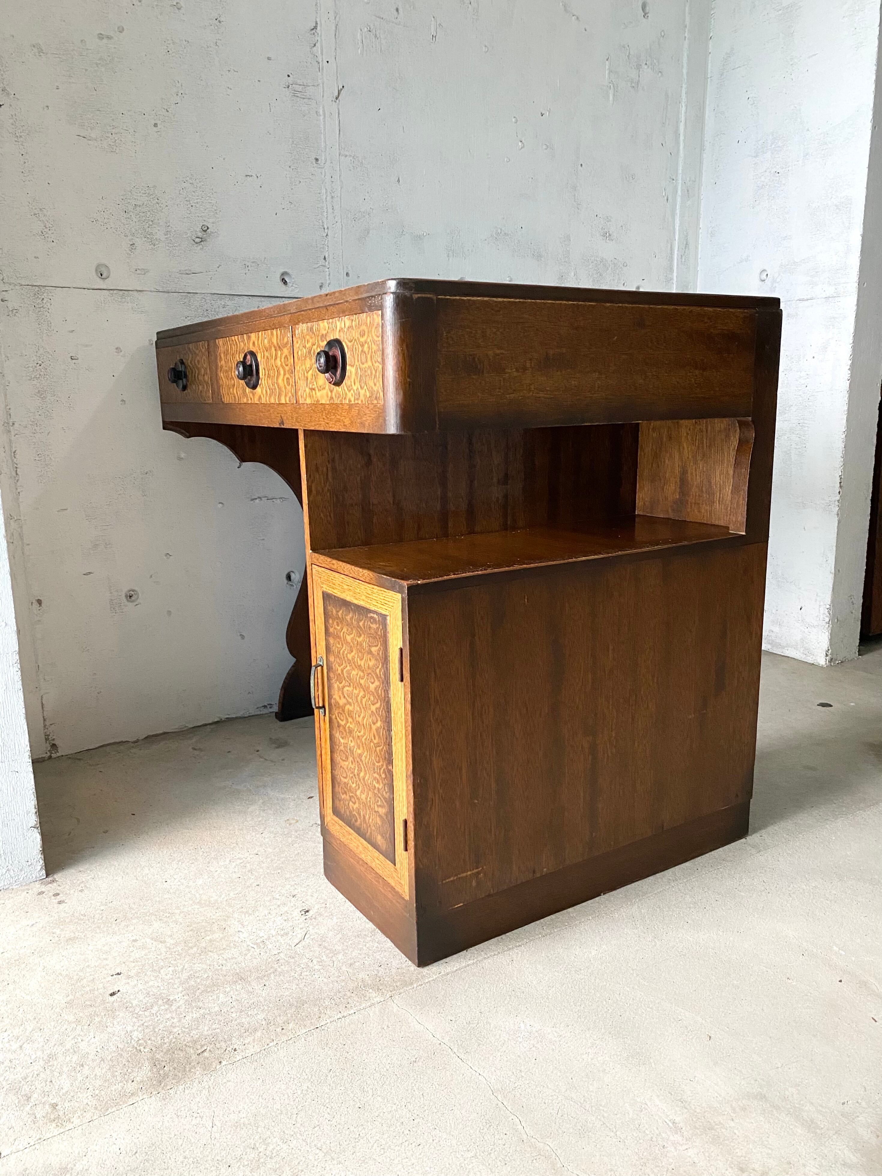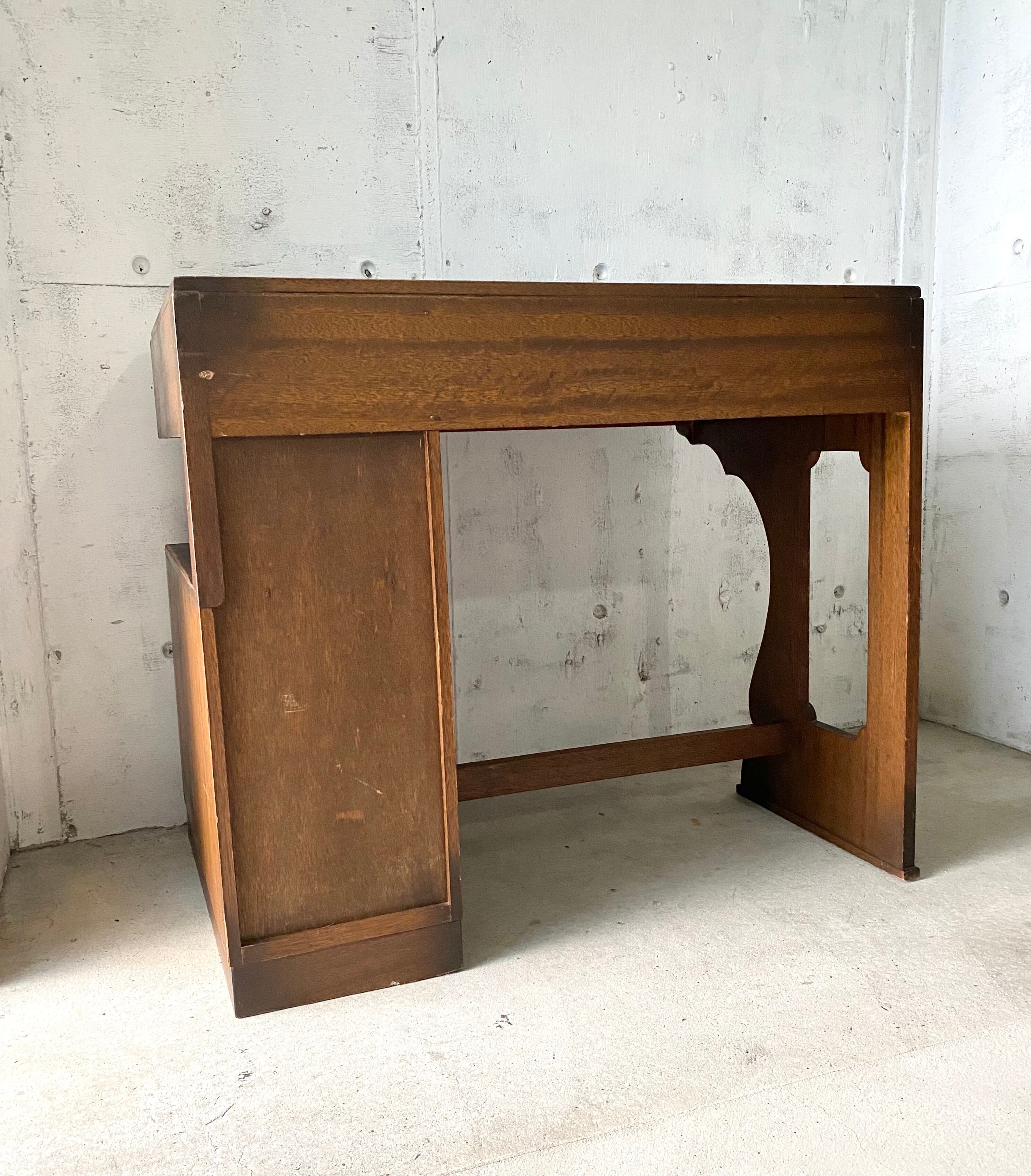 経年変化の雰囲気良い木肌、個性的な姿が感じ良い木製デスク。引出し、扉戸の開閉は比較的スムーズに行えます。作業スペースの机としてや、お子さんの勉強机としても素敵にお使い頂けそうです。
