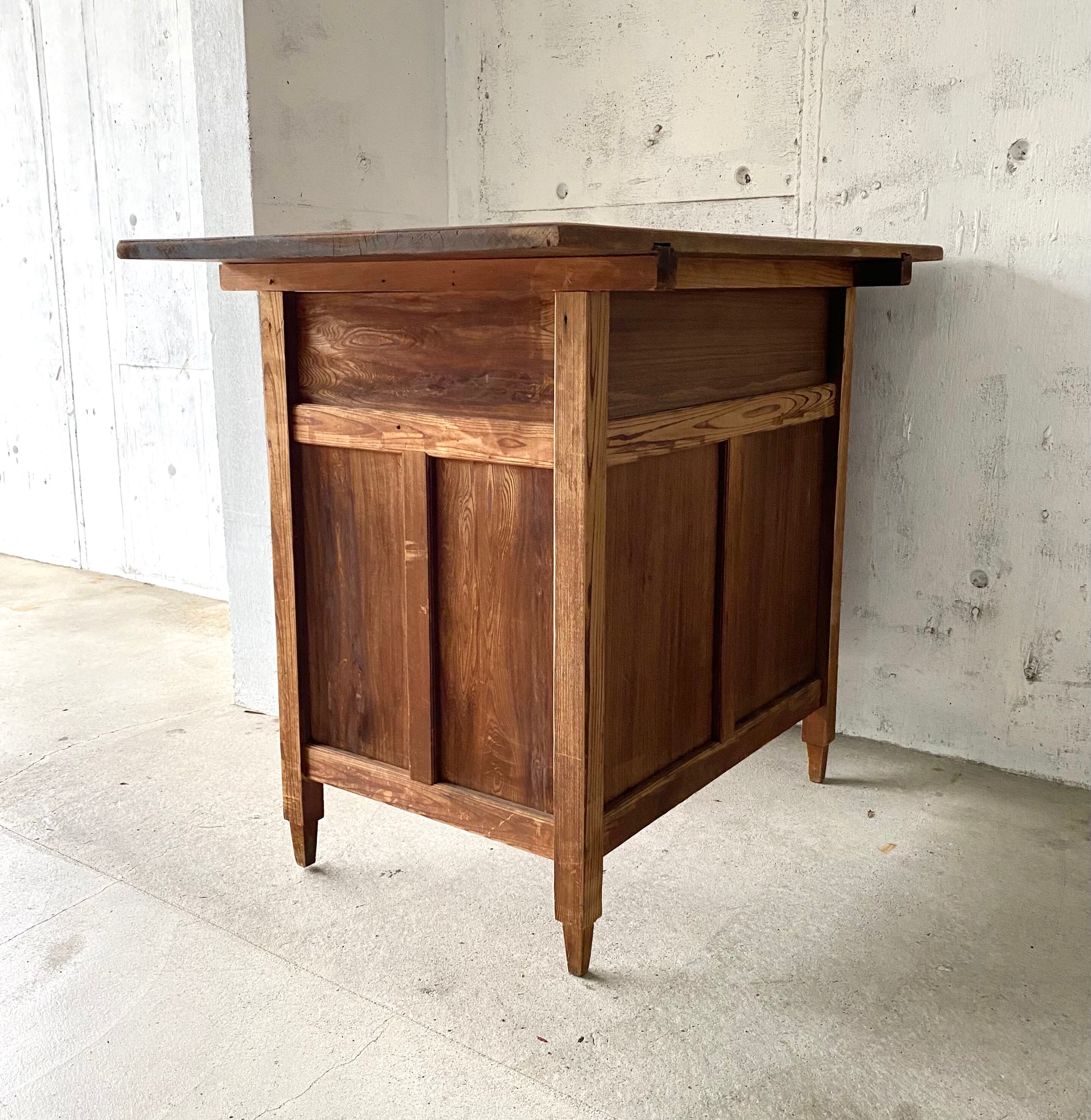 古い木製デスクになります。スレや欠け、当たりキズ、割れ、禿げ、反り、サビ、隙間、落としきれない汚れなどがあります。少しがたつきはありますが、引出しの開閉は比較的にスムーズに行えます。全体的に状態も良いのでまだまだ実用的に活躍してくれます。