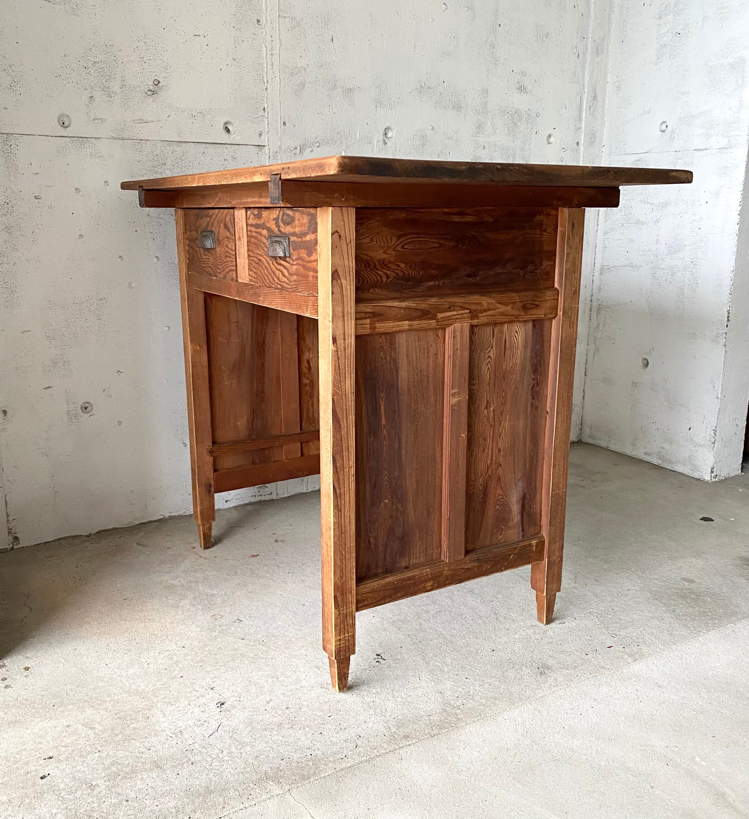 経年変化の味のある木肌と取手、すっきりとした姿が雰囲気良い木製デスク。少しのがたつきはありますが、状態は良いです。作業場でパソコン作業や書物をするデスクとしてや、お子さんの勉強机としても素敵です。
