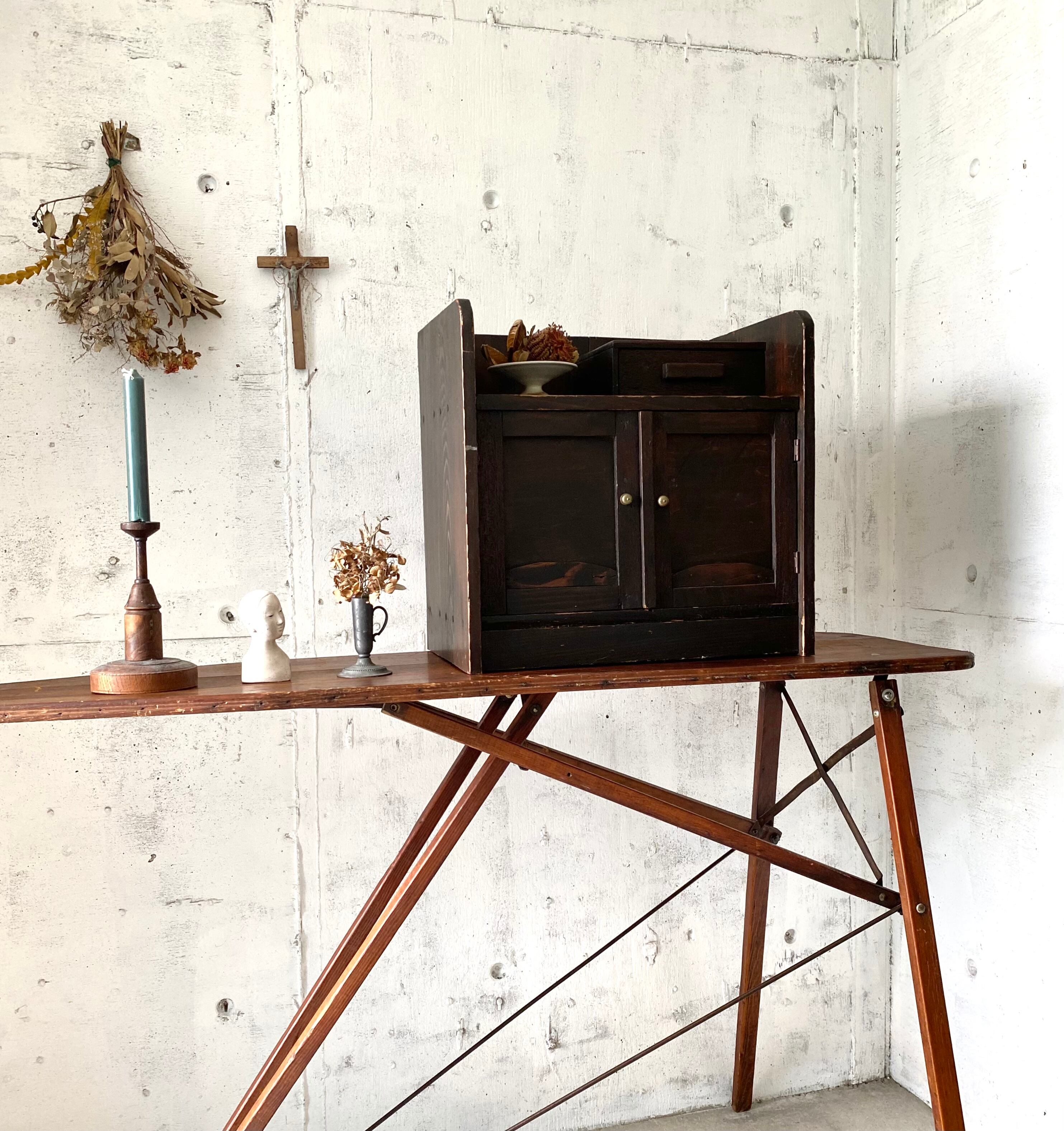 経年変化の深みのある木肌と取手、個性のある姿が感じ良い収納棚。扉戸、引出しの開閉は比較的スムーズに行えます。お部屋の卓上や棚上、カウンター上に置いて細々した物の収納棚としても素敵です。