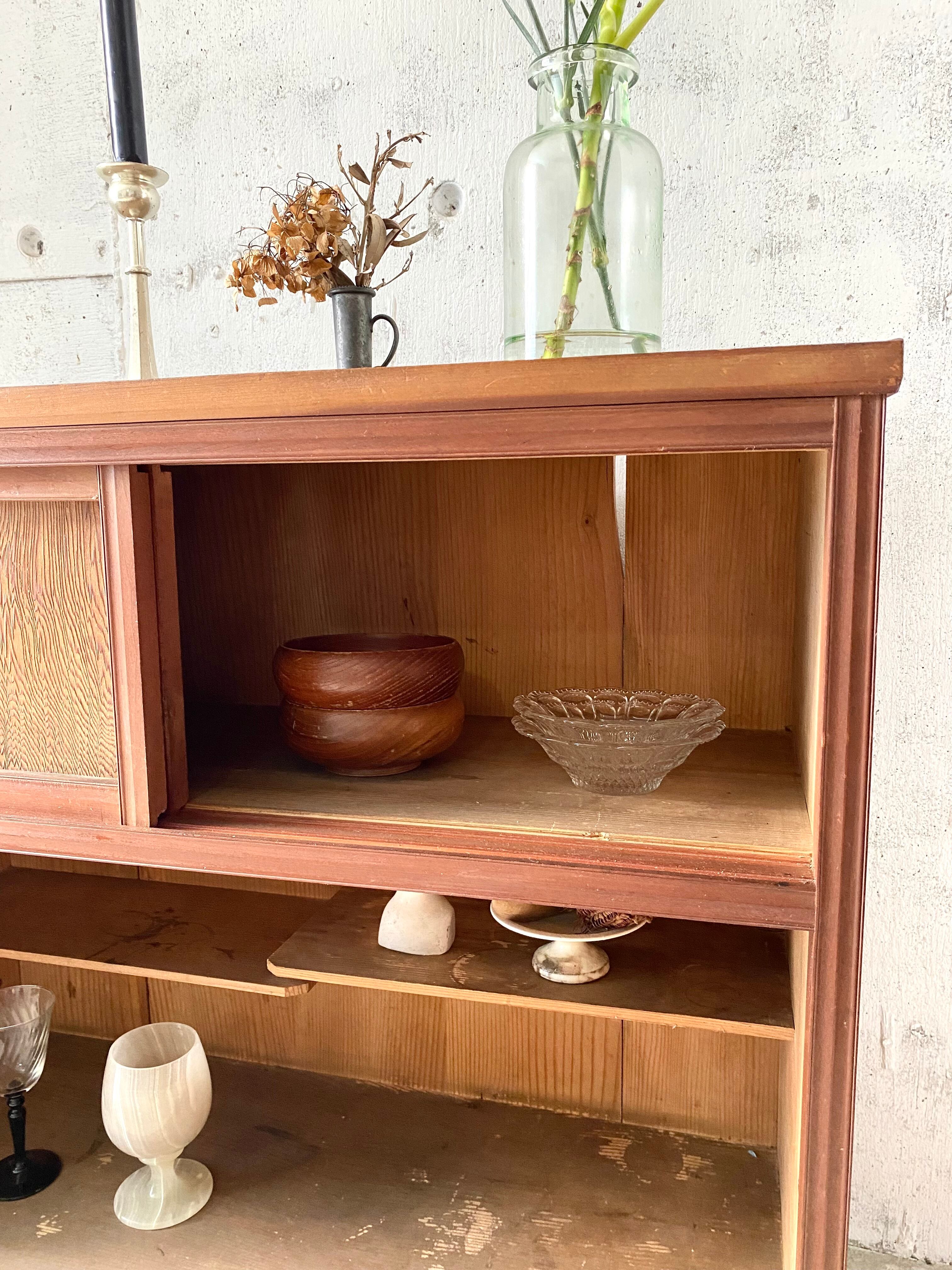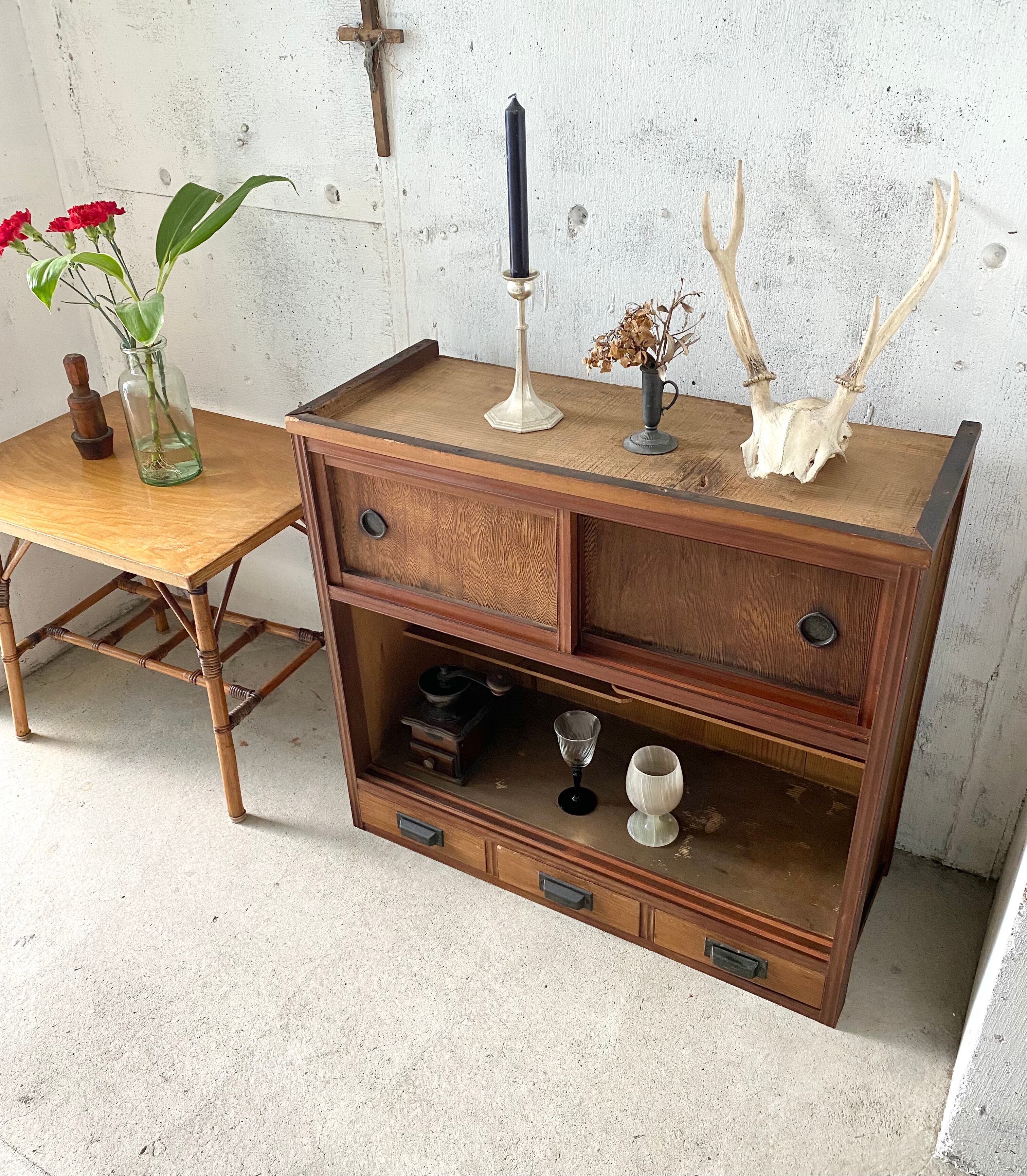 経年変化の雰囲気良い木肌と取手、レトロな佇まいが感じ良い収納棚。引戸、引出しの開閉はスムーズに行えます。リビングや趣味部屋で本や小物の収納としてや、キッチンで食器や調味料の収納としても素敵にお使い頂けそうです。