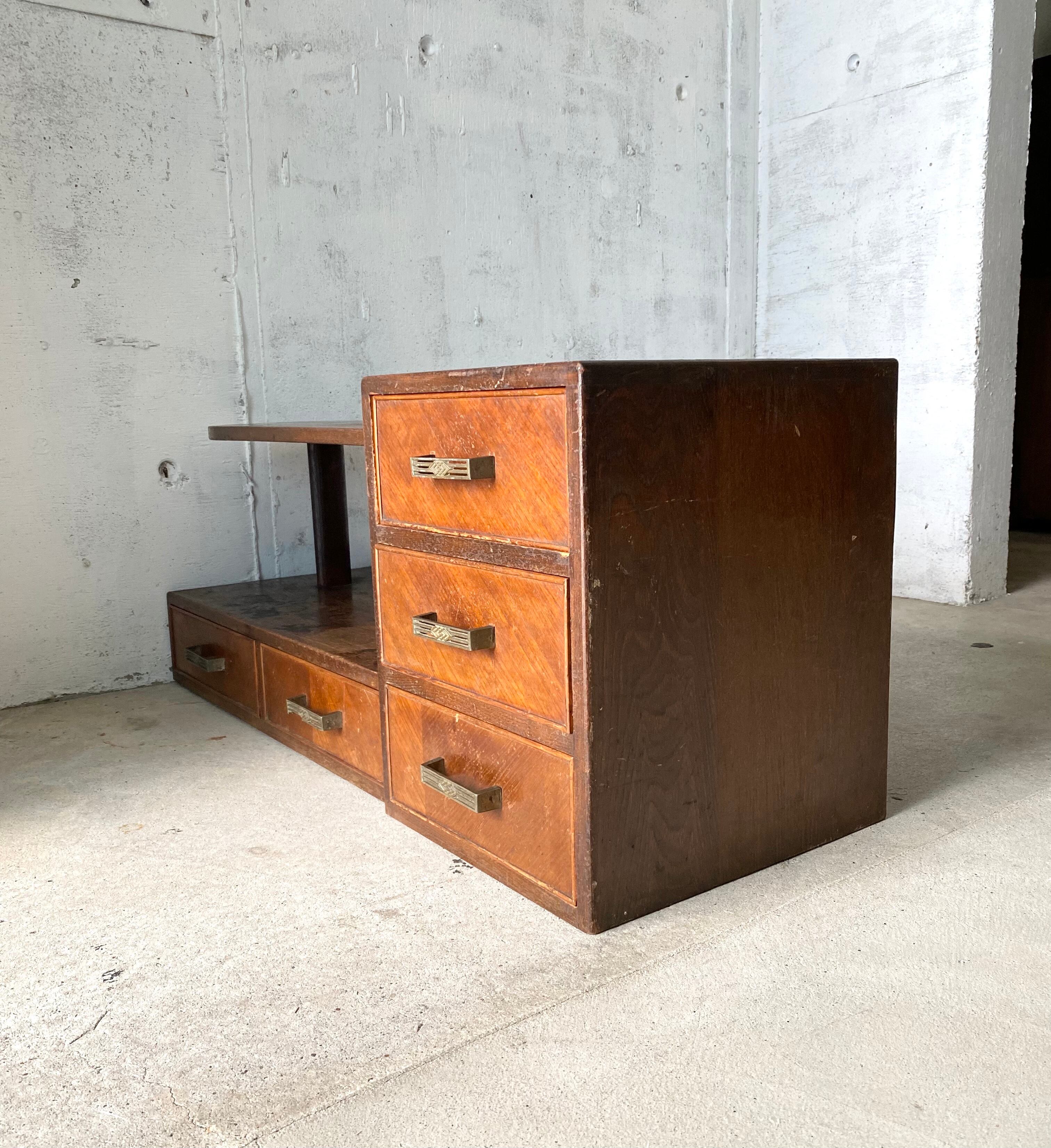 使い込まれた雰囲気の良い木肌と取手、個性のある姿が感じ良い収納棚。引出しの開閉は比較的スムーズに行えます。リビングや作業部屋で小物、紙物、ポストカードなどの収納としても素敵です。